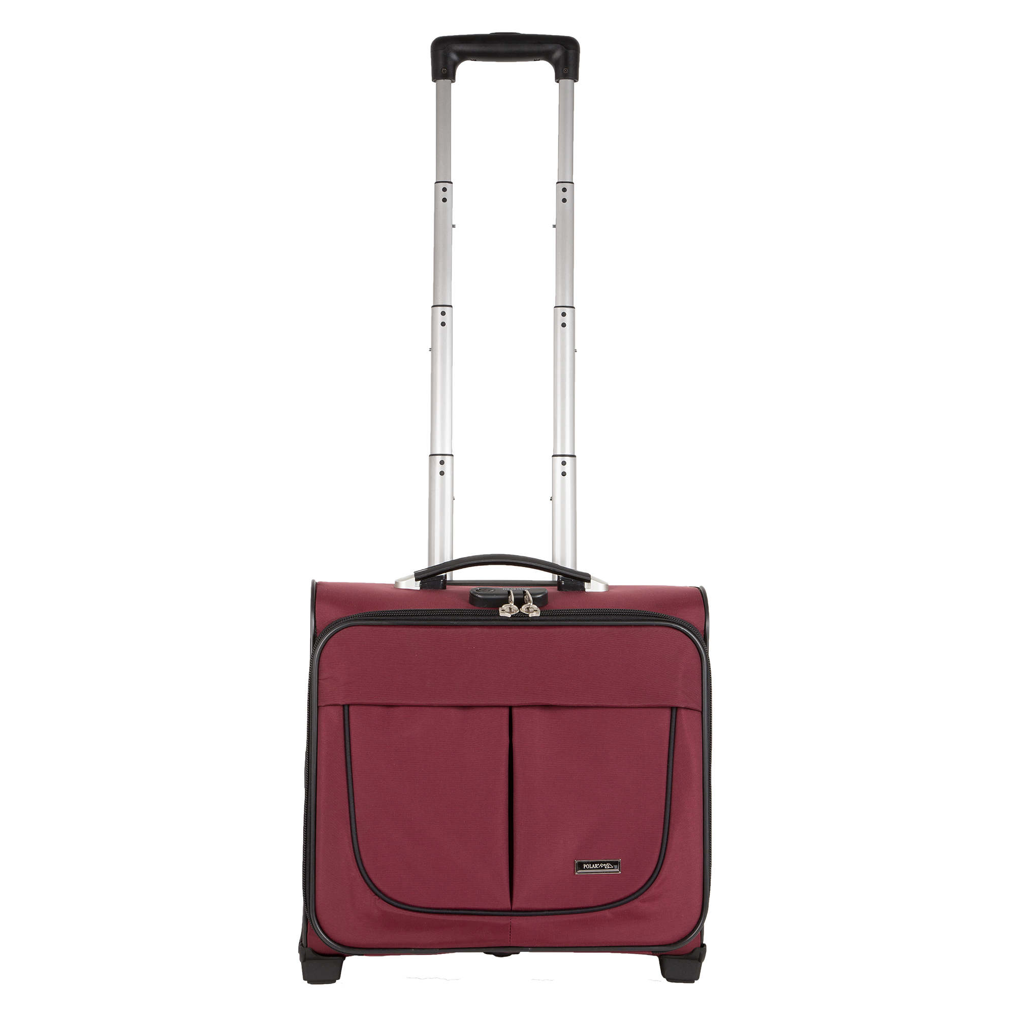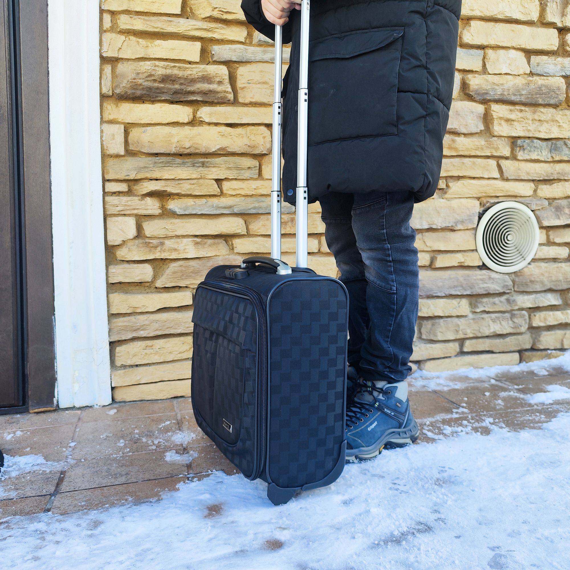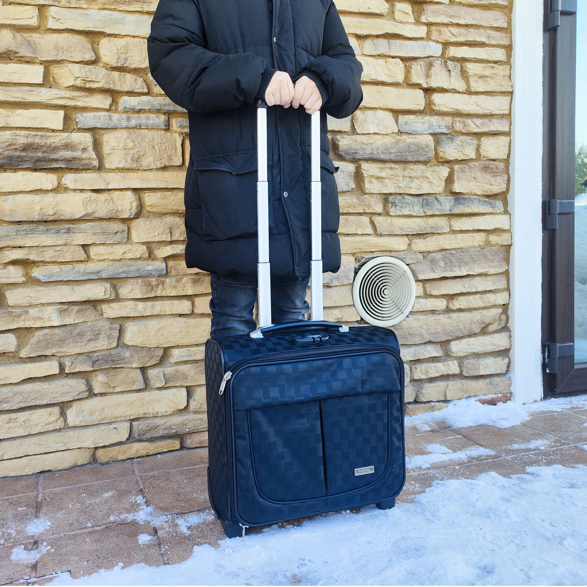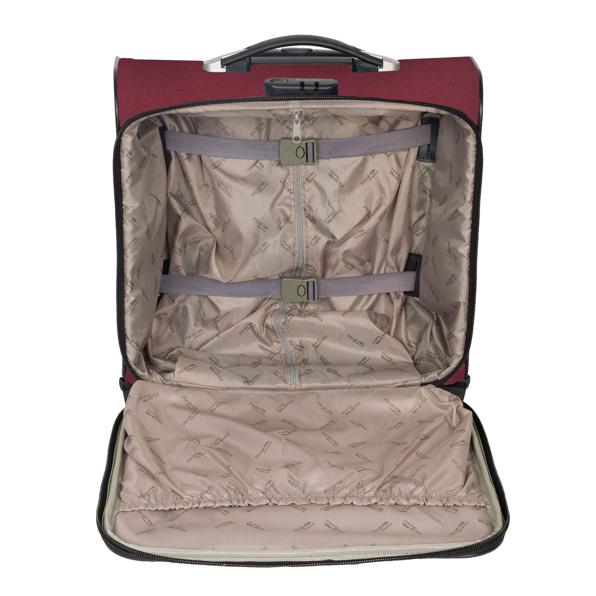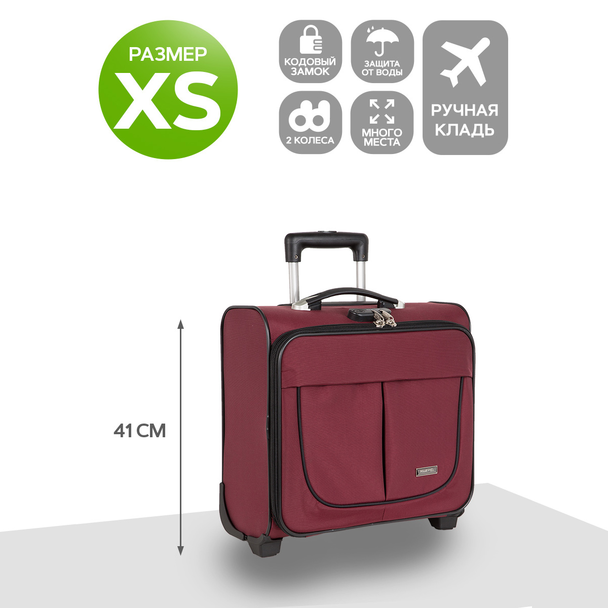 Чемодан от компании "Polar" на двух колёсах выполнен из прочного материала (нейлона и полиэстера). Подходит как ручная кладь. Чемодан закрывается на молнию, присутствует также встроенный кодовый замок.Внутри есть одно большое отделение , в котором присутствуют ремни для фиксации вещей, отделение для ноутбука и маленький карман на молнии для документов. Снаружи расположен объёмный карман на молнии для мелких вещей. У чемодана есть небольшая ручка для переноски и металлическая ручка, которая выдвигается на 67 см.