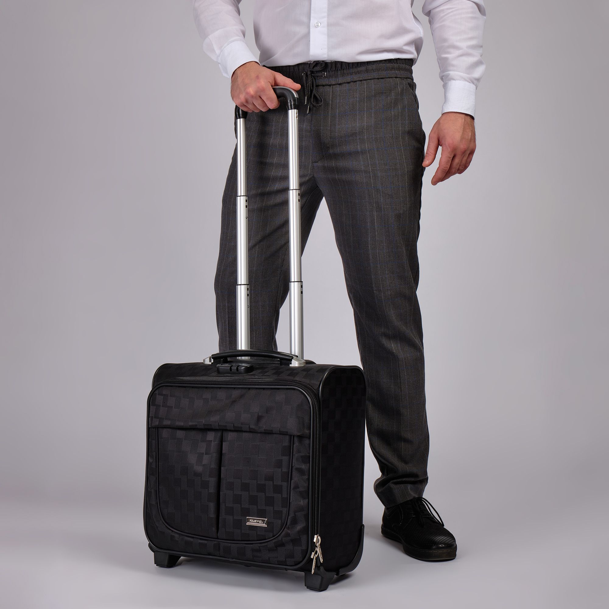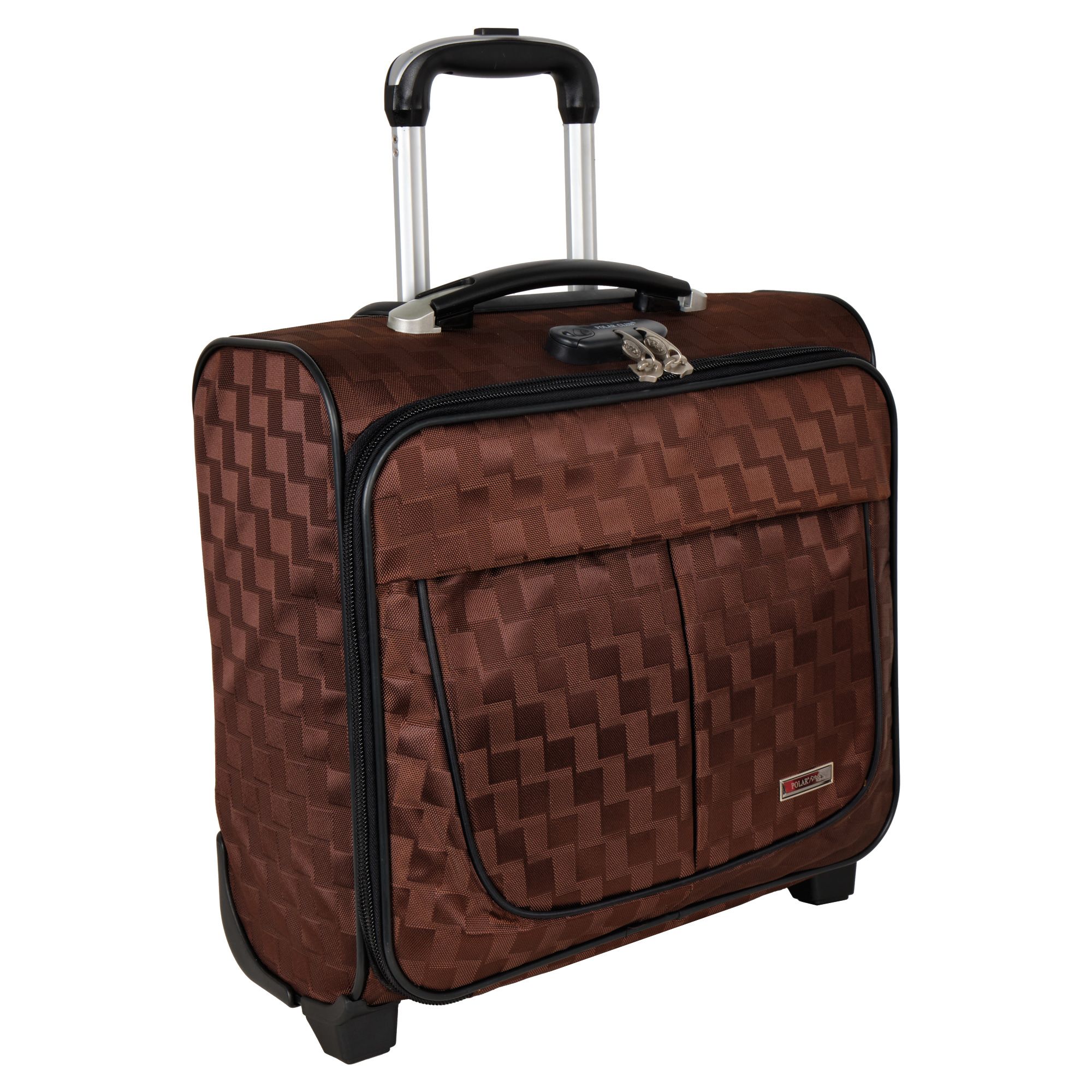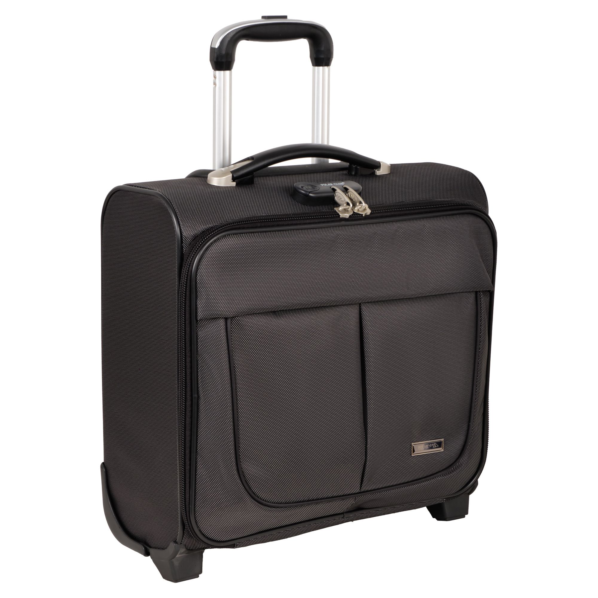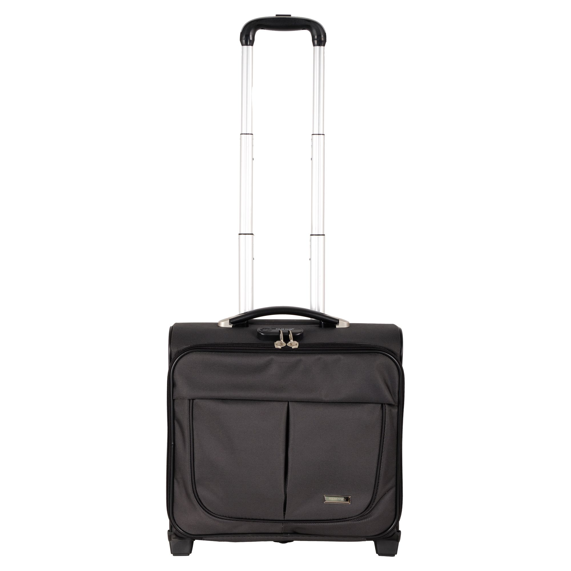 Чемодан от компании "Polar" на двух колёсах выполнен из прочного материала (нейлона и полиэстера). Подходит как ручная кладь. Чемодан закрывается на молнию, присутствует также встроенный кодовый замок.Внутри есть одно большое отделение , в котором присутствуют ремни для фиксации вещей, отделение для ноутбука и маленький карман на молнии для документов. Снаружи расположен объёмный карман на молнии для мелких вещей. У чемодана есть небольшая ручка для переноски и металлическая ручка, которая выдвигается на 67 см..