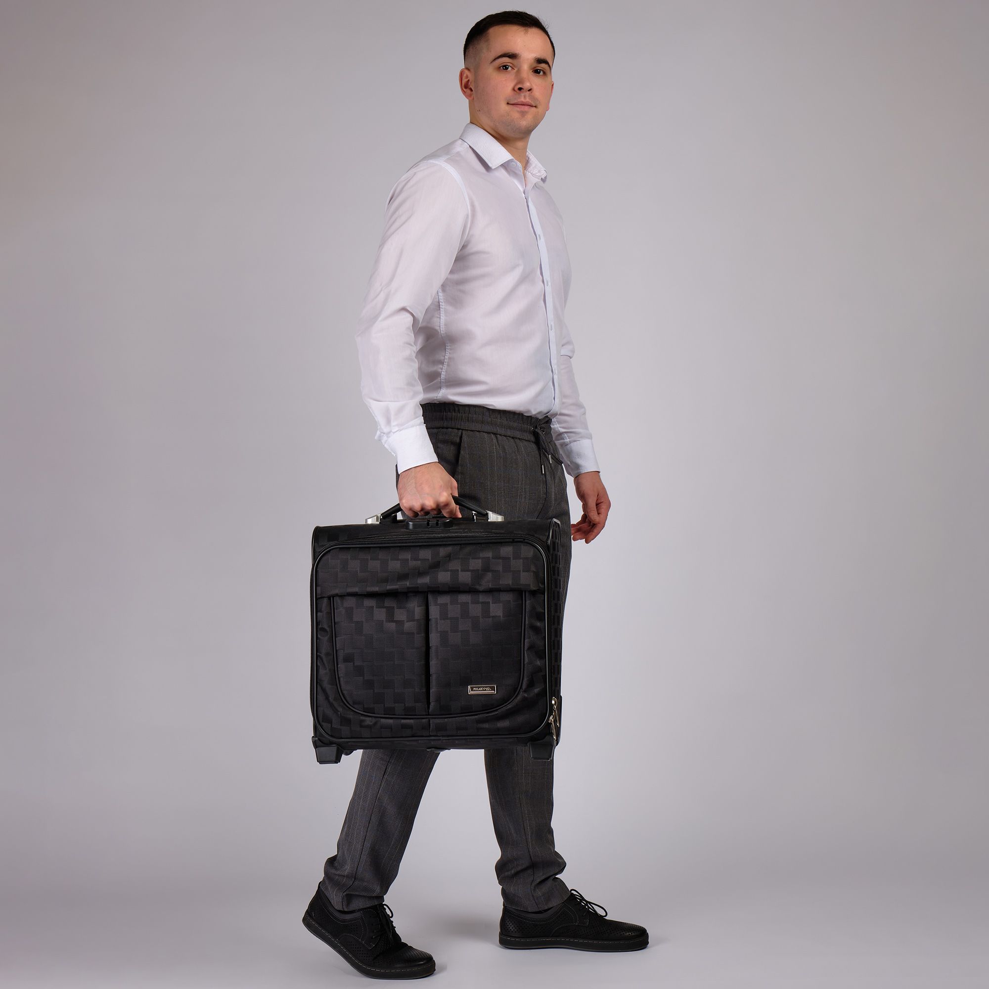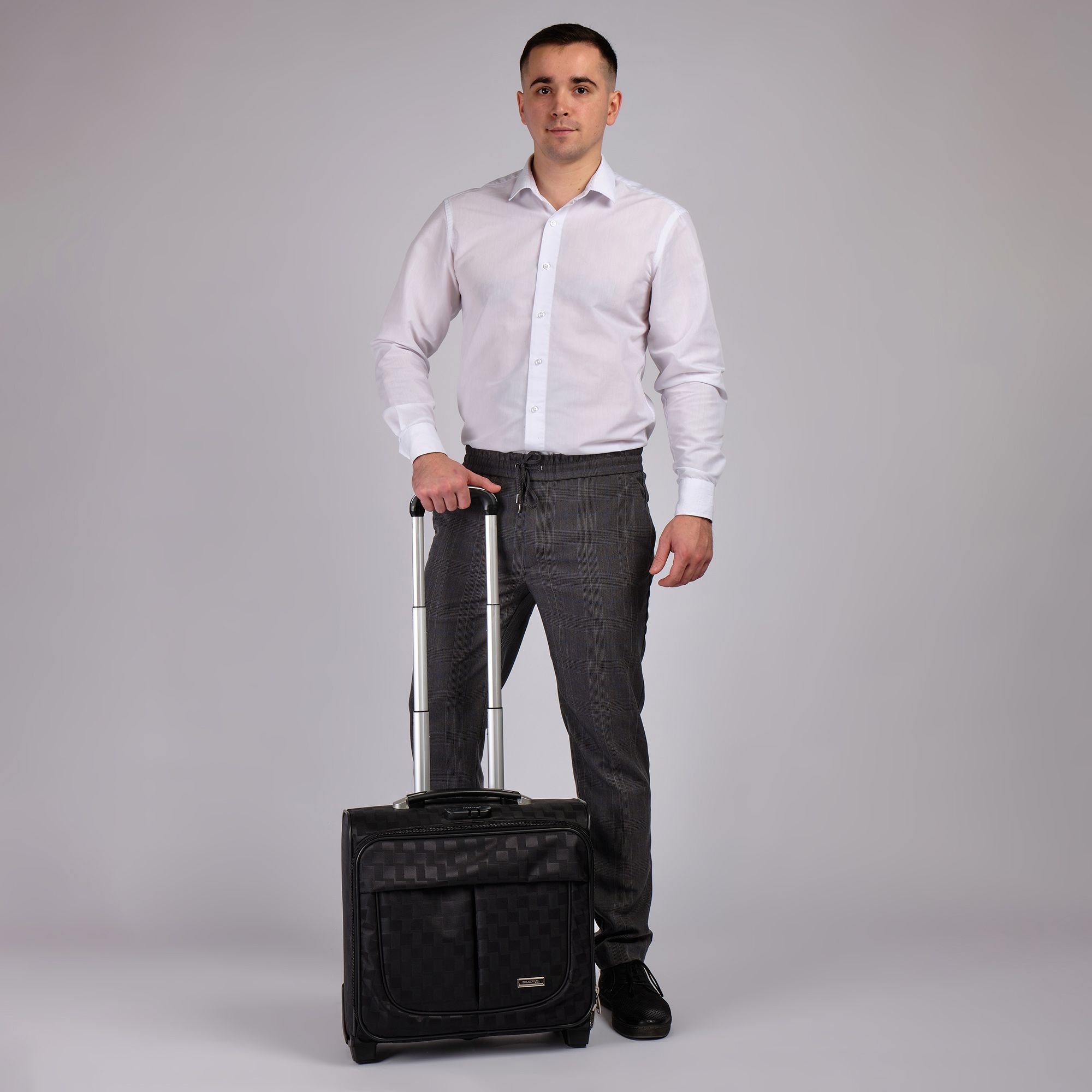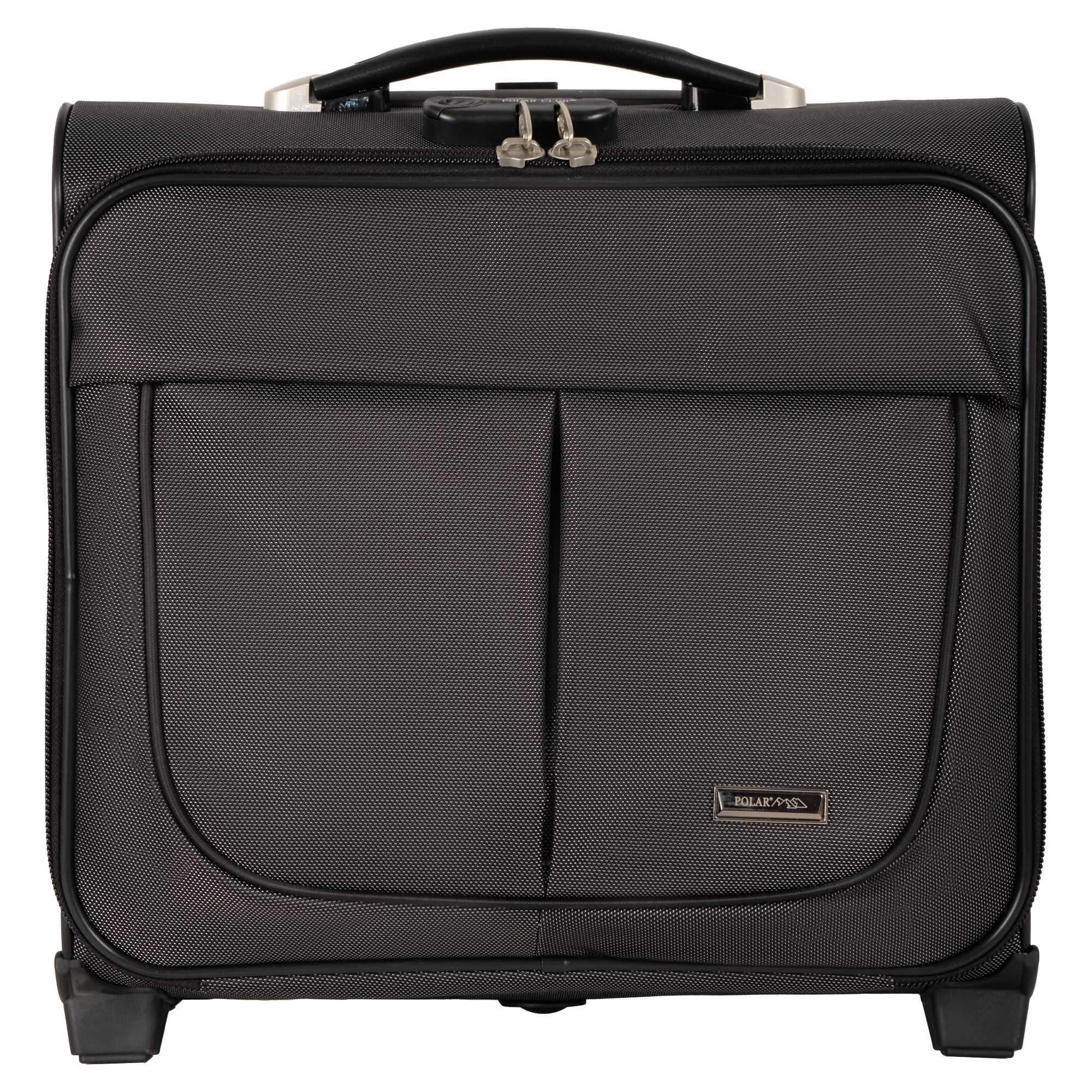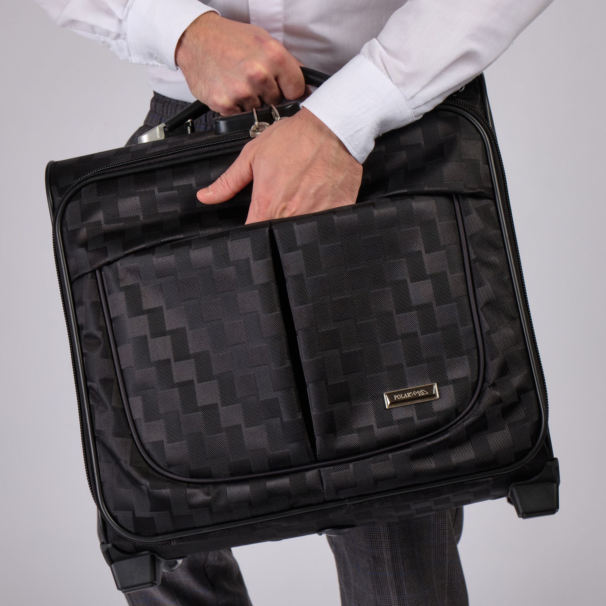Чемодан от компании "Polar" на двух колёсах выполнен из прочного материала (нейлона и полиэстера). Подходит как ручная кладь. Чемодан закрывается на молнию, присутствует также встроенный кодовый замок.Внутри есть одно большое отделение , в котором присутствуют ремни для фиксации вещей, отделение для ноутбука и маленький карман на молнии для документов. Снаружи расположен объёмный карман на молнии для мелких вещей. У чемодана есть небольшая ручка для переноски и металлическая ручка, которая выдвигается на 67 см..