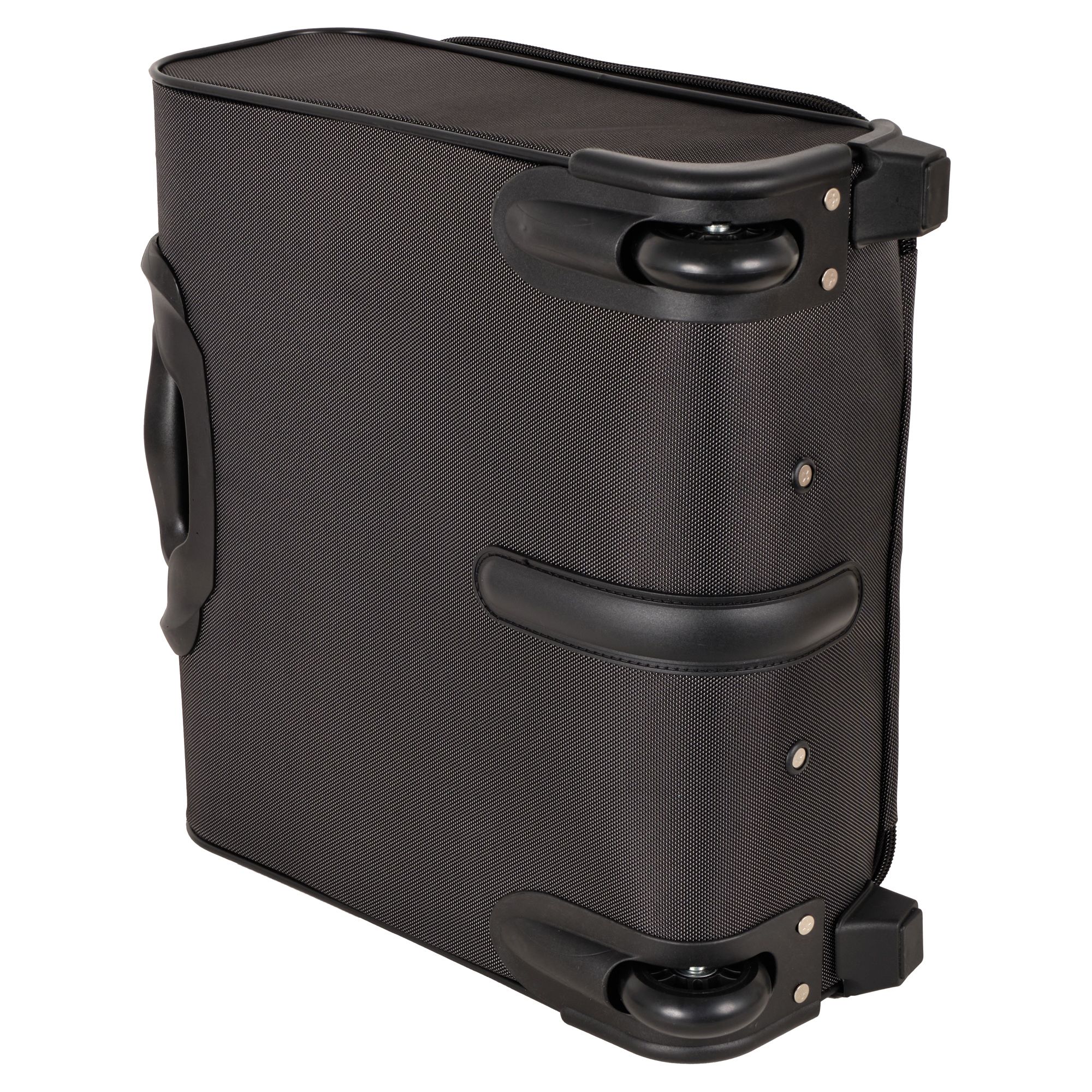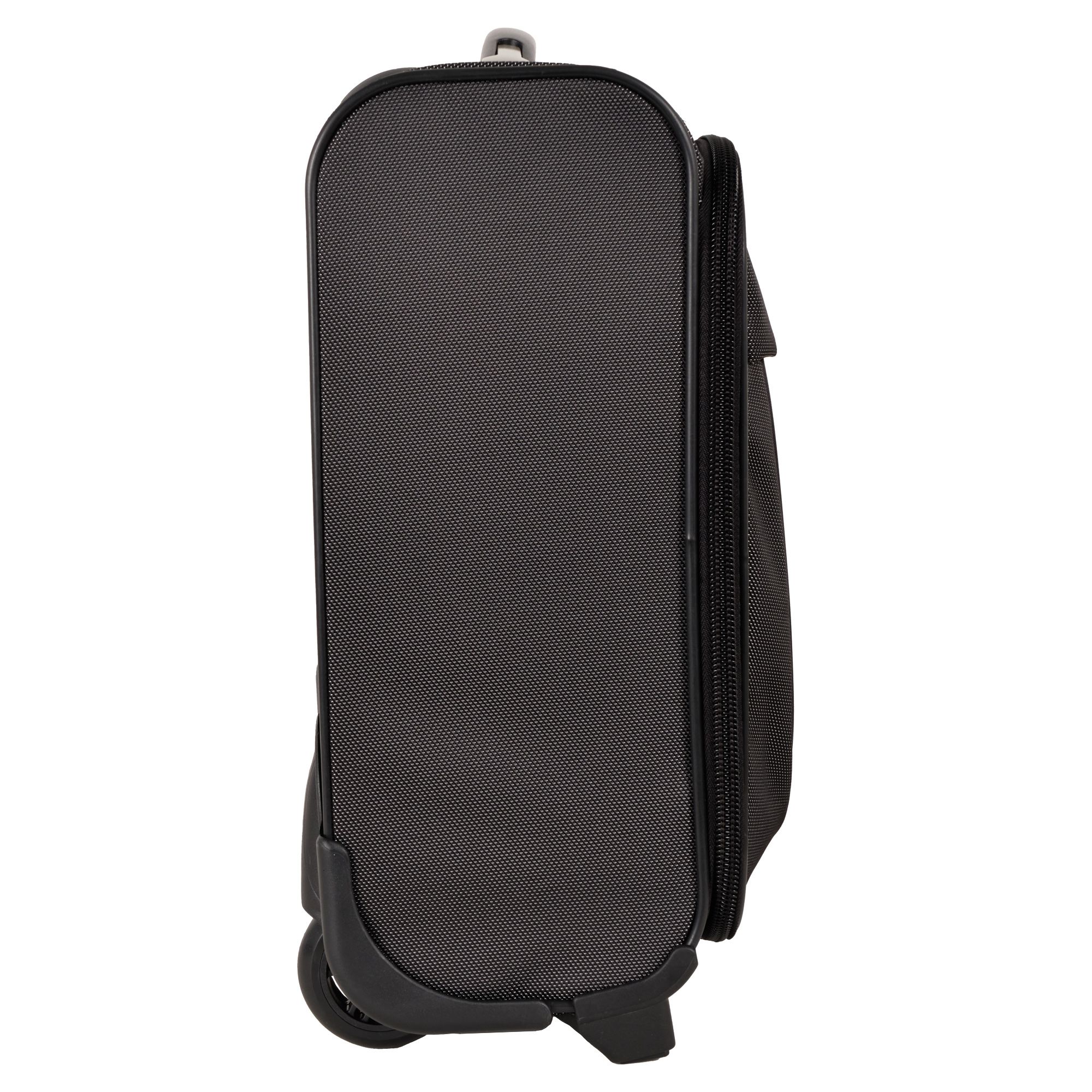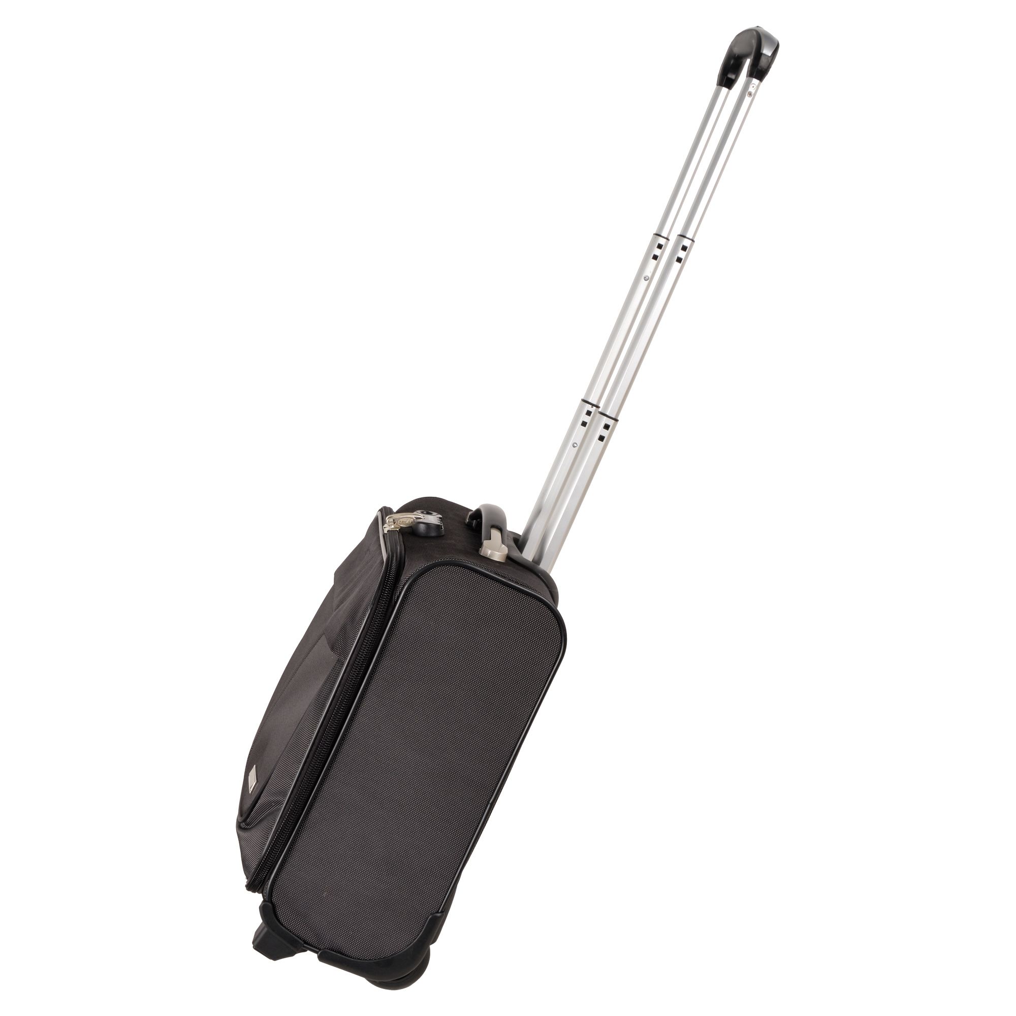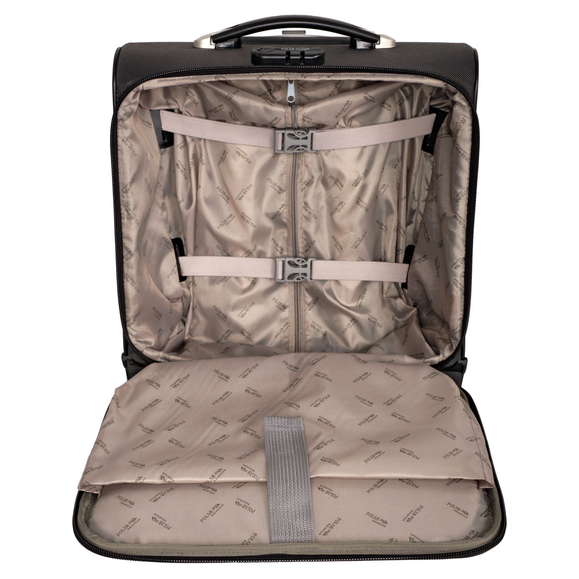 Чемодан от компании "Polar" на двух колёсах выполнен из прочного материала (нейлона и полиэстера). Подходит как ручная кладь. Чемодан закрывается на молнию, присутствует также встроенный кодовый замок.Внутри есть одно большое отделение , в котором присутствуют ремни для фиксации вещей, отделение для ноутбука и маленький карман на молнии для документов. Снаружи расположен объёмный карман на молнии для мелких вещей. У чемодана есть небольшая ручка для переноски и металлическая ручка, которая выдвигается на 67 см..