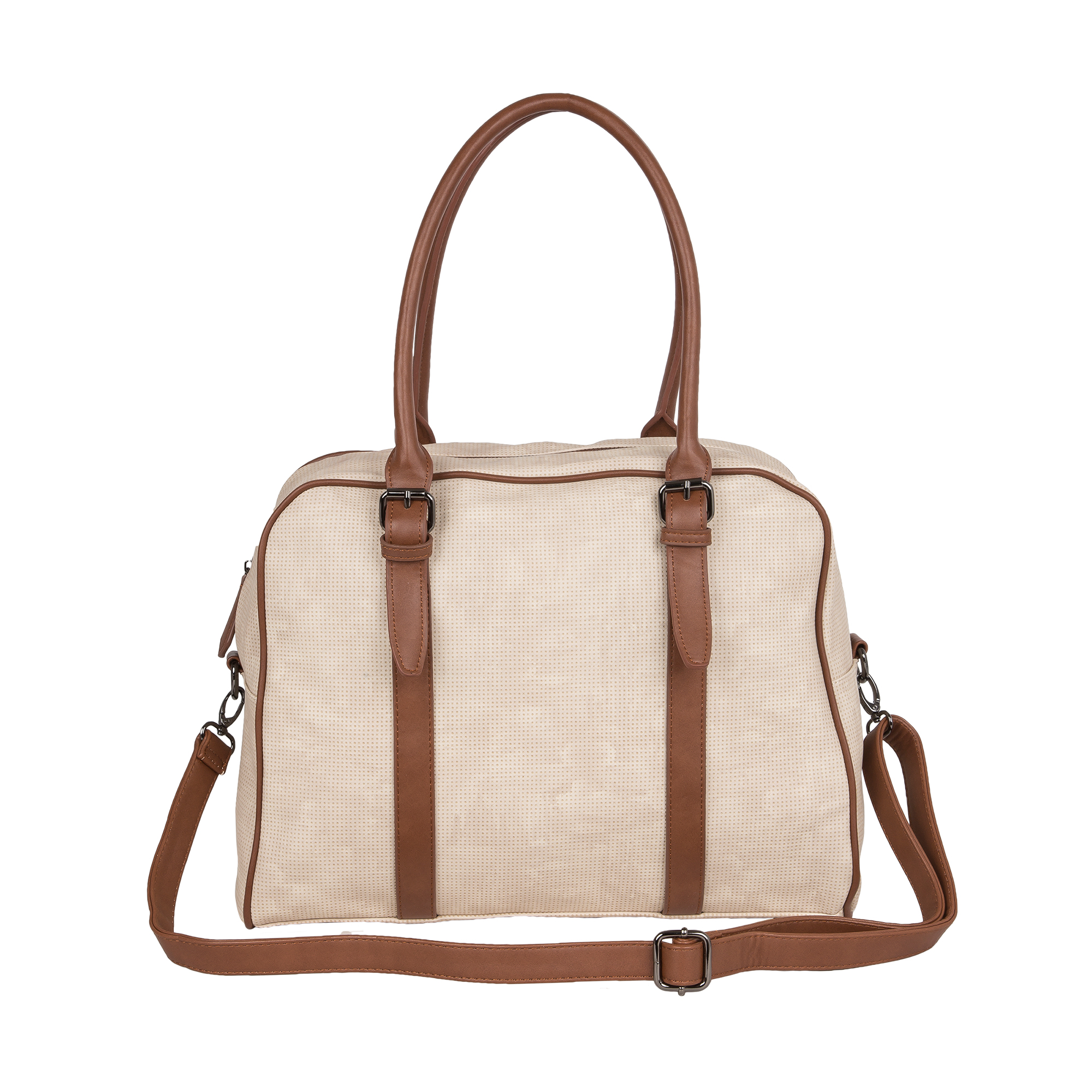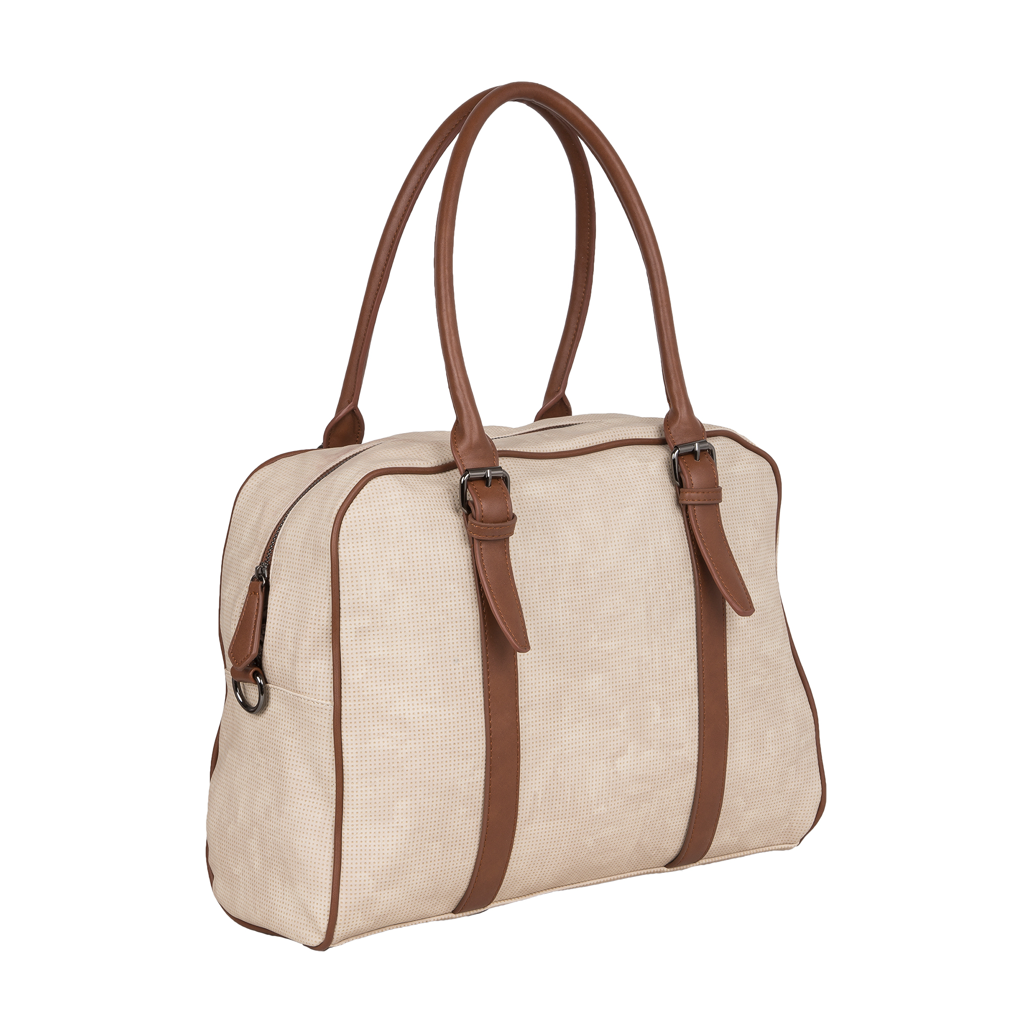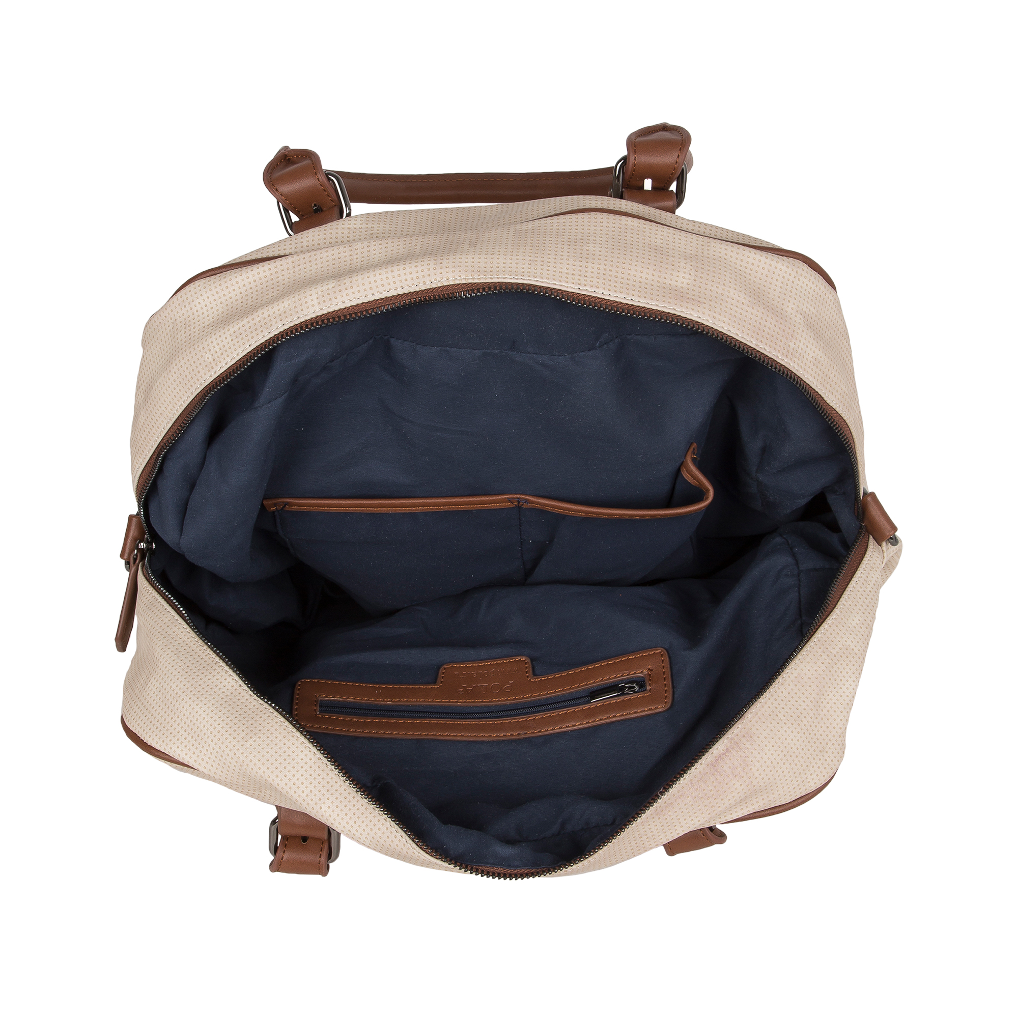 Дорожная вместительная сумка POLA выполнена из экокожи и очень практична в повседневном использовании. Основное отделение закрывается на молнию, внутри основного отделения есть несколько открытых кармашков и карман на молнии. Сзади сумки есть карман на молнии. У сумки есть 2 ручки для переноски, высота которых составляет 25см и съёмный плечевой ремень длина которого 148см.