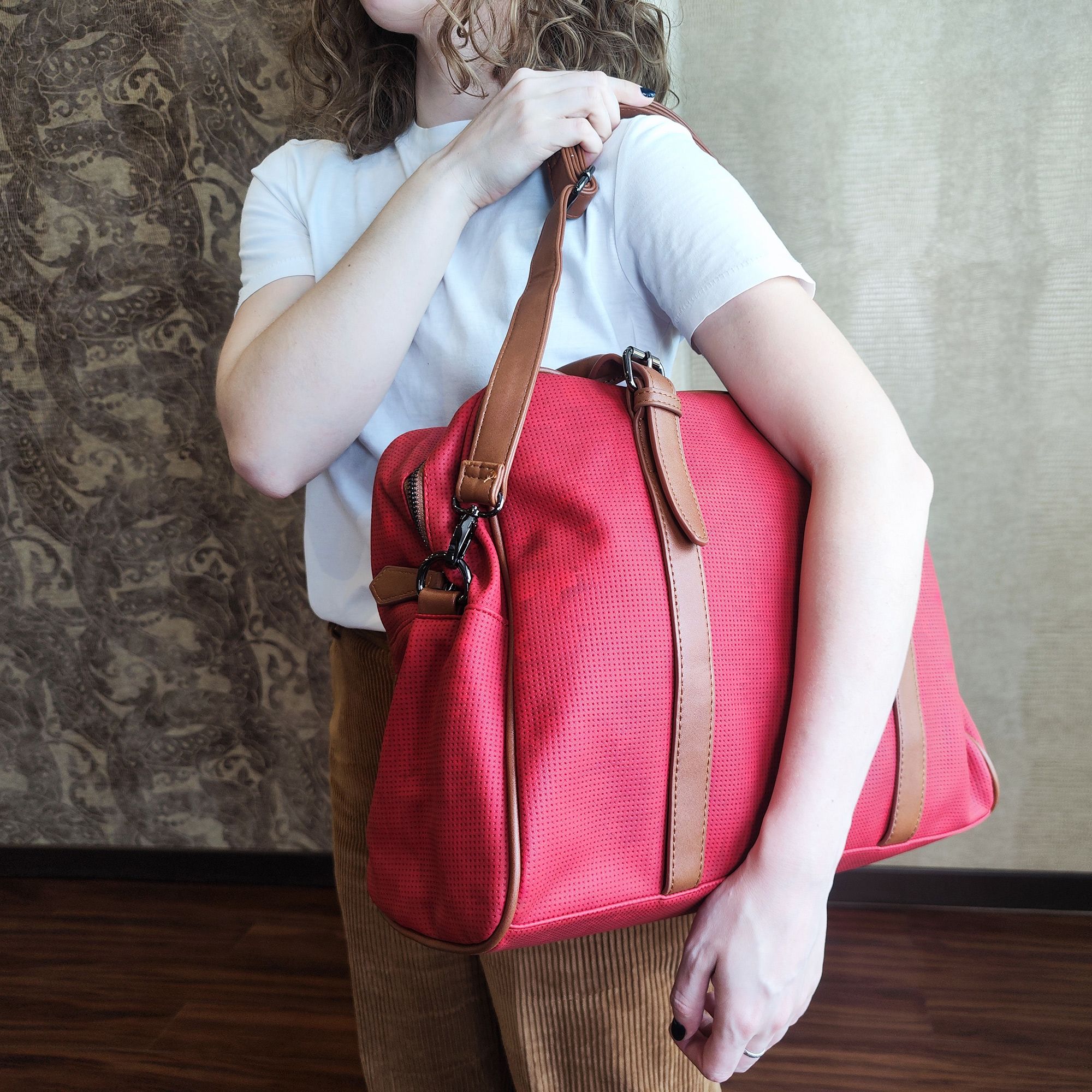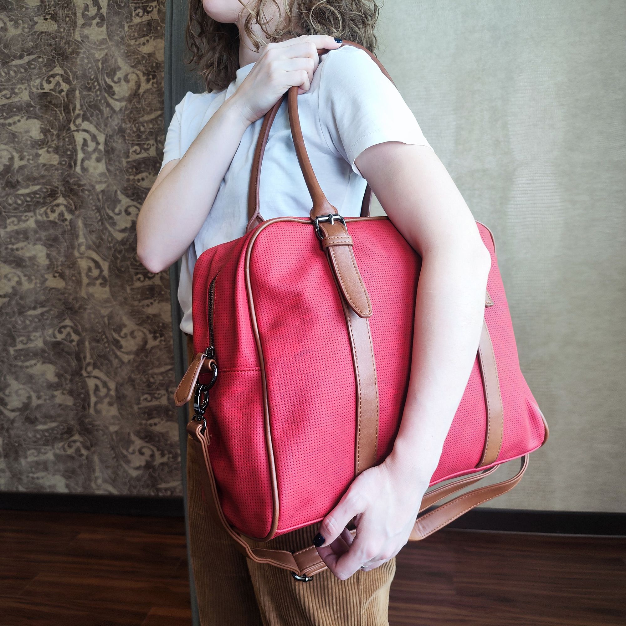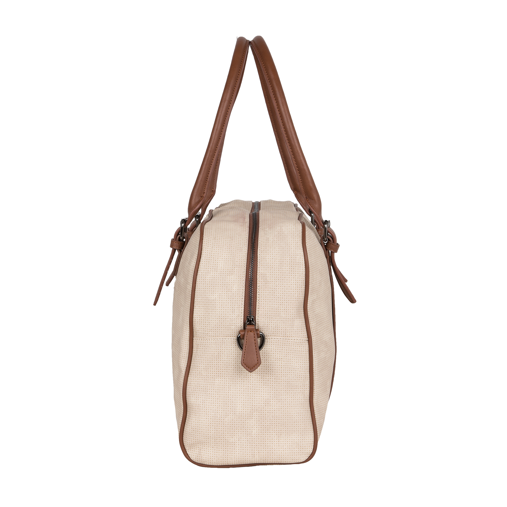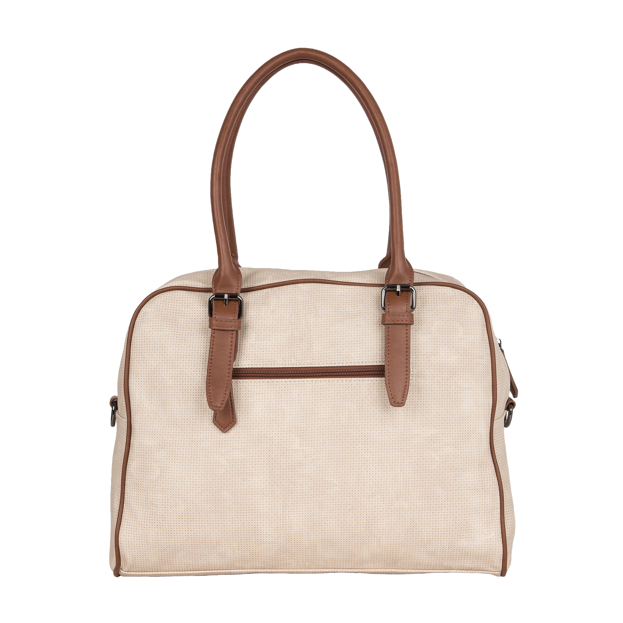 Дорожная вместительная сумка POLA выполнена из экокожи и очень практична в повседневном использовании. Основное отделение закрывается на молнию, внутри основного отделения есть несколько открытых кармашков и карман на молнии. Сзади сумки есть карман на молнии. У сумки есть 2 ручки для переноски, высота которых составляет 25см и съёмный плечевой ремень длина которого 148см.