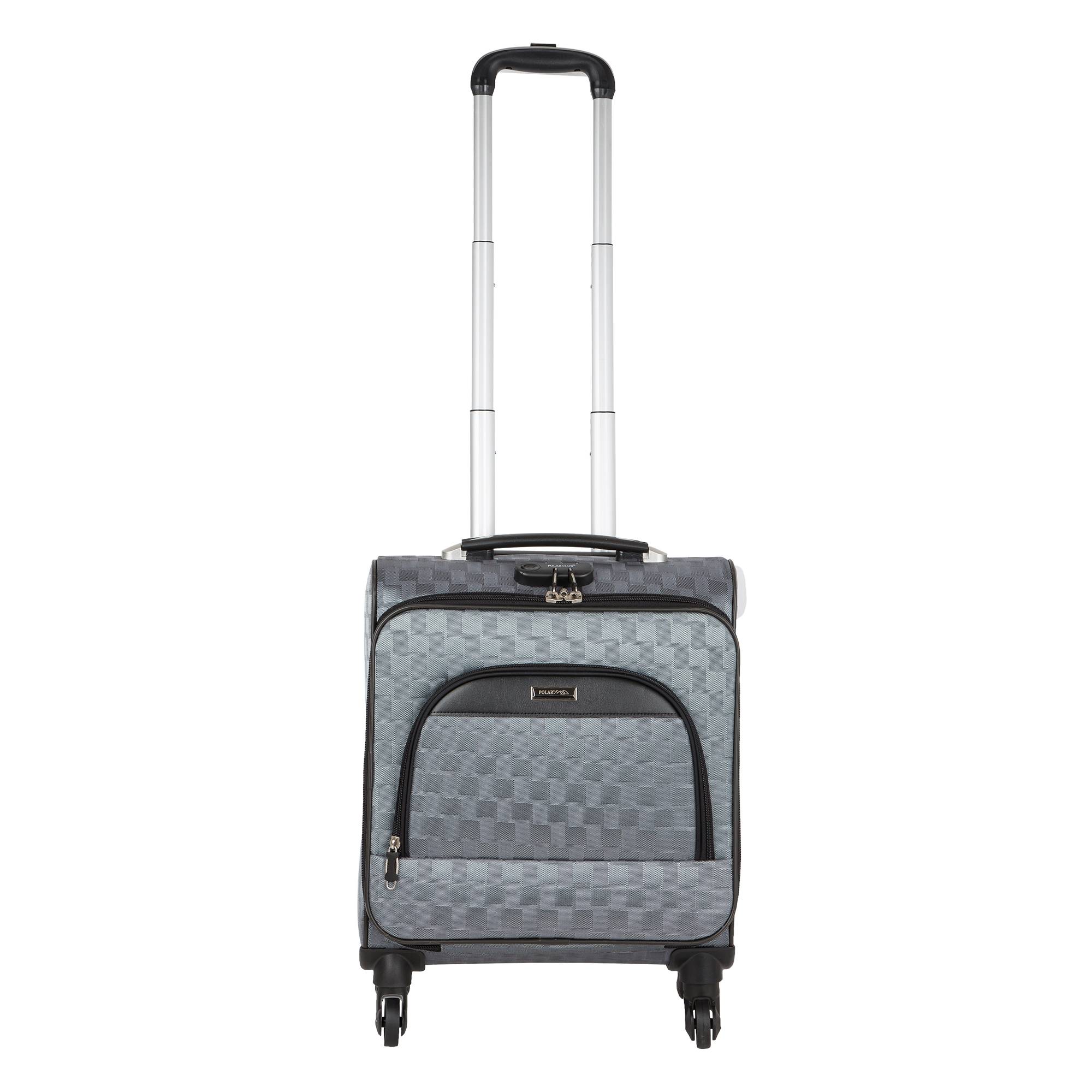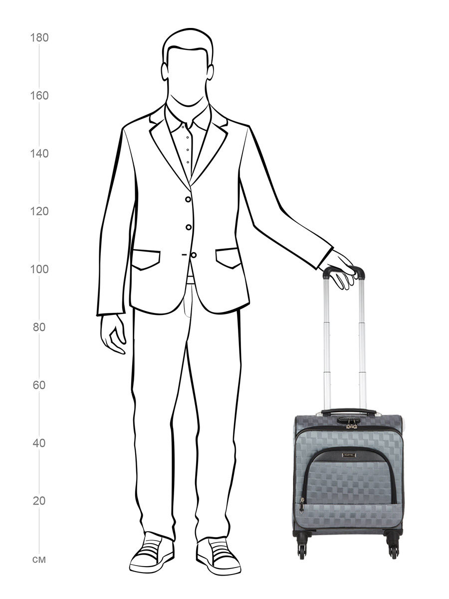 Чемодан от компании "Polar" на четырёх колёсах выполнен из прочного материала (нейлона и полиэстера). Подходит как ручная кладь. Чемодан закрывается на молнию, присутствует также встроенный кодовый замок.Внутри есть одно большое отделение , в котором присутствуют ремни для фиксации вещей, отделение для ноутбука и маленький карман на молнии для документов. Снаружи расположен объёмный карман на молнии для мелких вещей. У чемодана есть небольшая ручка для переноски и металлическая ручка, которая выдвигается на 55см.