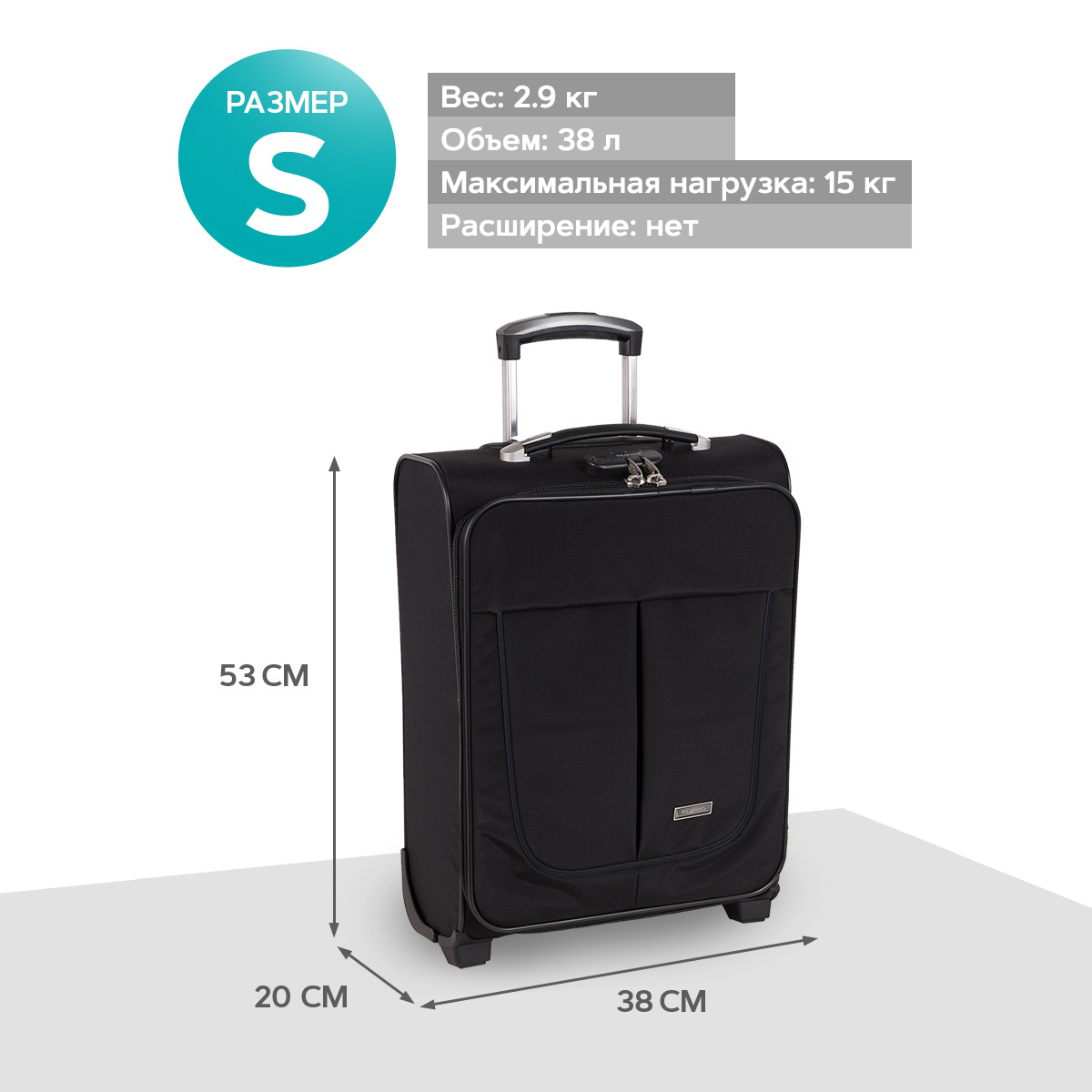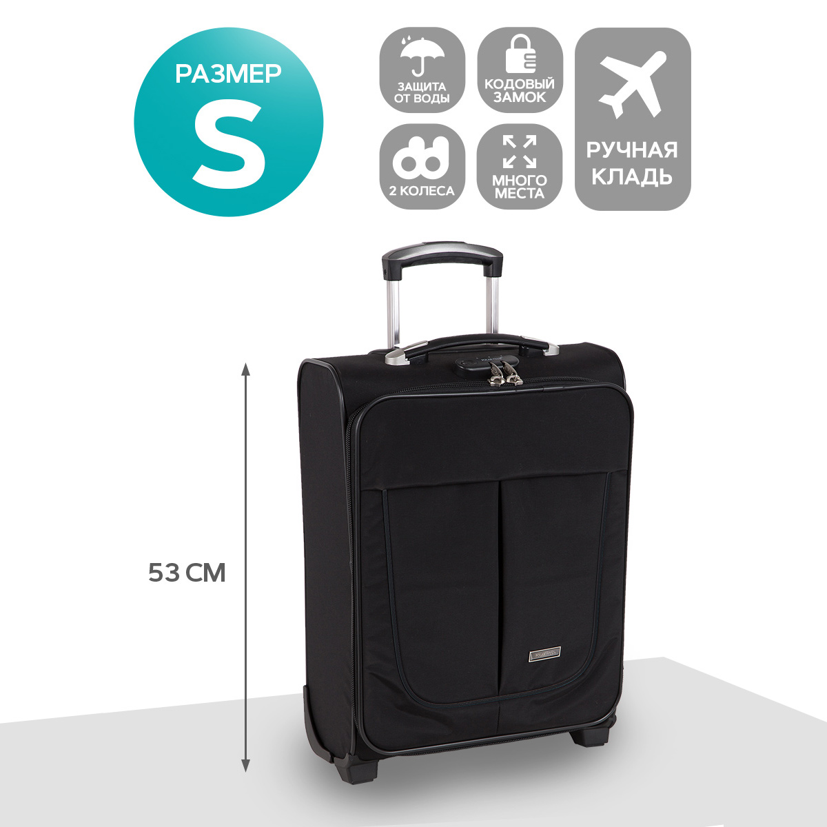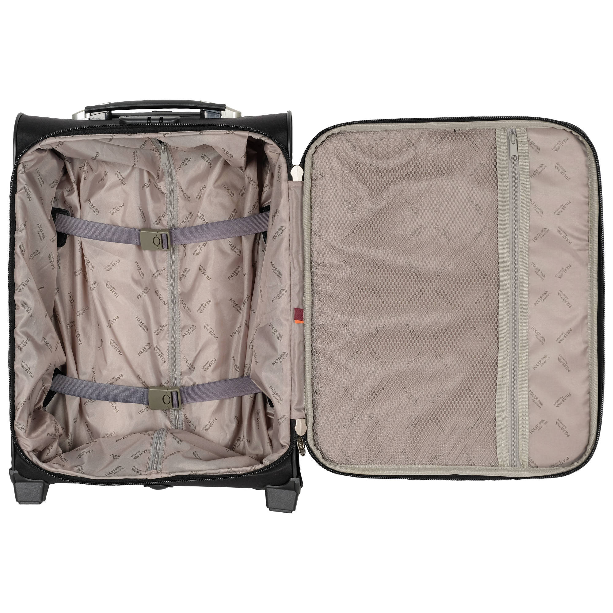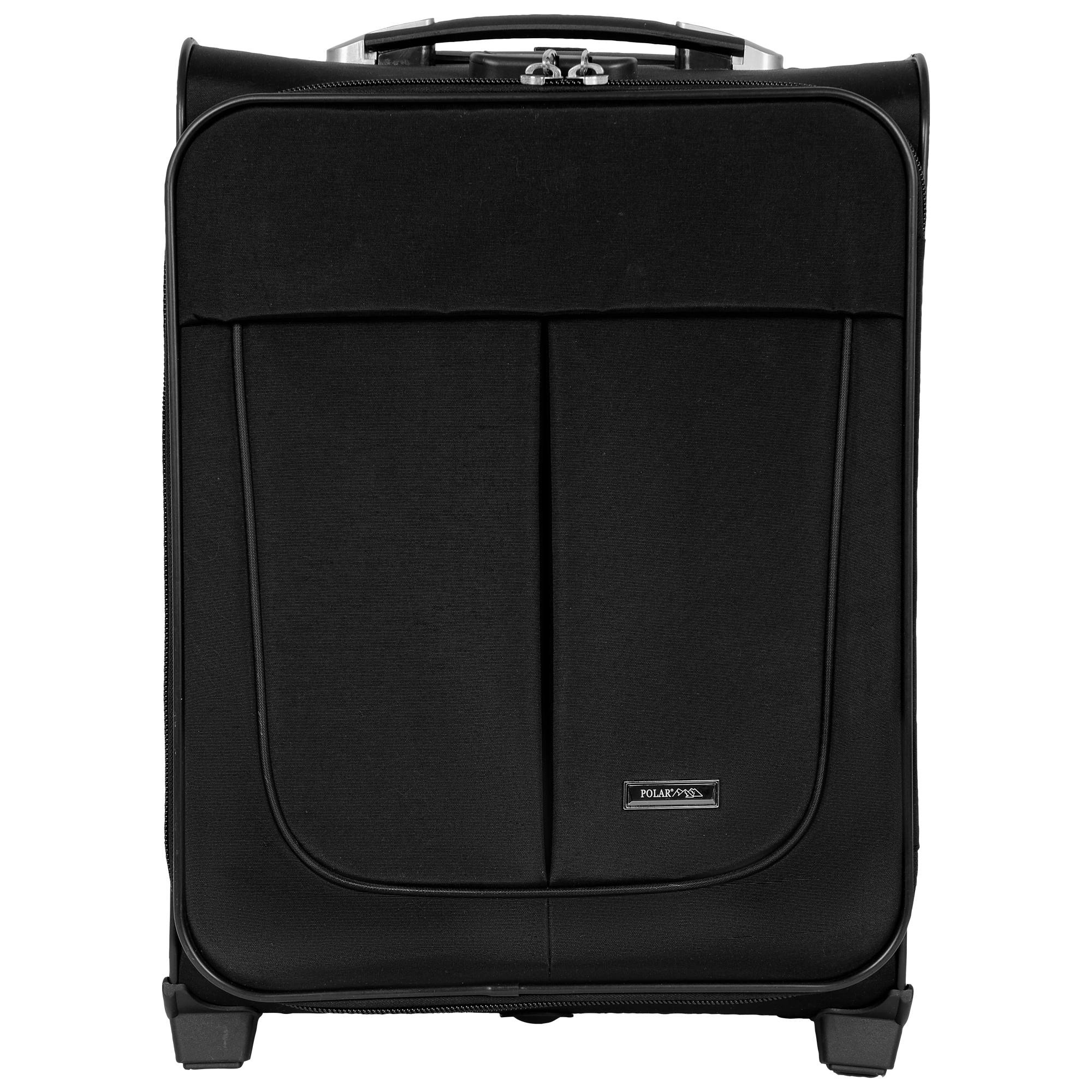 Чемодан от компании "Polar" на двух колёсах выполнен из прочного материала (нейлона и полиэстера). Чемодан закрывается на молнию, присутствует также встроенный кодовый замок.Внутри есть одно большое отделение , в котором присутствуют ремни для фиксации вещей, отделение для ноутбука и маленький карман на молнии для документов. Снаружи расположен объёмный карман на молнии для мелких вещей. У чемодана есть небольшая ручка для переноски и металлическая ручка, которая выдвигается на 50см.