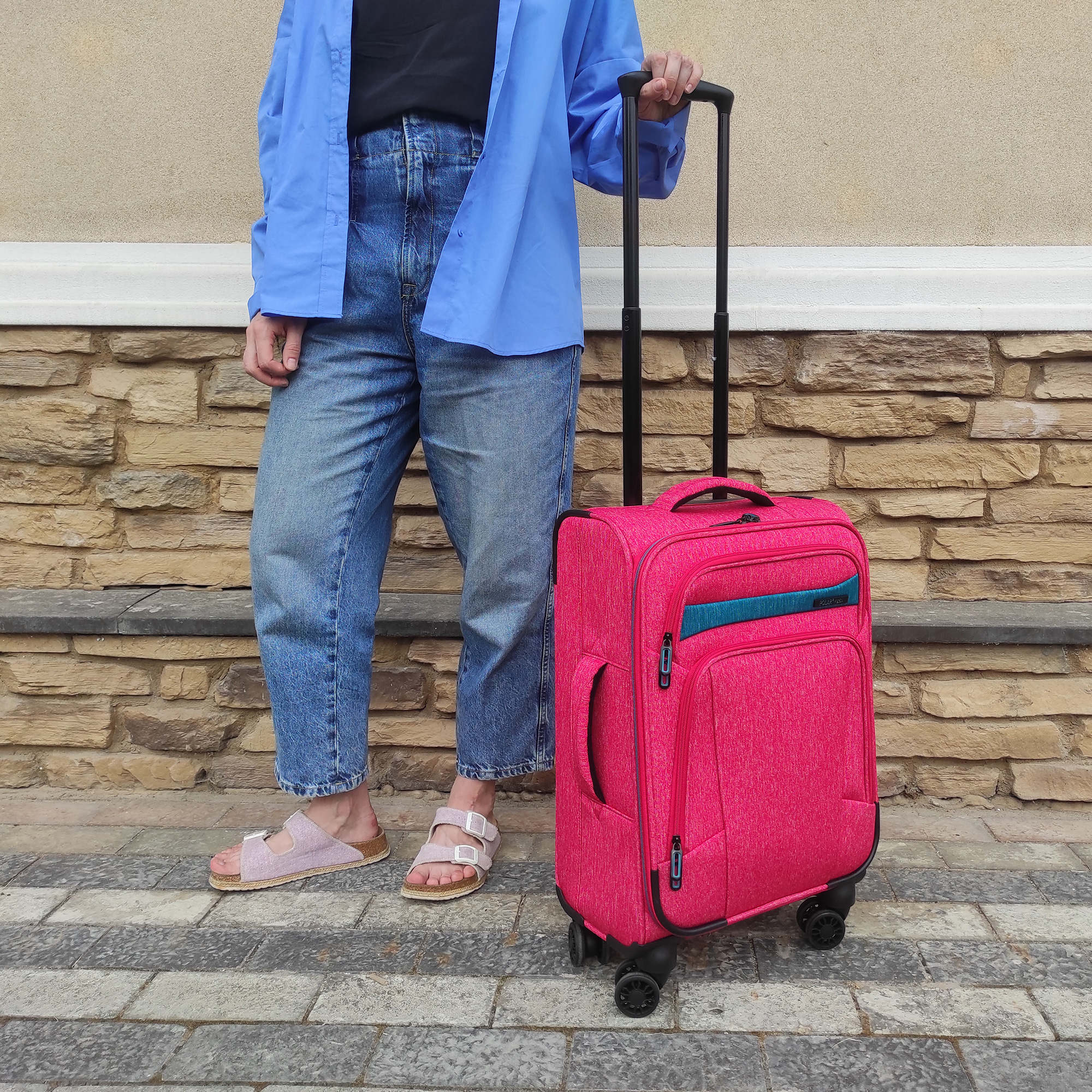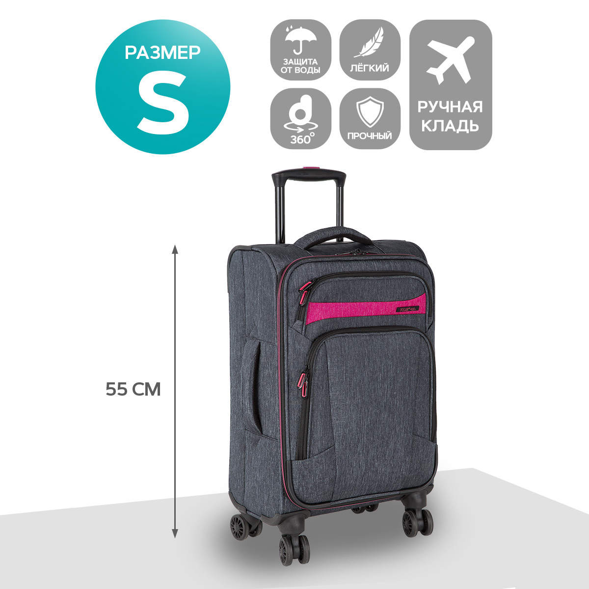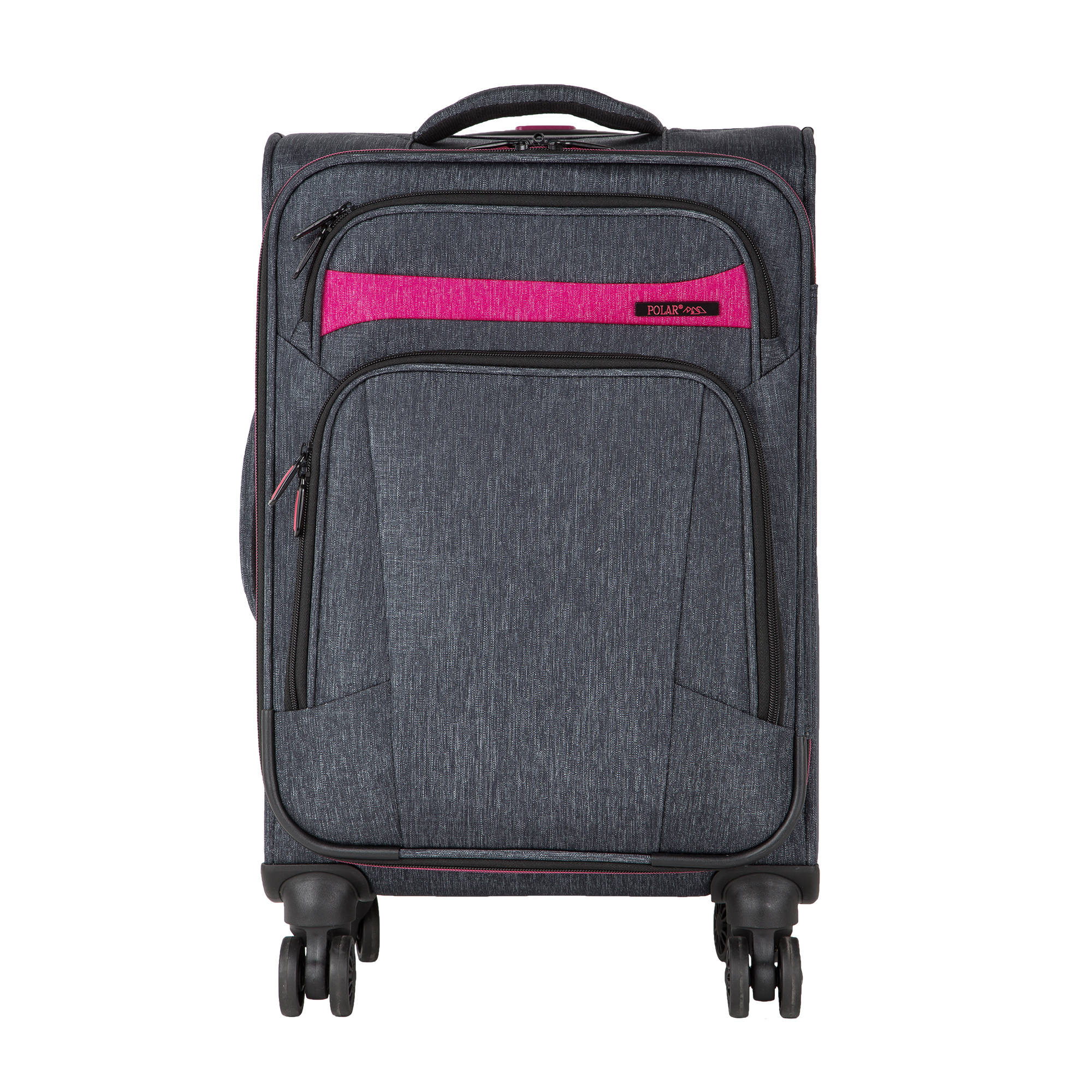 Суперлегкий четырёхколёсный чемодан POLAR. Основное отделение чемодана закрывается на молнию. Впереди два кармана на молнии. Внутри стяжные ремни и карман на молнии. Четырёхколёсный чемодан более маневренный и удобный по сравнению с двухколёсным - 4 колеса вращаются на 360 градусов.
