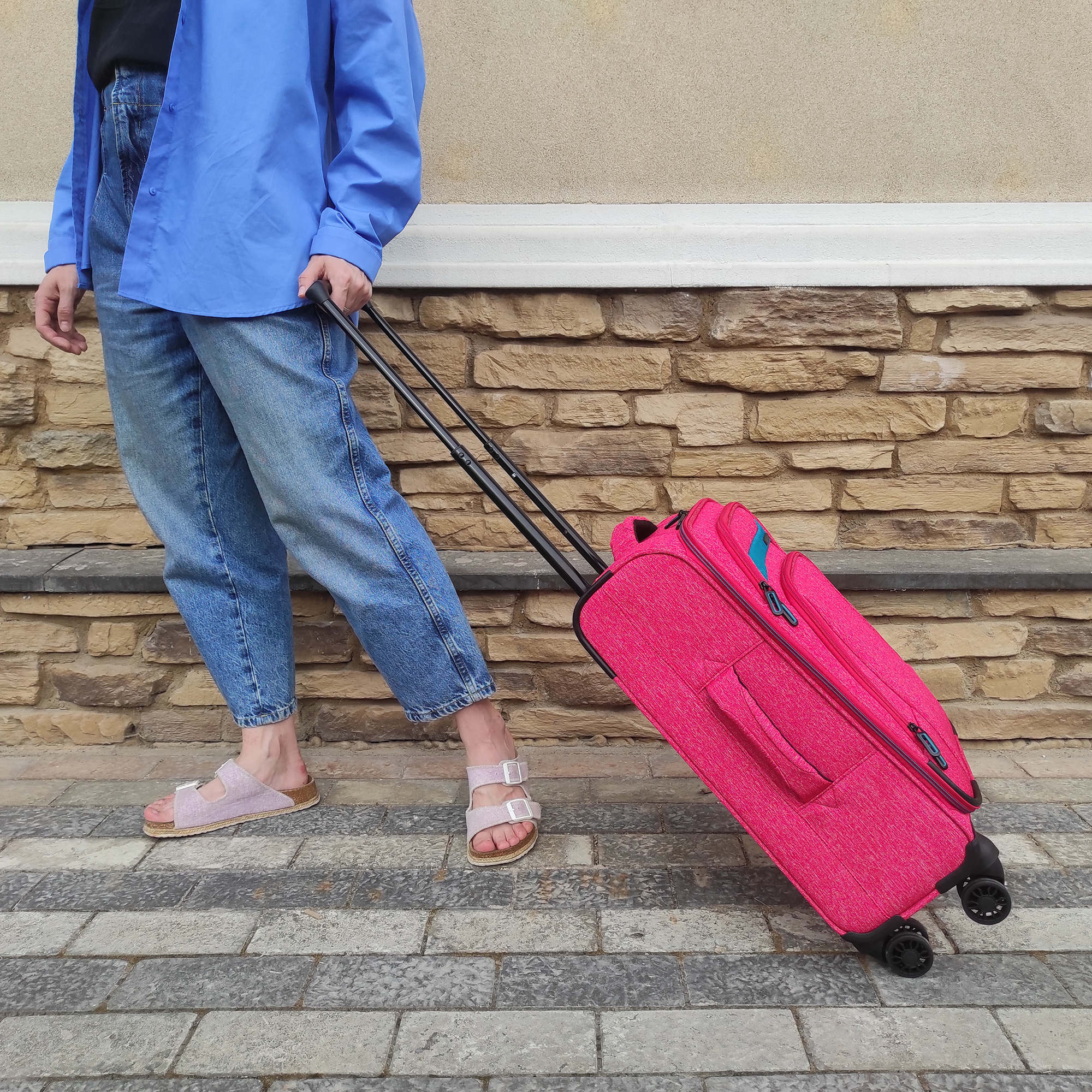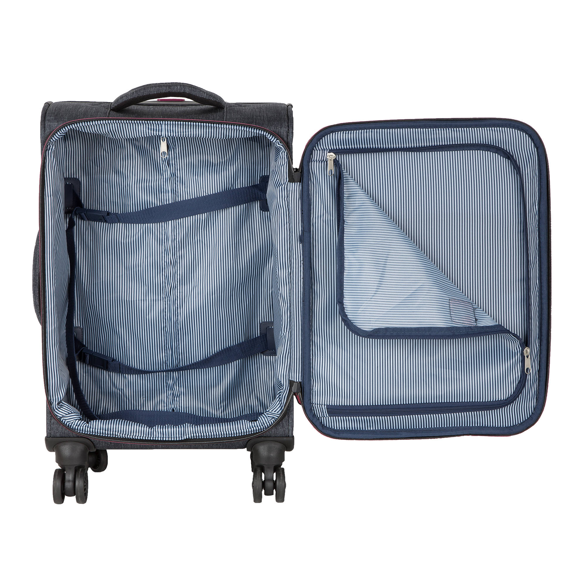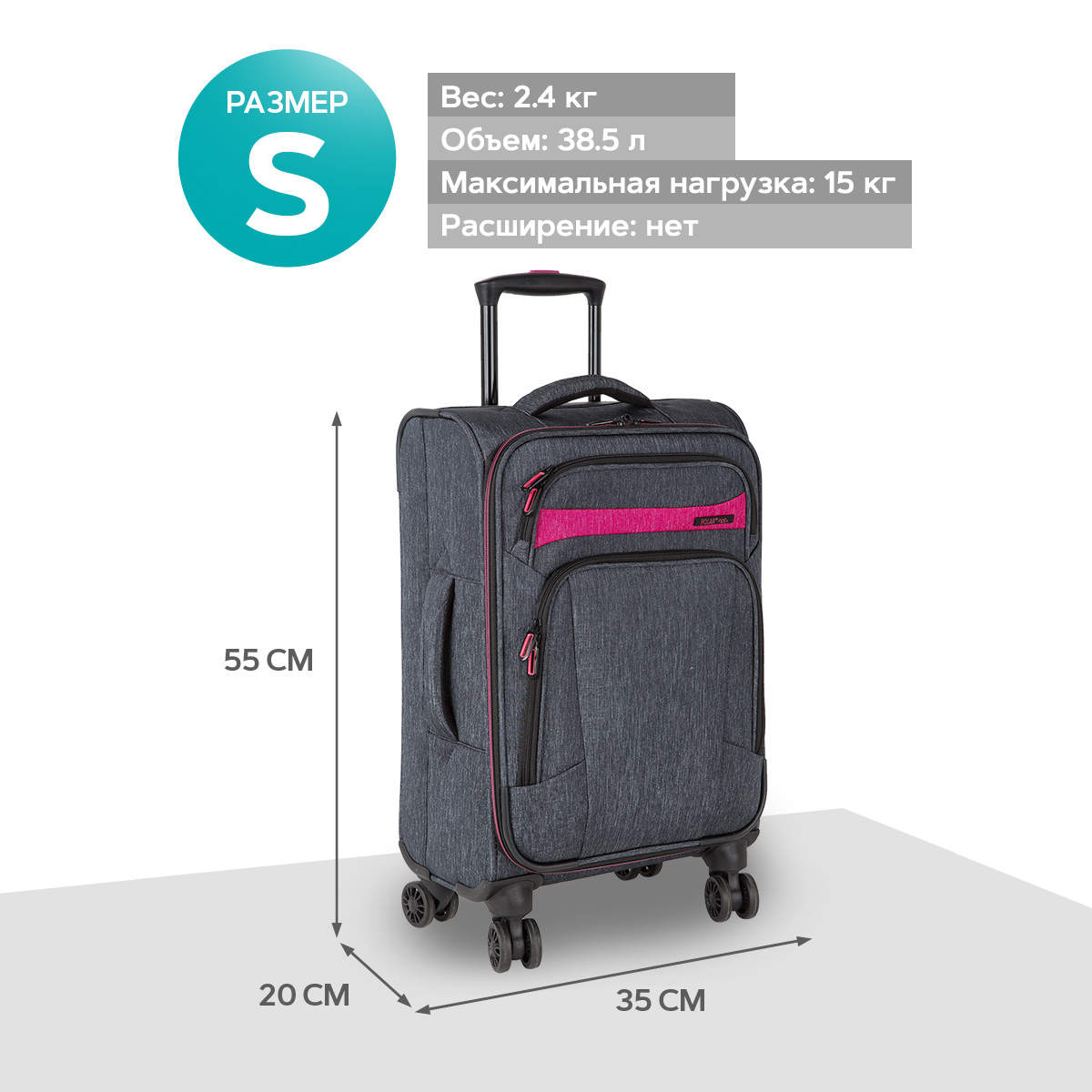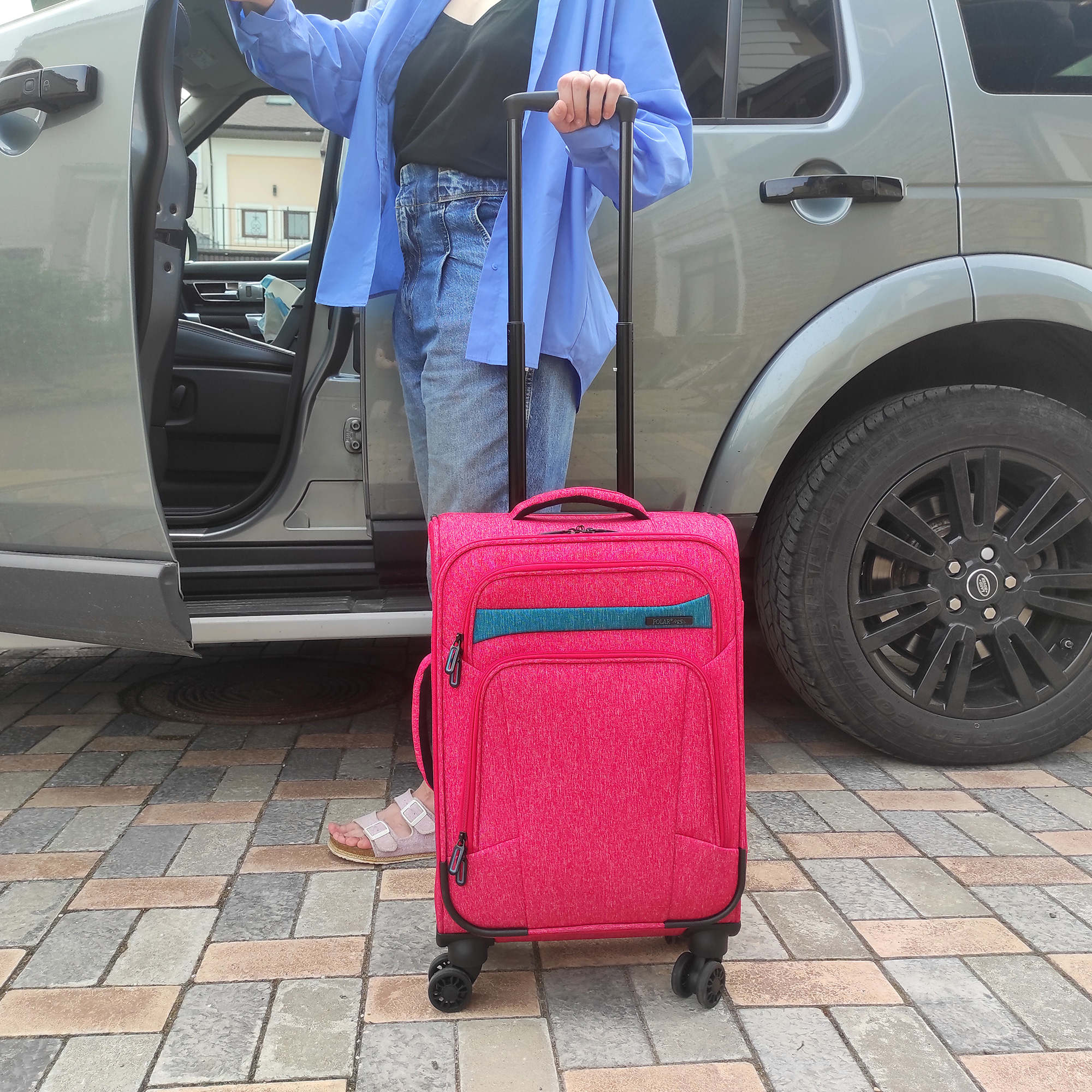 Суперлегкий четырёхколёсный чемодан POLAR. Основное отделение чемодана закрывается на молнию. Впереди два кармана на молнии. Внутри стяжные ремни и карман на молнии. Четырёхколёсный чемодан более маневренный и удобный по сравнению с двухколёсным - 4 колеса вращаются на 360 градусов.