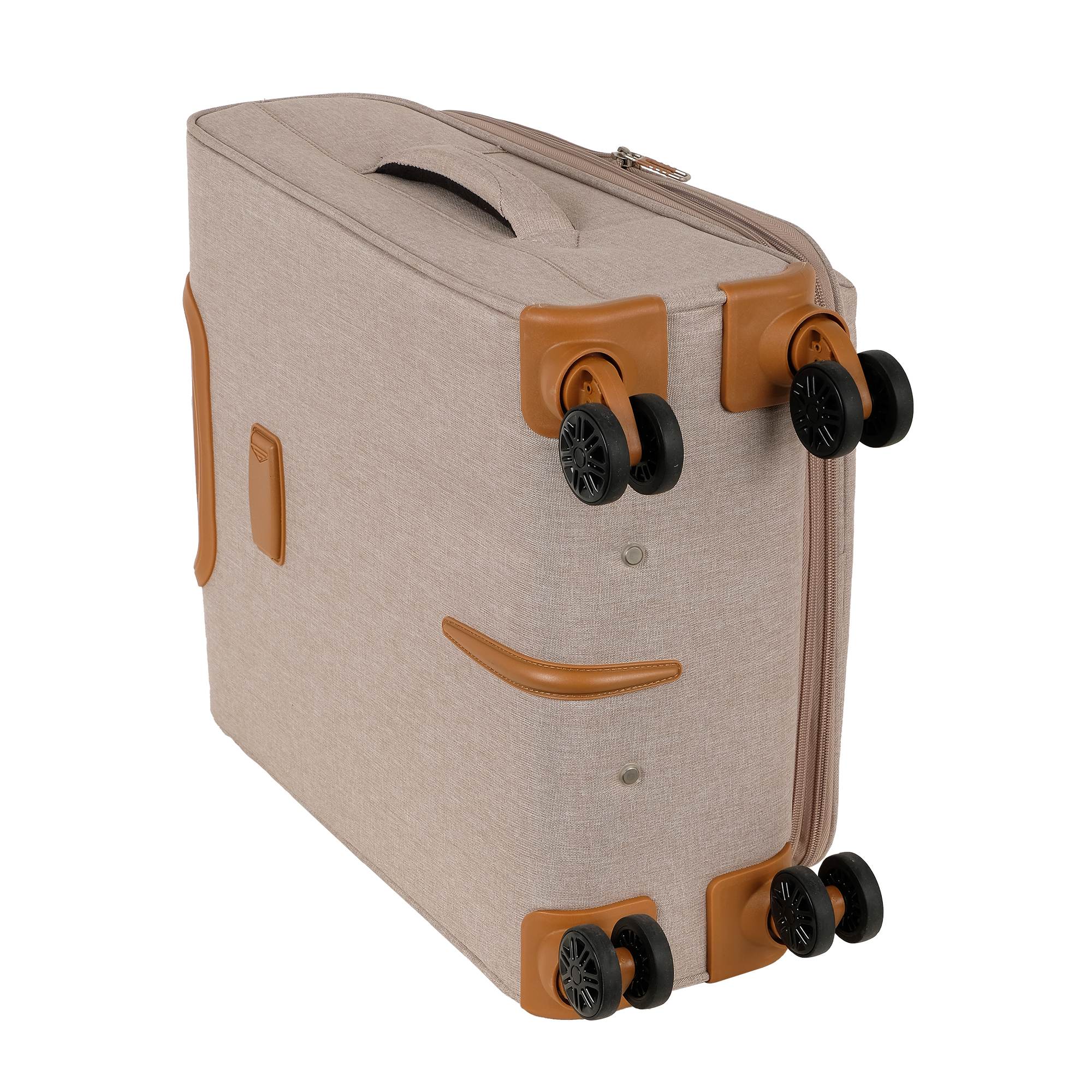 Стильный чемодан модной расцветки имеет в наличии две ручки для переноски сбоку и сверху чемодана, а также выдвижную ручку- тележку. Чемодан имеет 4 двойных колеса с подшипниками, которые вращаются на 360 градусов, это делает чемодан очень маневренным и позволяет легко перемещать багаж.