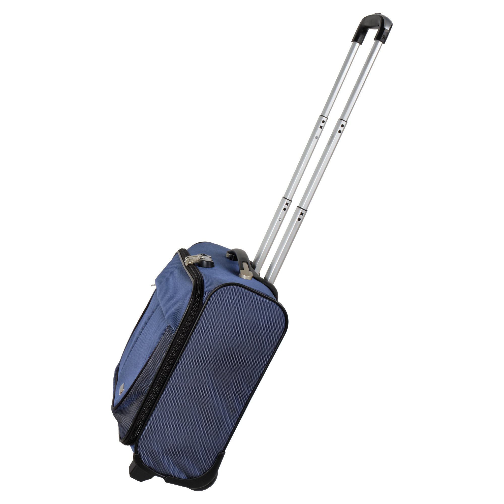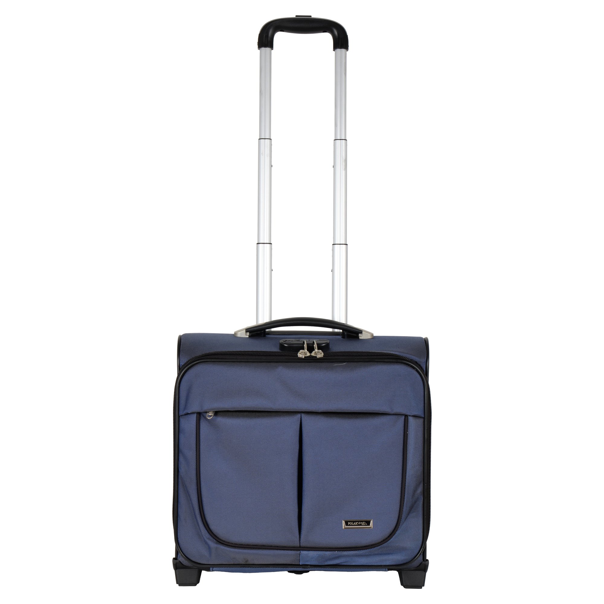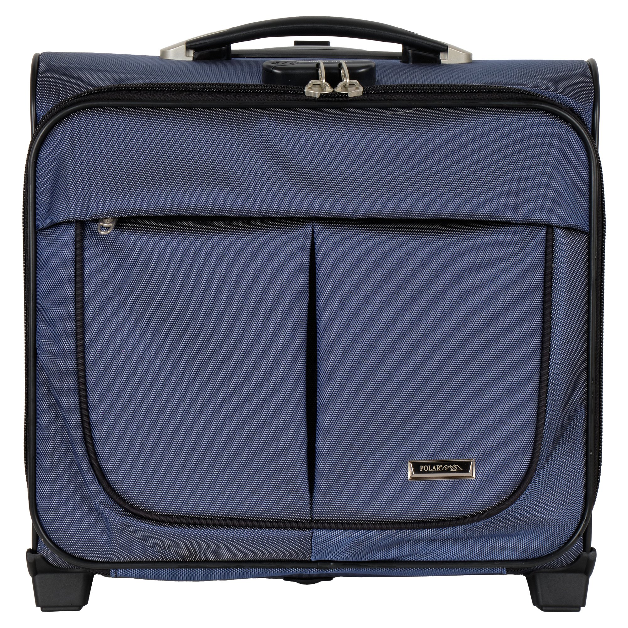 Чемодан от компании "Polar" на двух колёсах выполнен из прочного материала (нейлона и полиэстера). Подходит как ручная кладь. Чемодан закрывается на молнию, присутствует также встроенный кодовый замок.Внутри есть одно большое отделение , в котором присутствуют ремни для фиксации вещей, отделение для ноутбука и маленький карман на молнии для документов. Снаружи расположен объёмный карман на молнии для мелких вещей. У чемодана есть небольшая ручка для переноски и металлическая ручка, которая выдвигается на 67 см..