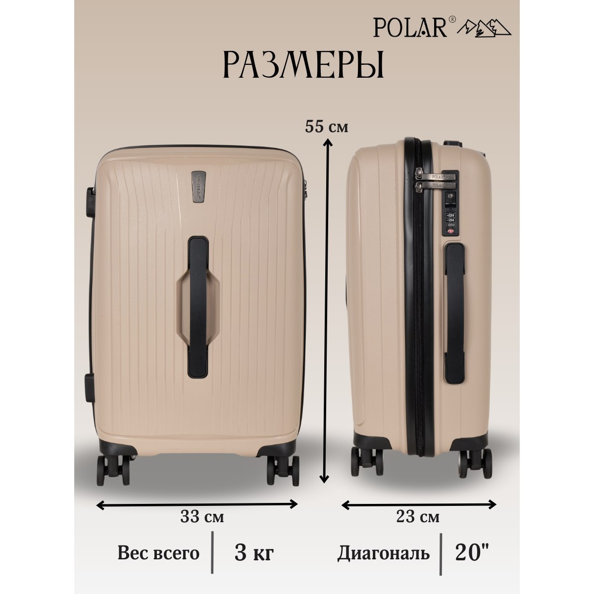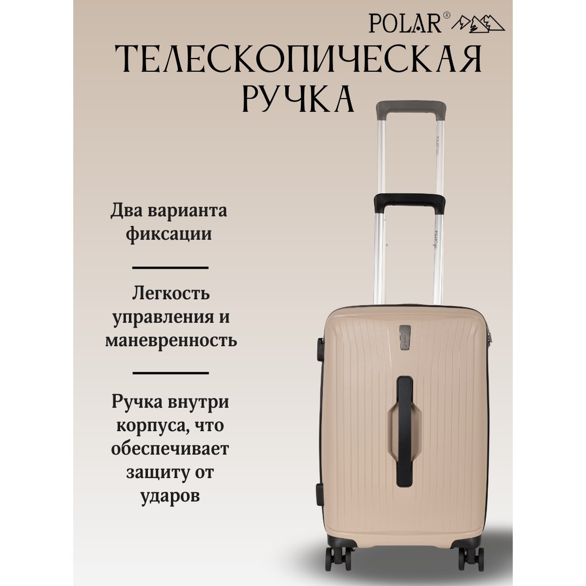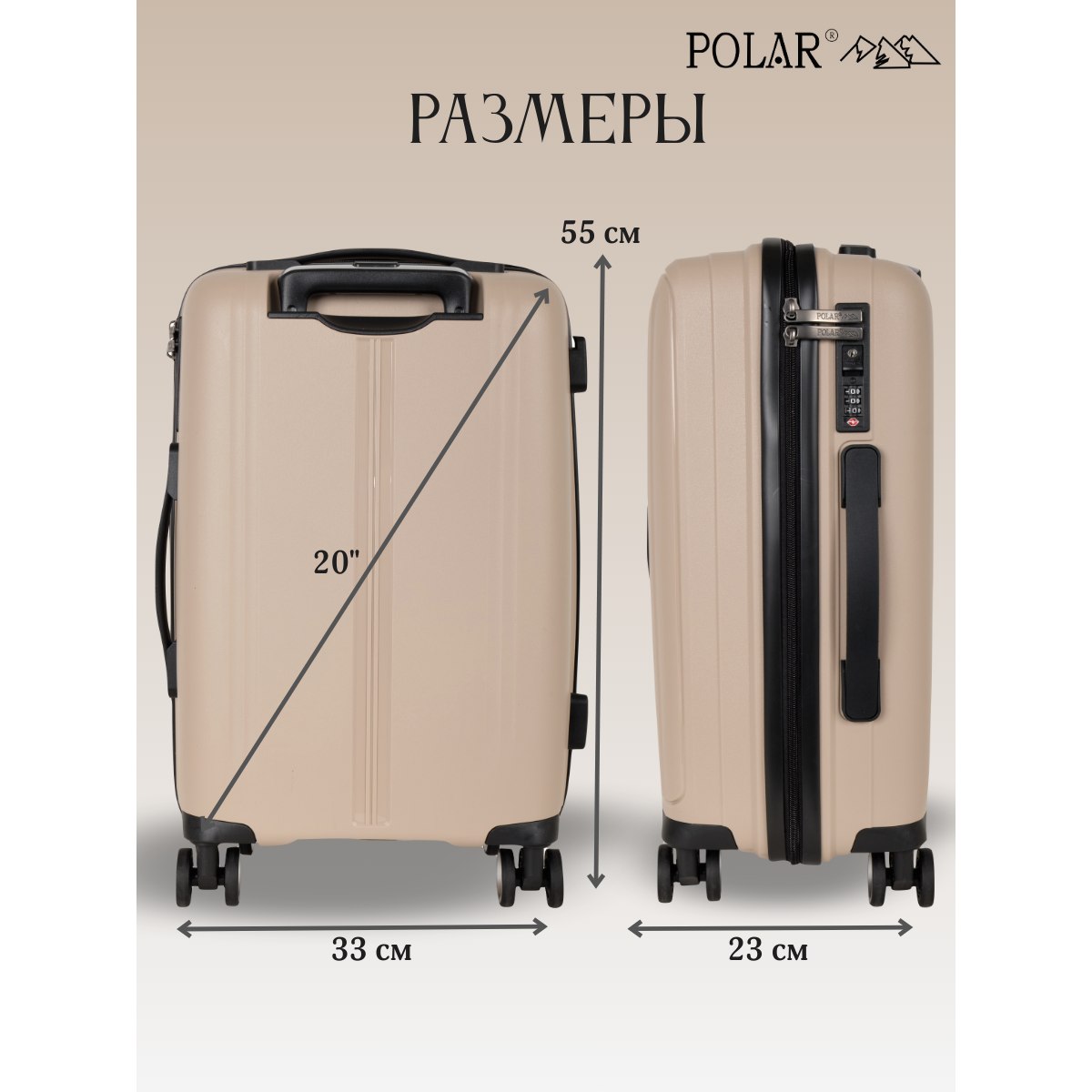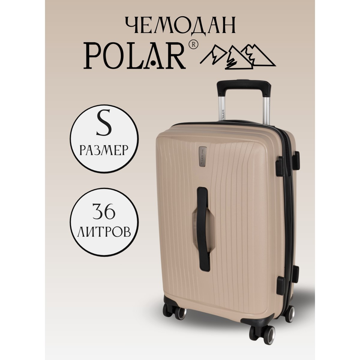 Чемодан малый фирмы POLAR, размер S, выполнен из PP (полипропилен). Основное отделение разделено на две части. Одно имеет фиксирующие ремни, второе на молнии. Выдвигающаяся ручка расположена внутри корпуса чемодана, что способствует большей прочности и защите от ударов при разгрузке/погрузке чемодана. Выдвигающаяся ручка фиксируется в трех  положениях. Есть кодовый замок. Надежные 4 колеса.
