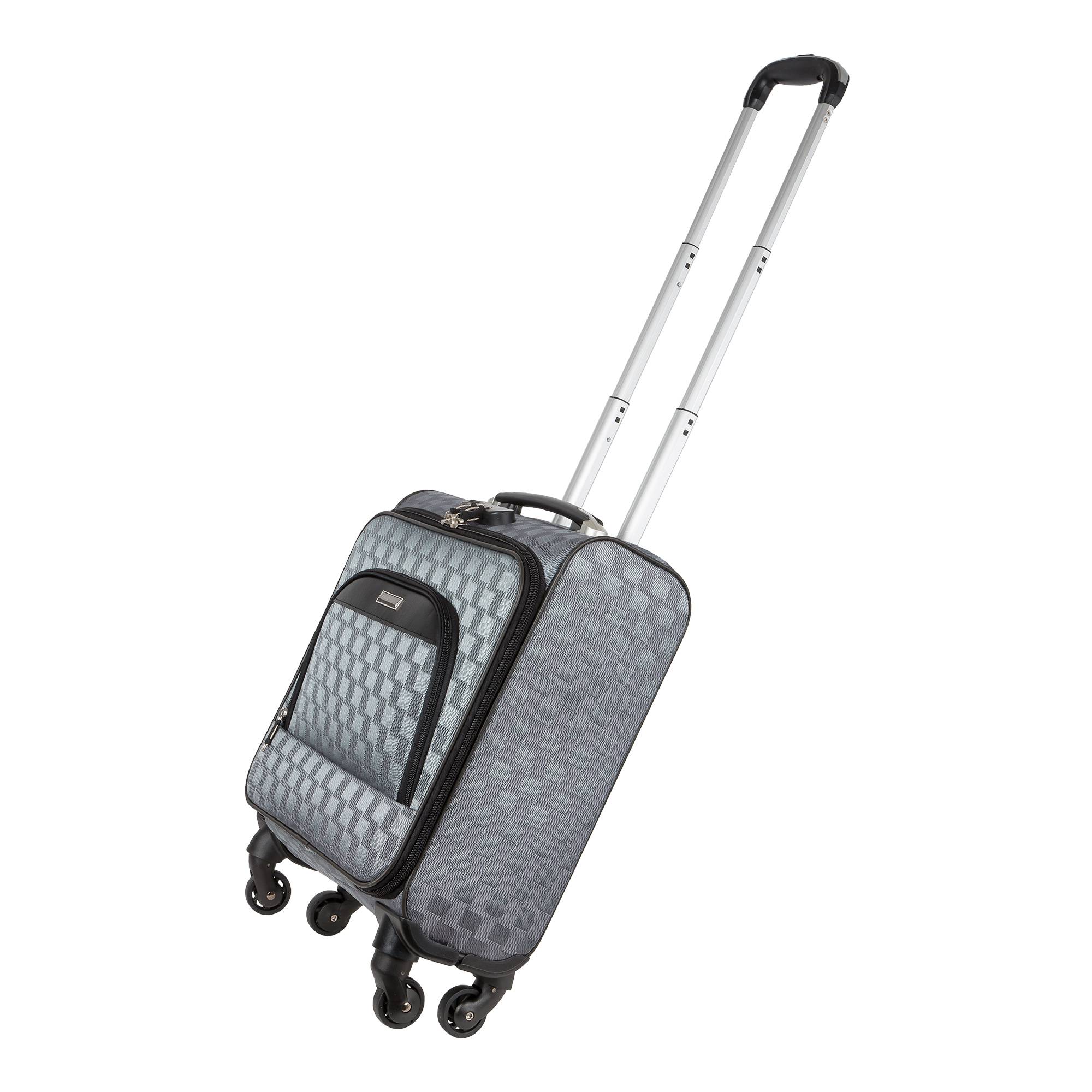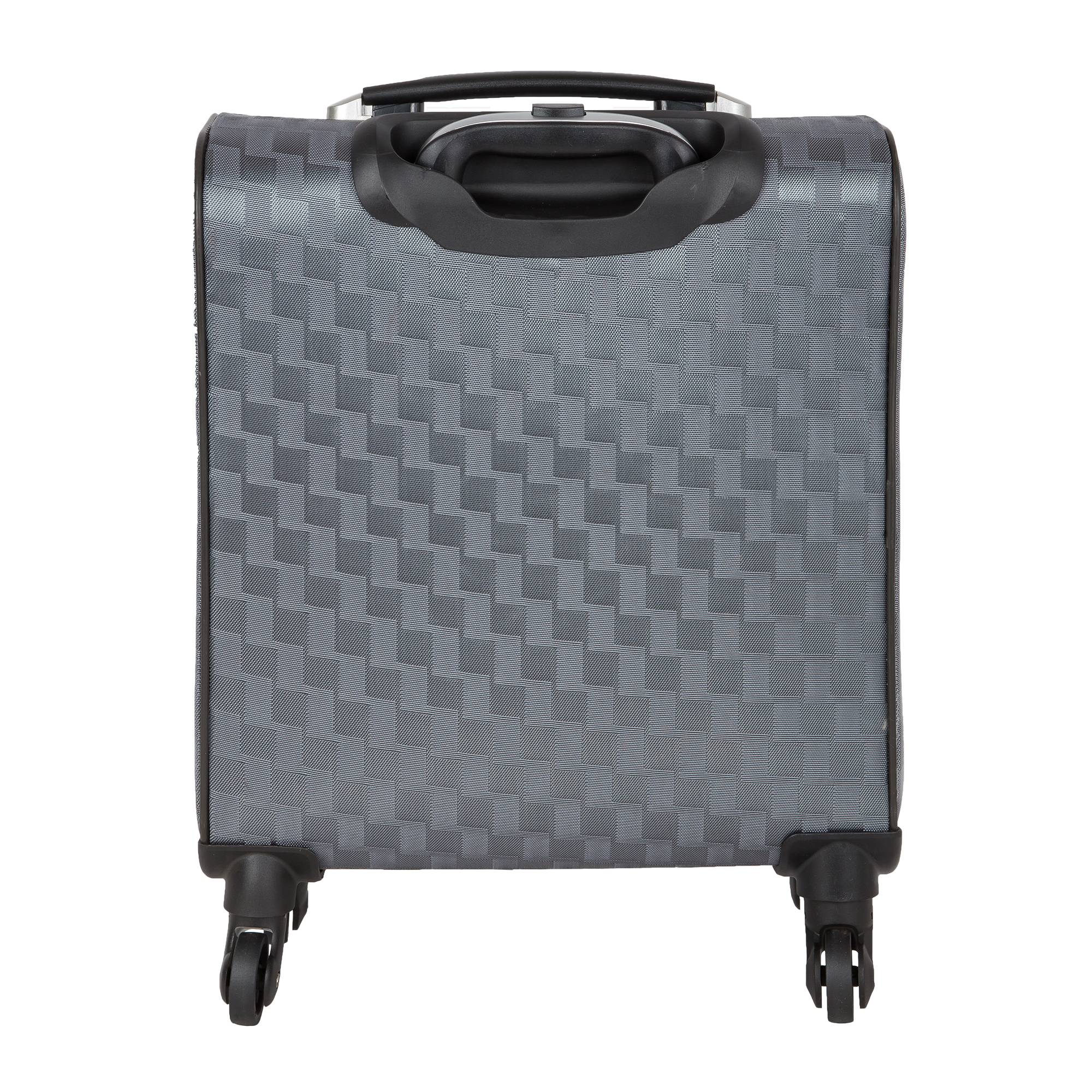 Чемодан от компании "Polar" на четырёх колёсах выполнен из прочного материала (нейлона и полиэстера). Подходит как ручная кладь. Чемодан закрывается на молнию, присутствует также встроенный кодовый замок.Внутри есть одно большое отделение , в котором присутствуют ремни для фиксации вещей, отделение для ноутбука и маленький карман на молнии для документов. Снаружи расположен объёмный карман на молнии для мелких вещей. У чемодана есть небольшая ручка для переноски и металлическая ручка, которая выдвигается на 55см.