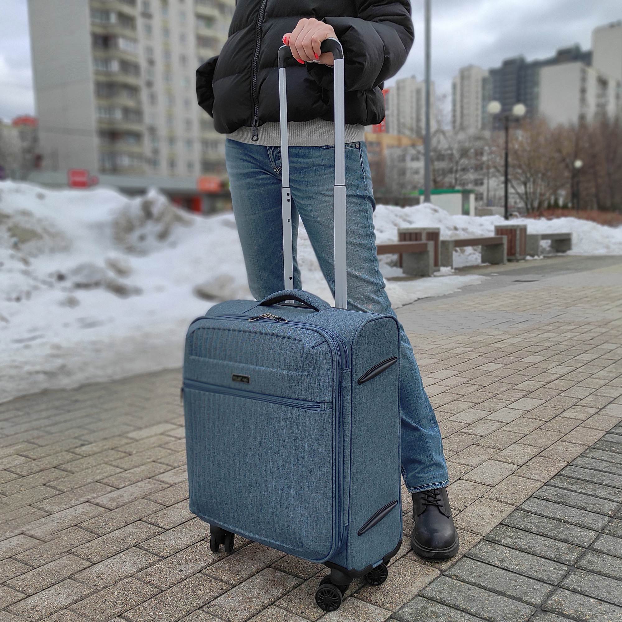 Стильный чемодан модной расцветки имеет в наличии две ручки для переноски сбоку и сверху чемодана, а также выдвижную ручку- тележку. Чемодан имеет 4 двойных колеса с подшипниками, которые вращаются на 360 градусов, это делает чемодан очень маневренным и позволяет легко перемещать багаж.