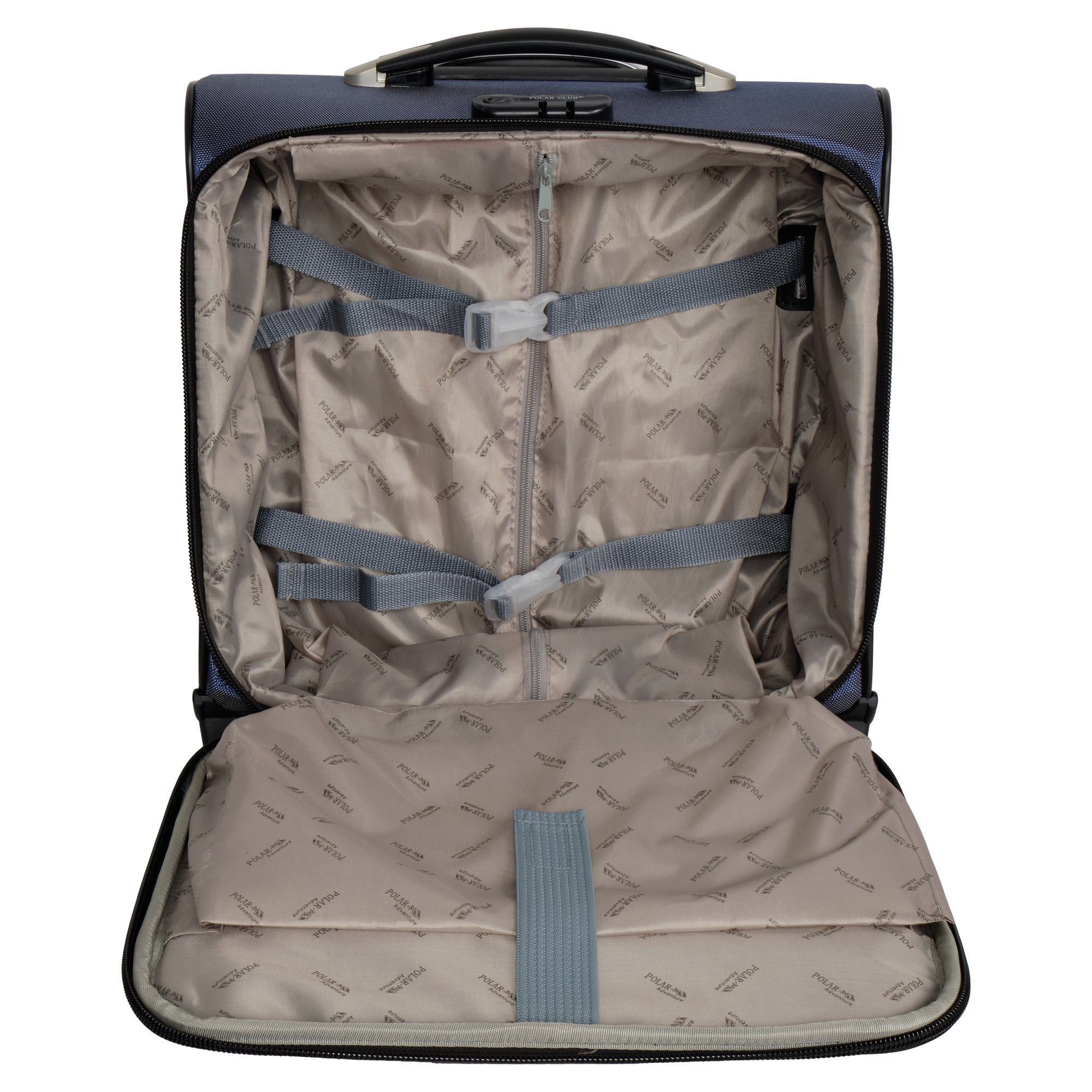Чемодан от компании "Polar" на двух колёсах выполнен из прочного материала (нейлона и полиэстера). Подходит как ручная кладь. Чемодан закрывается на молнию, присутствует также встроенный кодовый замок.Внутри есть одно большое отделение , в котором присутствуют ремни для фиксации вещей, отделение для ноутбука и маленький карман на молнии для документов. Снаружи расположен объёмный карман на молнии для мелких вещей. У чемодана есть небольшая ручка для переноски и металлическая ручка, которая выдвигается на 67 см..