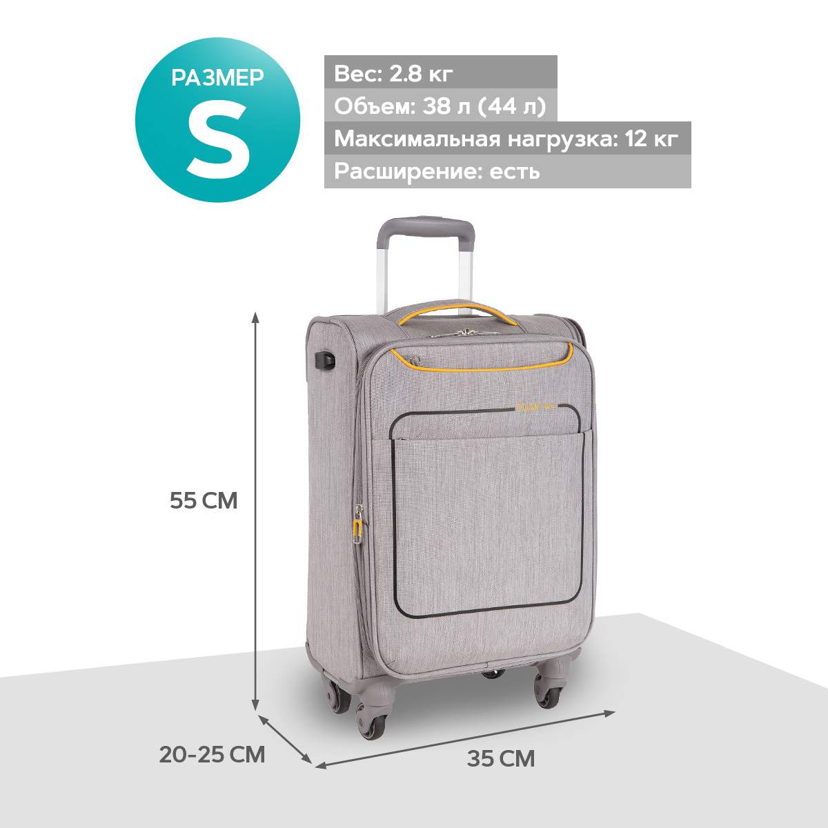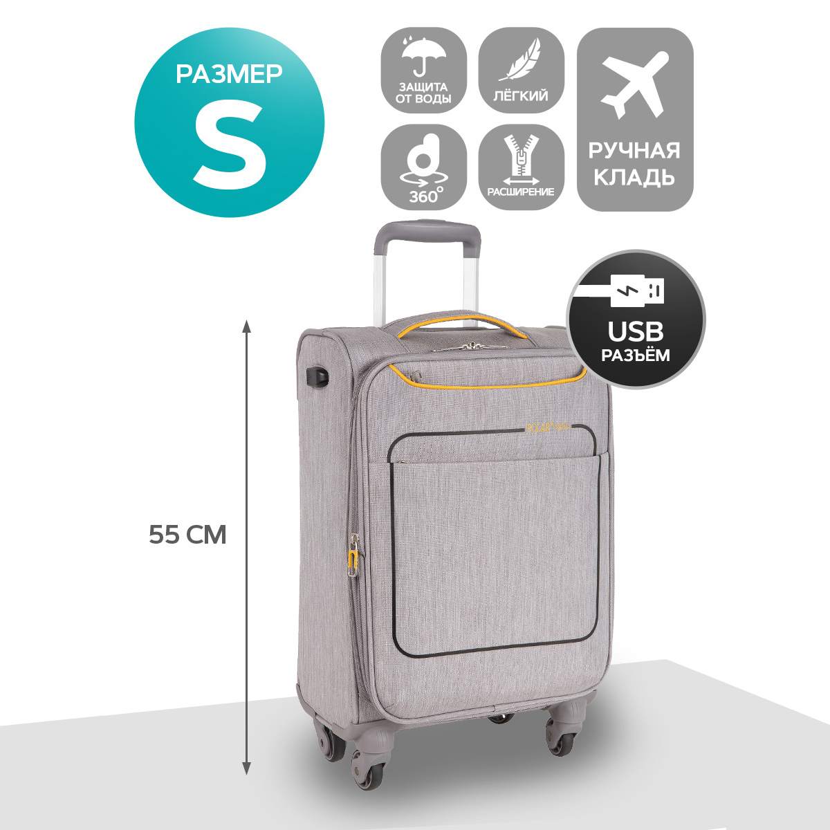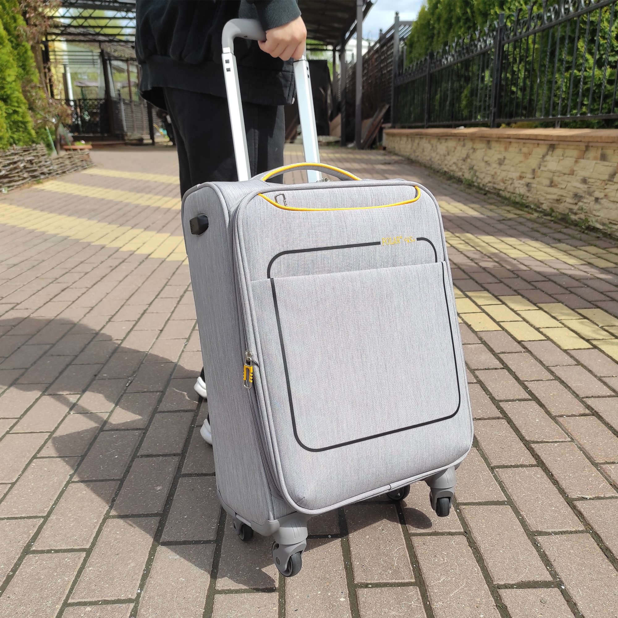 Чемодан фирмы Polar. Подходит как Ручная кладь. Внутри имеются фиксирующие ремни и карман на молнии. Так же внутри есть два сетчатых кармана с внешним выходом USB для подзарядки от powerbank. Основное отделение можно увеличить в объеме, расстегнув молнию, при этом чемодан увеличивается в глубину на 5 см. Максимальный объем при увеличении 45.6 л.. Ручка выдвигается в два сложения до 105 см и расположена внутри корпуса чемодана. Снаружи на передней стенке — два больших кармана на молнии и один боковой карман.На задней стенке чемодана предусмотрено крепление для выдвижной ручки большого чемодана. Надежные четыре колеса на подшипниках, вращаются на 360° градусов.