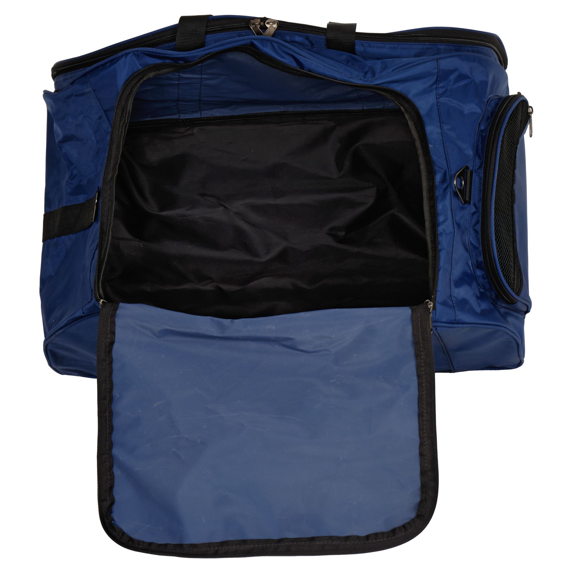 с непромокаемым ПВХ покрытием. Состоит из одного большого вместительного отделения и бокового. Впереди сумки большой накладной и дополнительный карман. Все карманы закрываются надежной молнией тип 8. Внутренняя тележка, ручка которой выдвигается на 25 см. Колеса с подшипниками. Основное дно из ПВХ толщиной 2 мм, усиленно пластиковыми салазками для жесткости и защиты от повреждений. Сумку можно переносить в руках с помощью двух ручек и на плече. Для прочности ручки прошиты до дна сумки как на одной, так и на другой стороне. В комплект входит съёмный регулируемый по длине ремень.