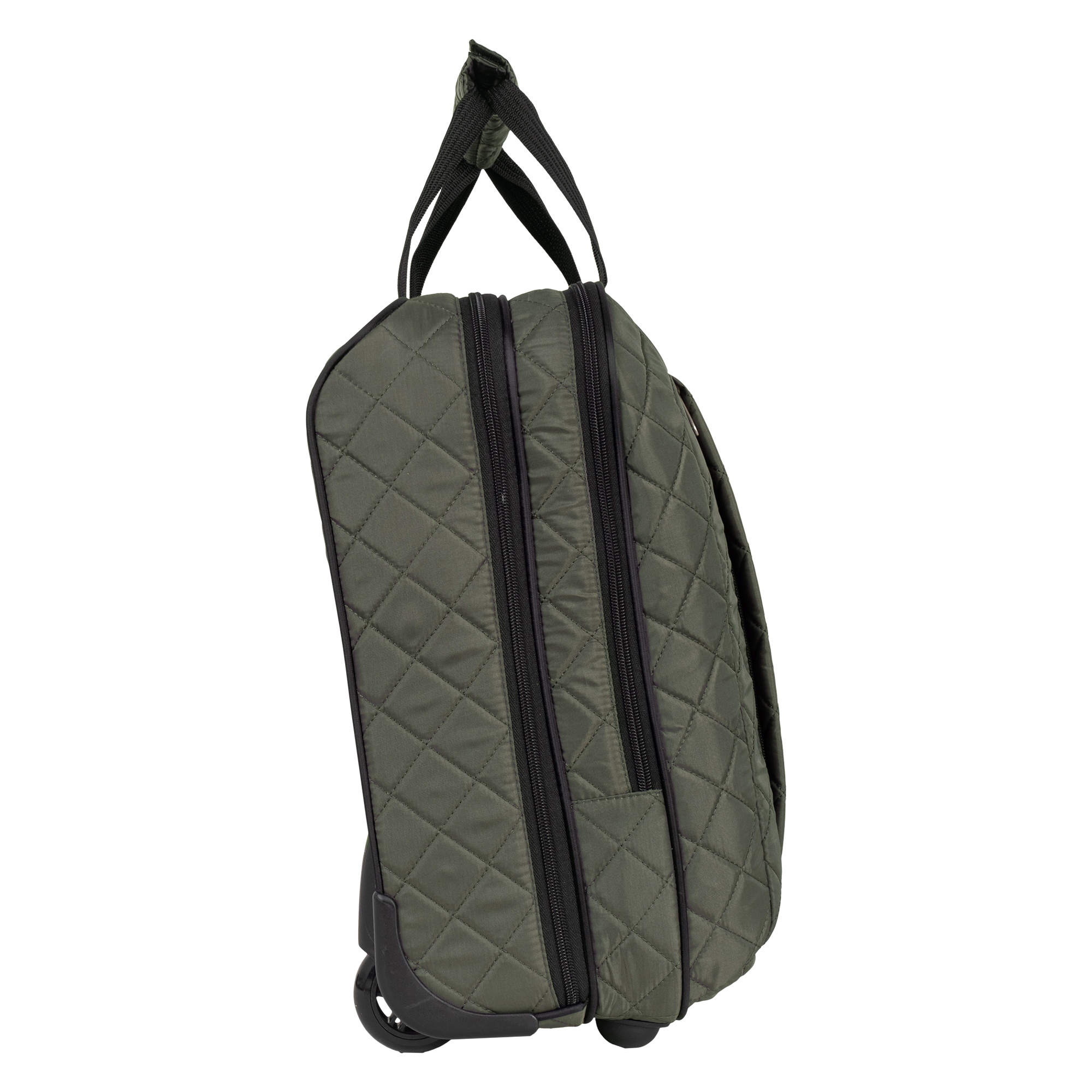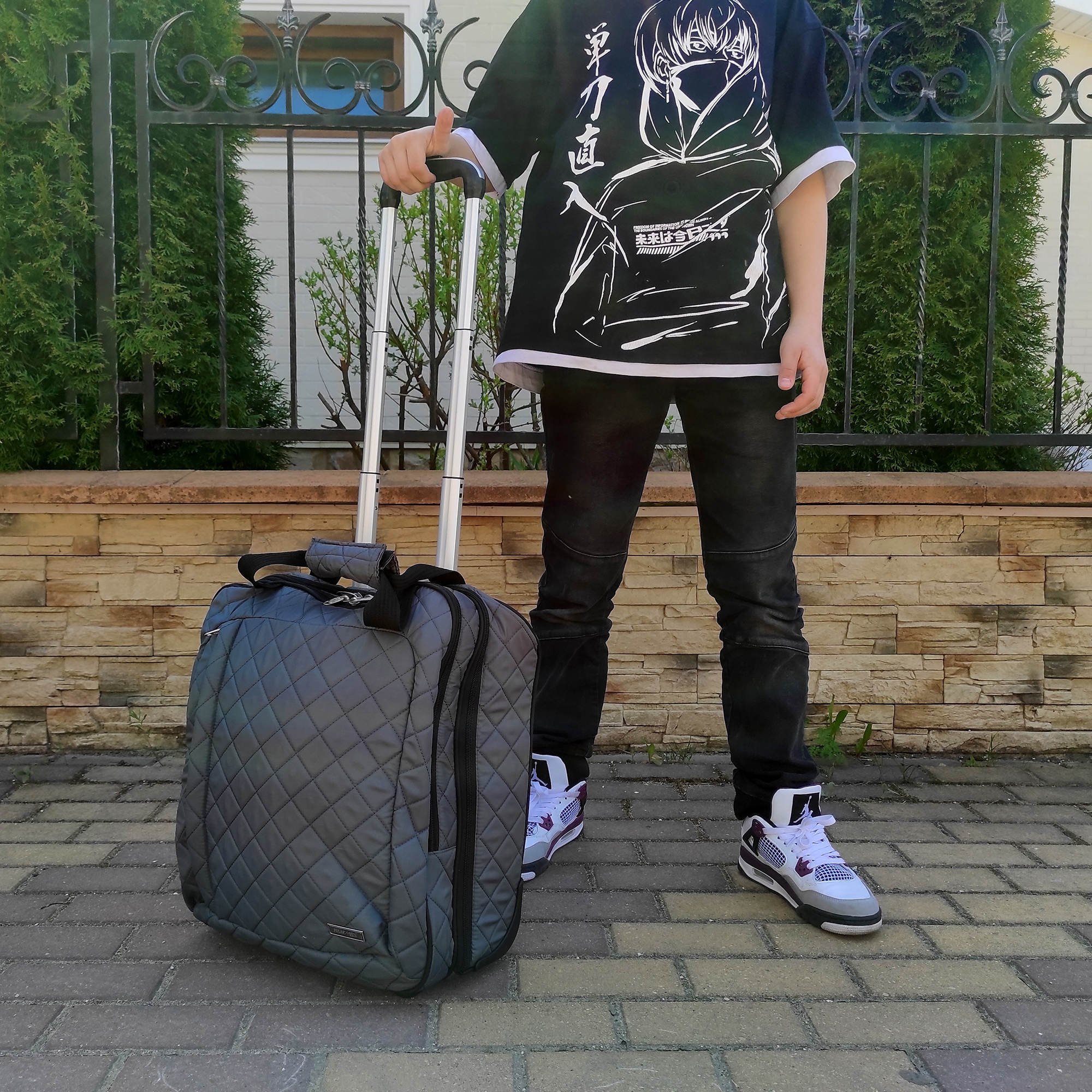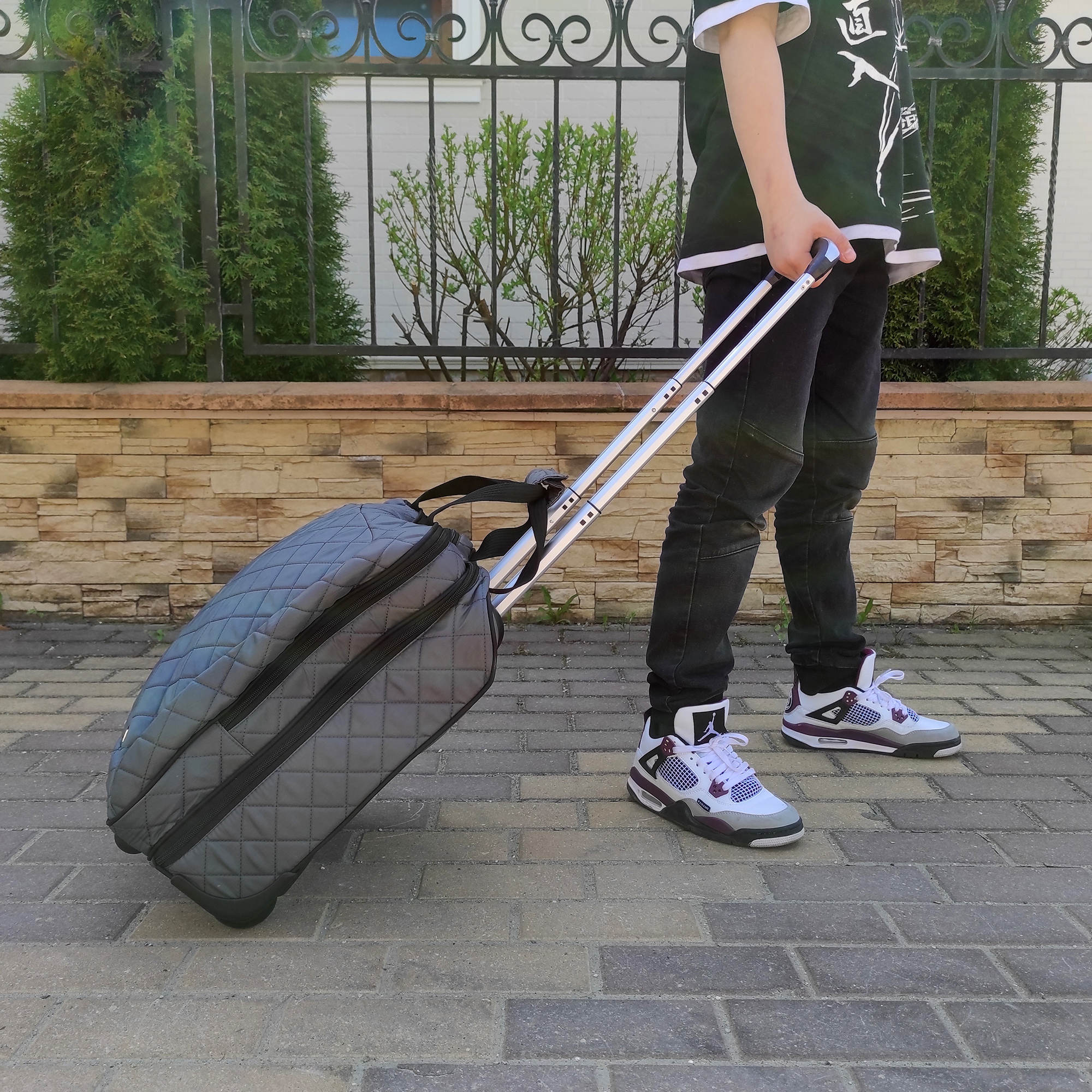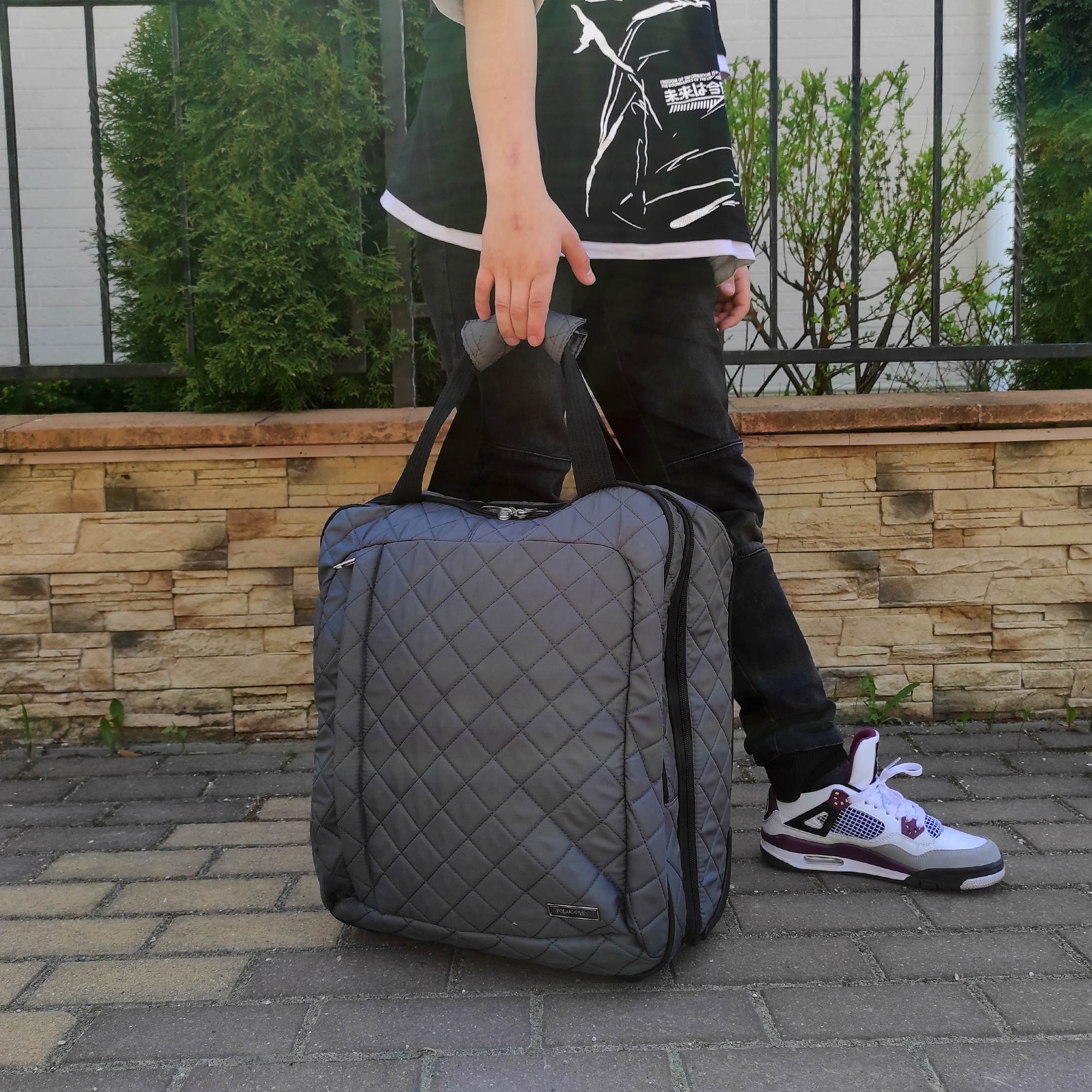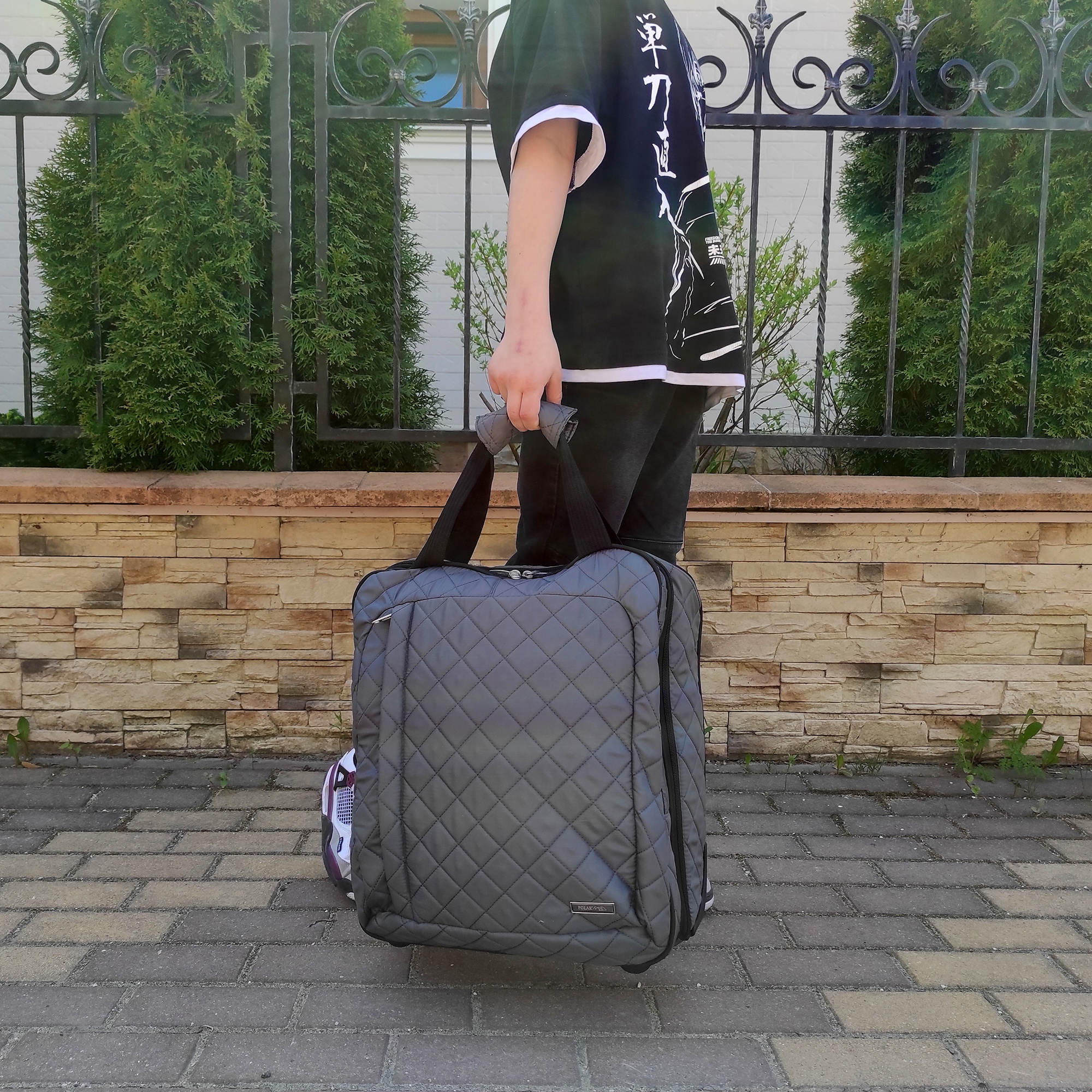 Колеса прорезиненные, дно дополнительно защищено от истирания. Сумка устойчиво стоит на ножках. Модель подходит под требования для ручной клади в большинство авиакомпаний.