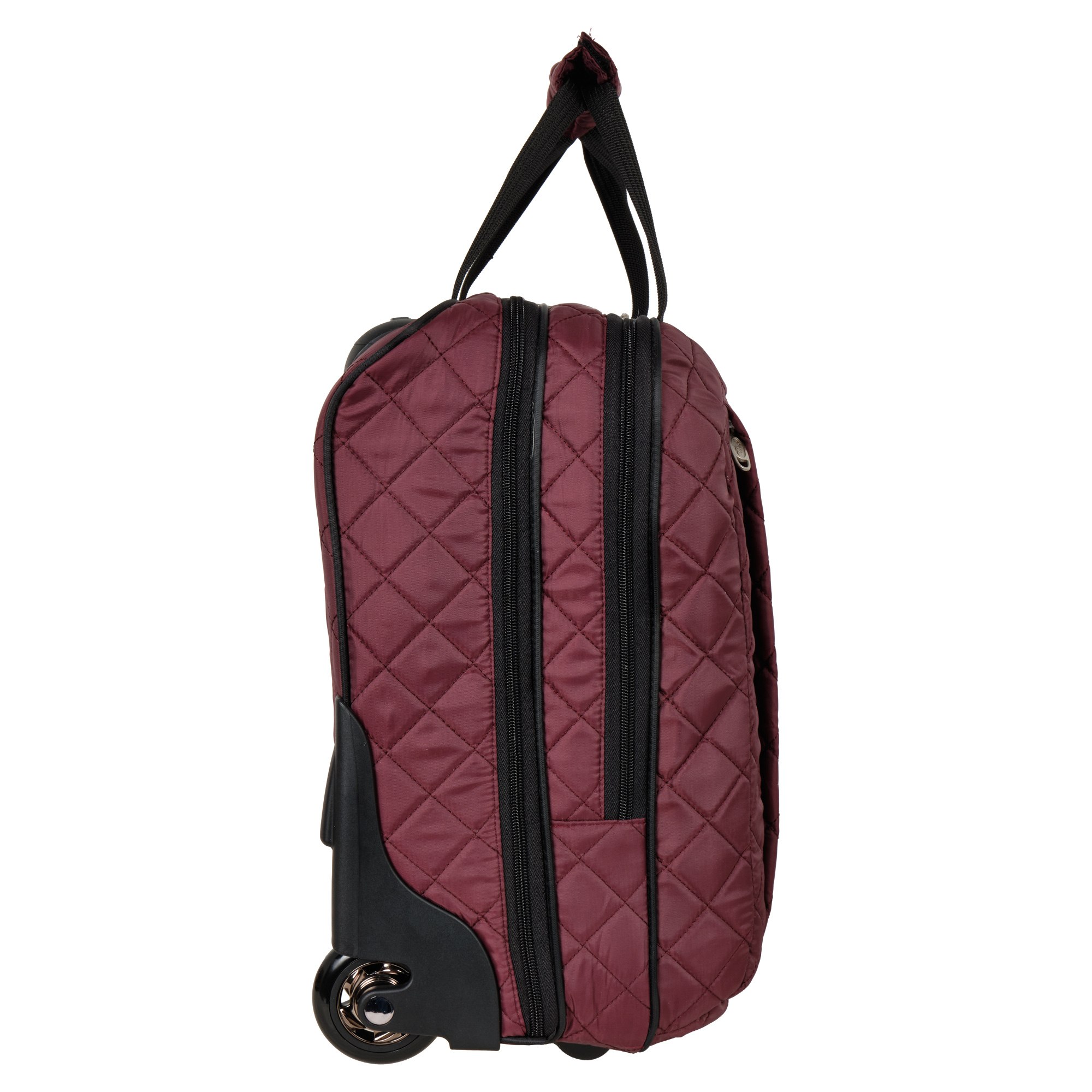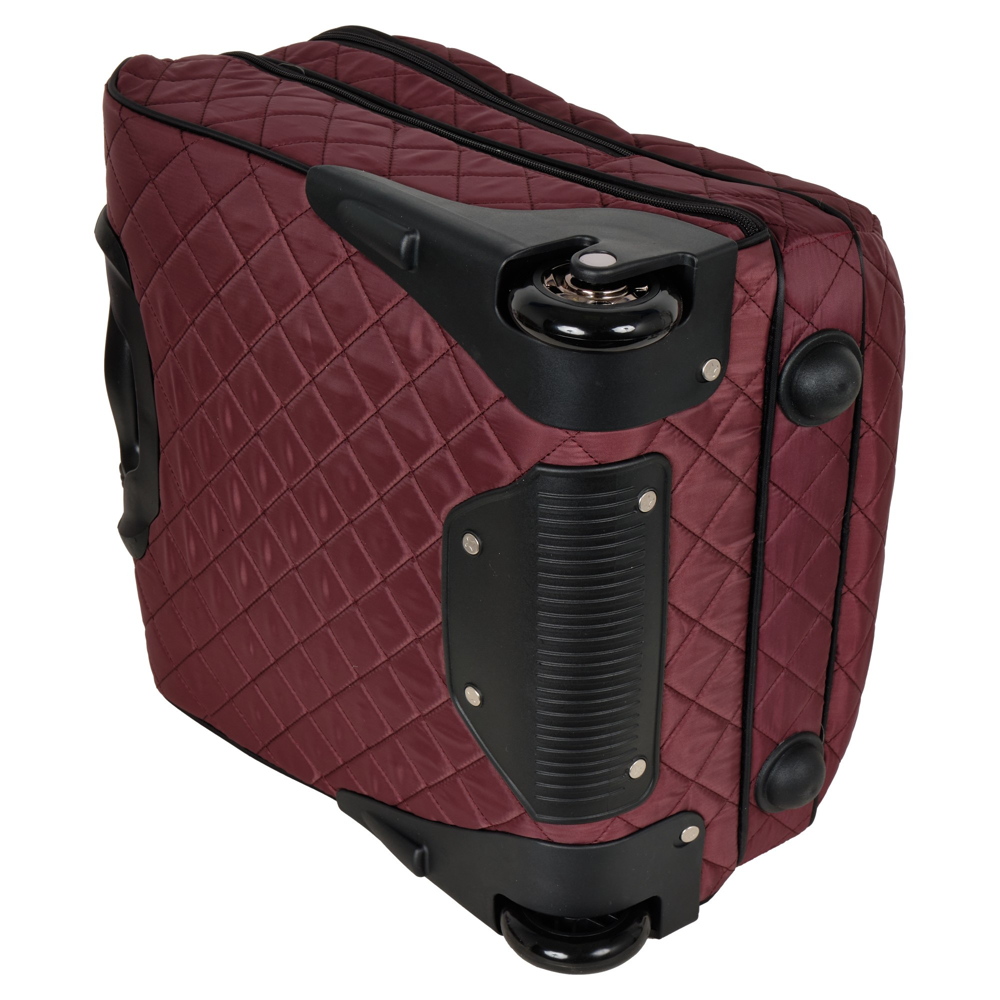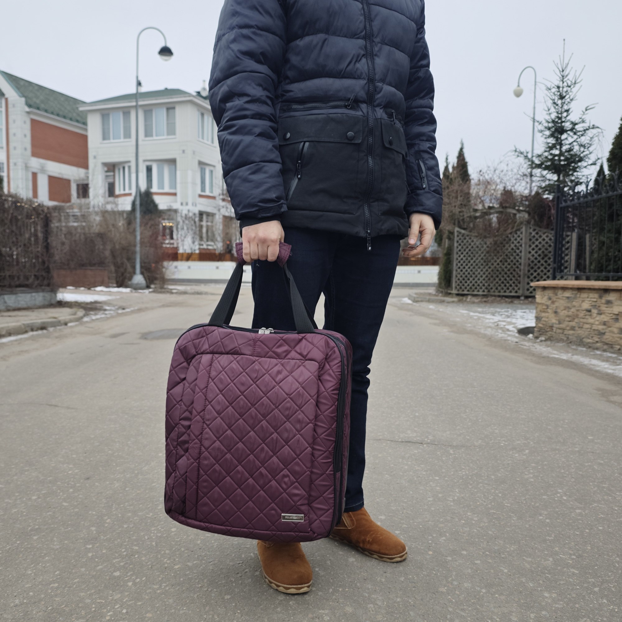 Колеса прорезиненные диаметр 8 см, дно дополнительно защищено от истирания. Сумка устойчиво стоит на ножках. Модель подходит под требования для ручной клади в большинство авиакомпаний.