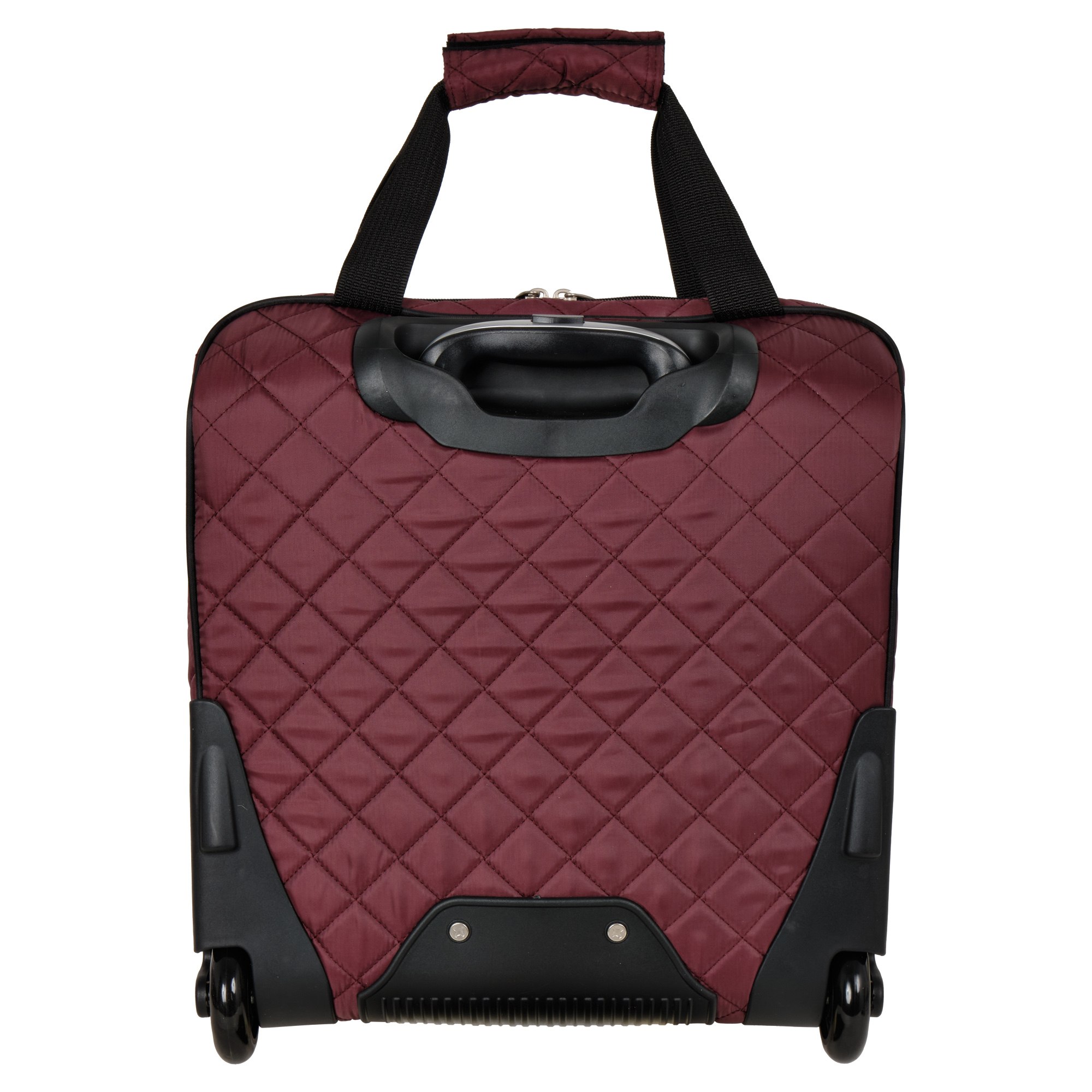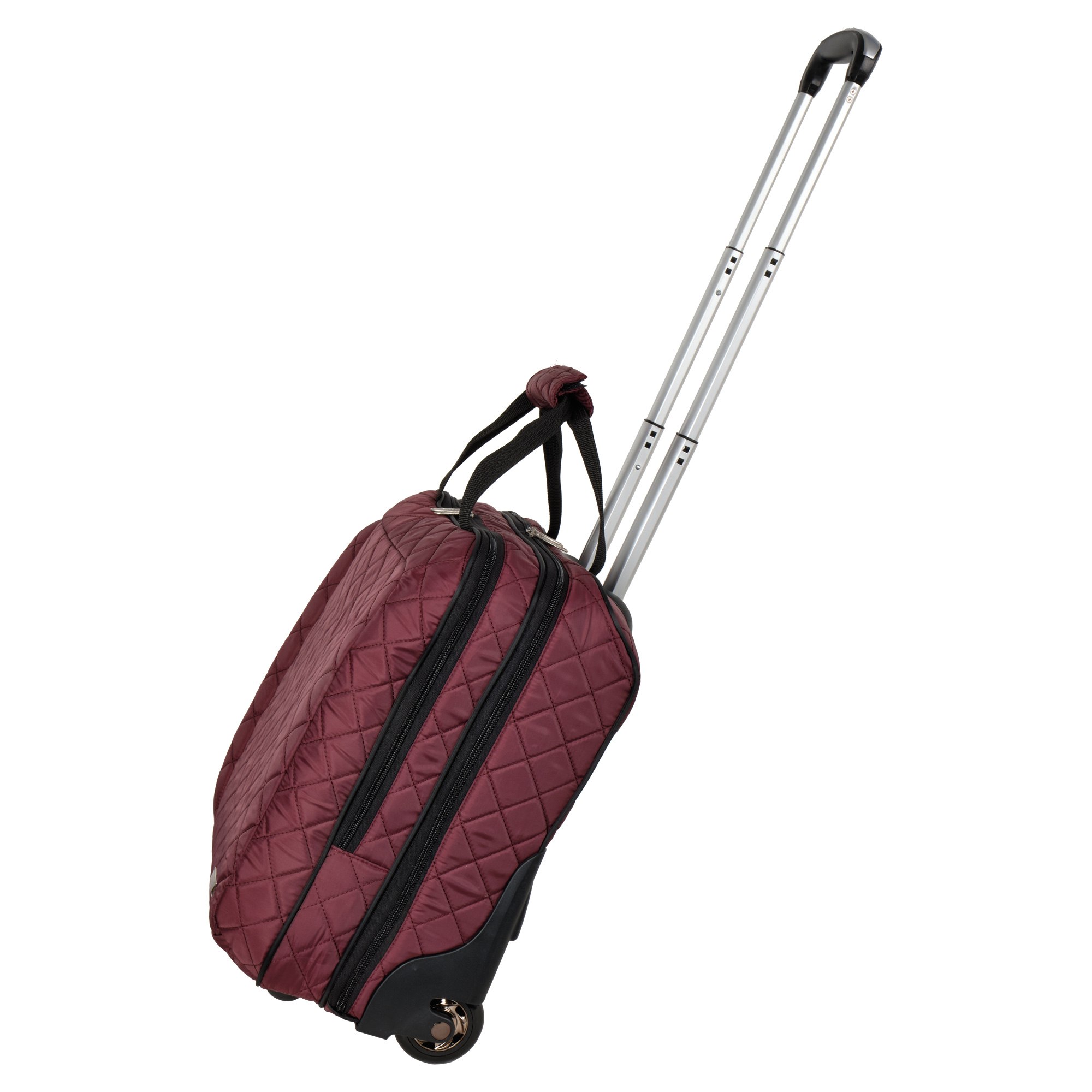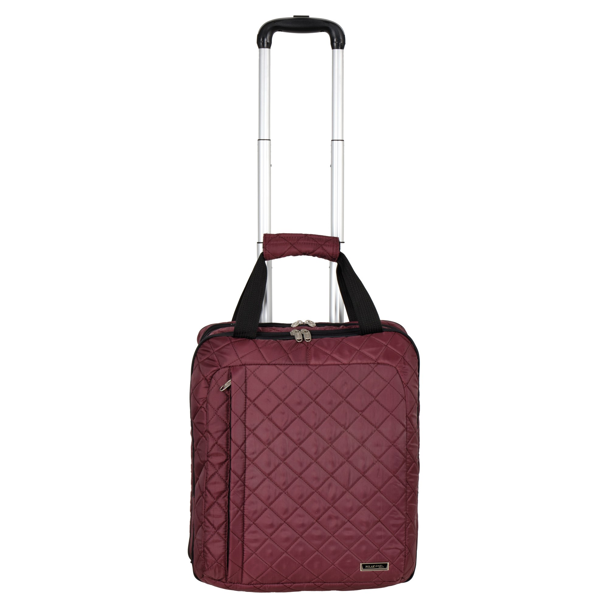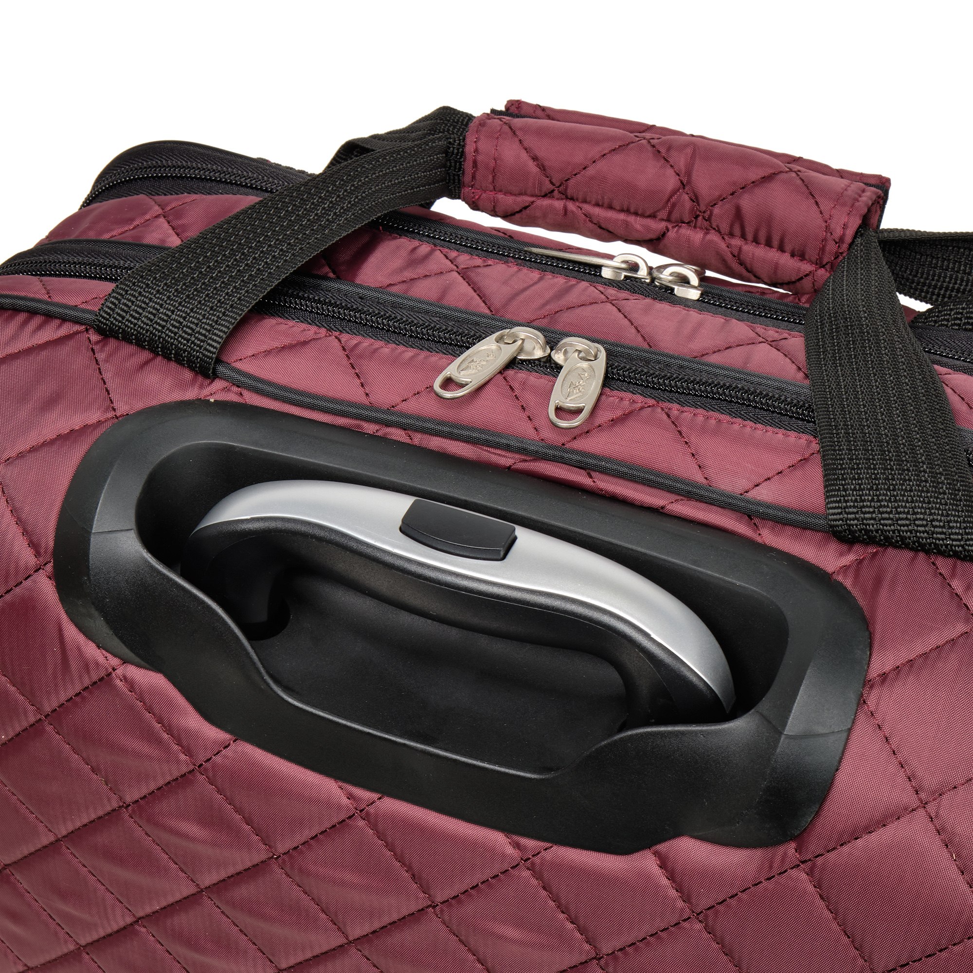 Колеса прорезиненные диаметр 8 см, дно дополнительно защищено от истирания. Сумка устойчиво стоит на ножках. Модель подходит под требования для ручной клади в большинство авиакомпаний.