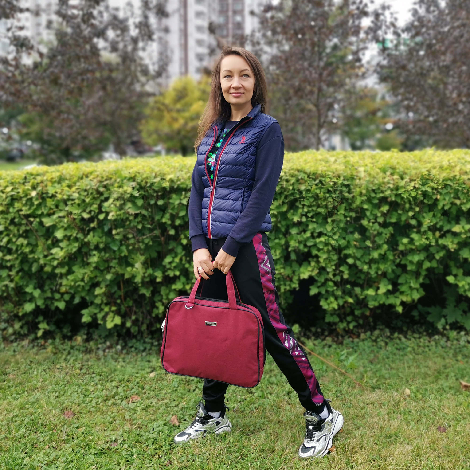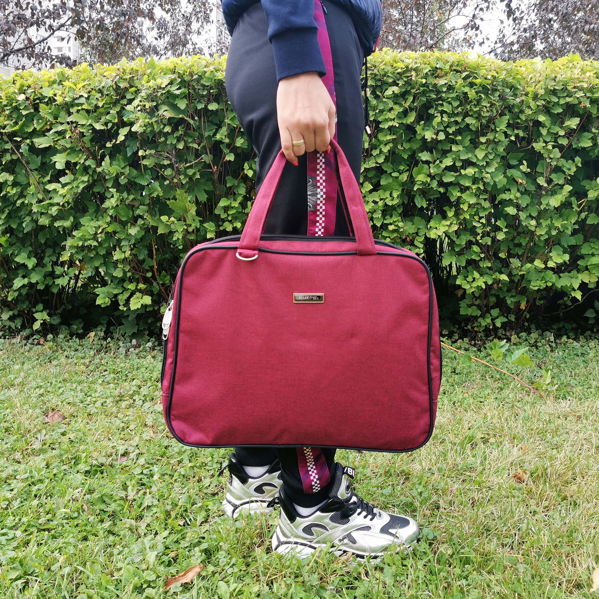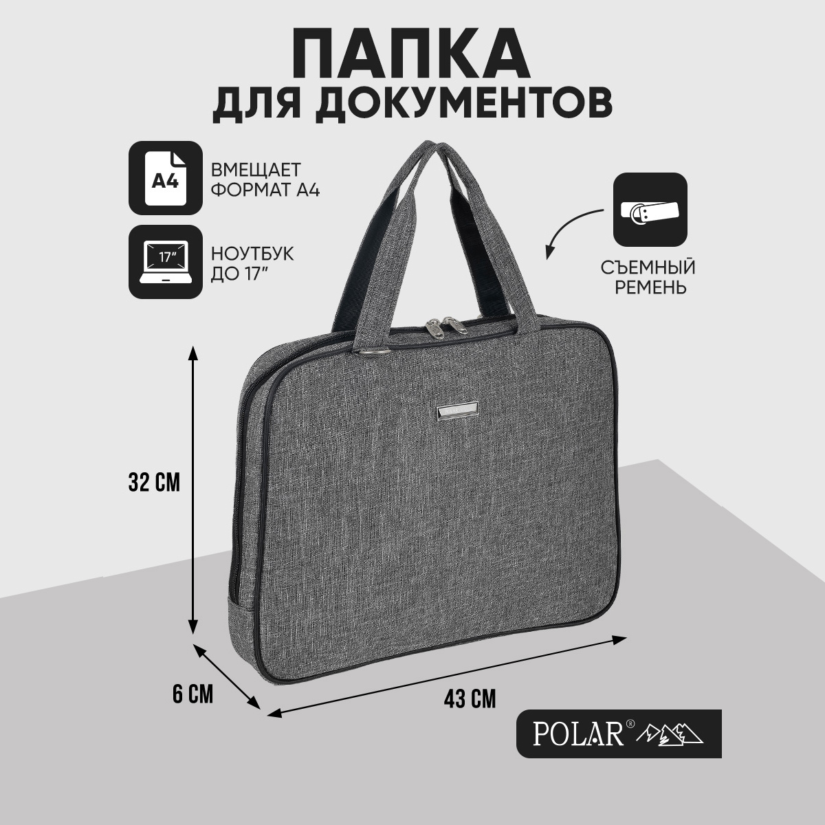 Стильная сумка-папка POLAR прекрасно подойдёт для деловых встреч и переговоров, модель выполнена в минималистичном дизайне и имеет универсальную расцветку, которая прекрасно сочетается как с повседневной одеждой, так и с офисным дресс-кодом. Сумка состоит из основного отделения, в которое прекрасно поместится ноутбук диагональю 17". У папки есть две ручки для переноски, высота которых составляет 17 см и съёмный регулируемый ремень, длина 110 см. Обратите внимание, папка имеет форму трапеции, размер по дну 43 см, размер по верху (узкой части) 39 см.