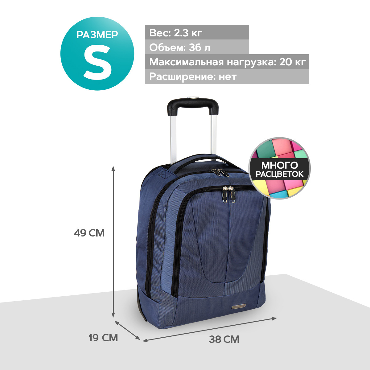 Колеса прорезиненные, дно дополнительно защищено от истирания. Сумка устойчиво стоит на ножках. Модель подходит под требования для ручной клади в большинство авиакомпаний с ограничениями по размерам 50X40X20 см, а линейный размер (сумма трех измерений равен 106 см).