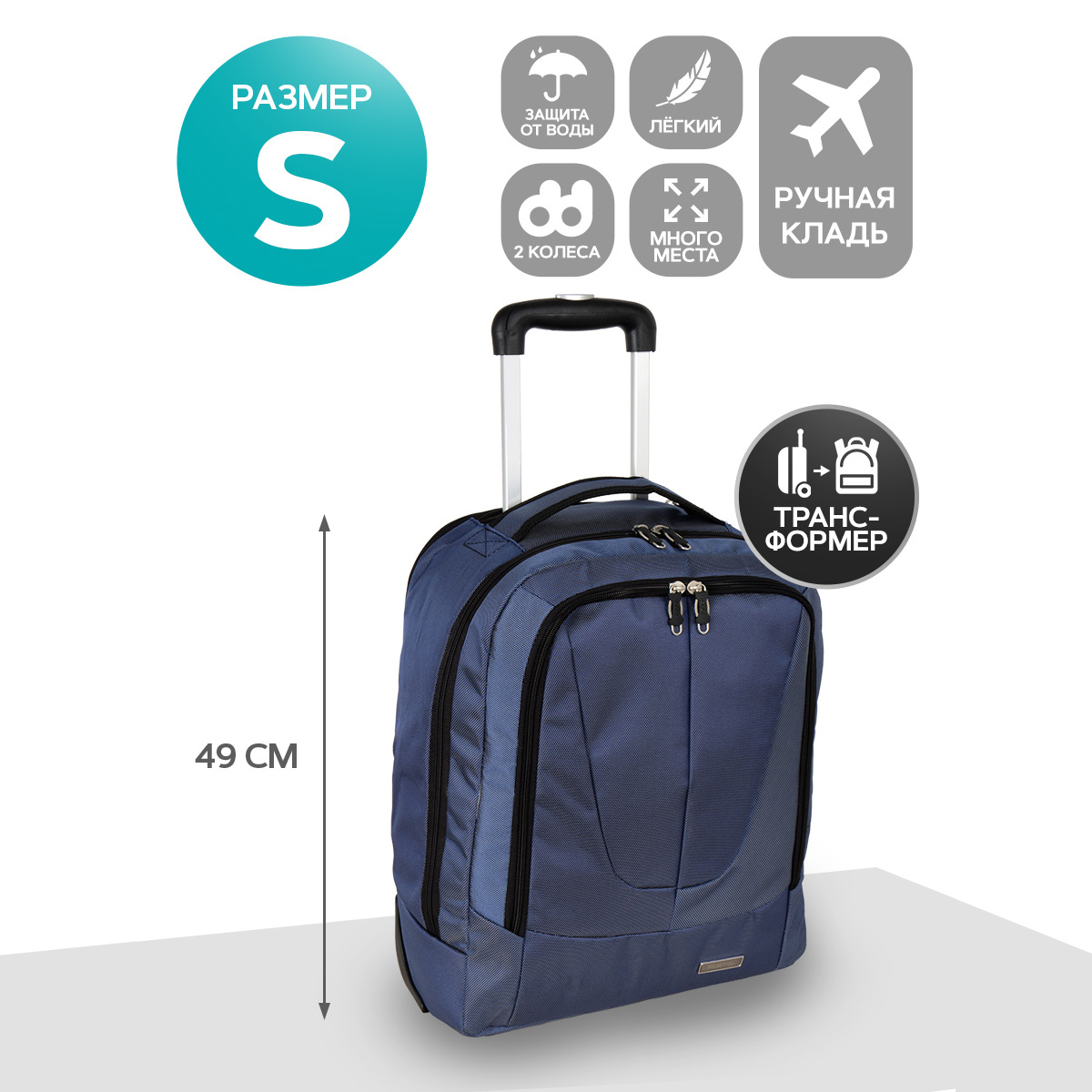 Ручка – тележка выдвигается на 50 см, и ее также можно убрать под молнию. Также есть удобная ручка для переноски.