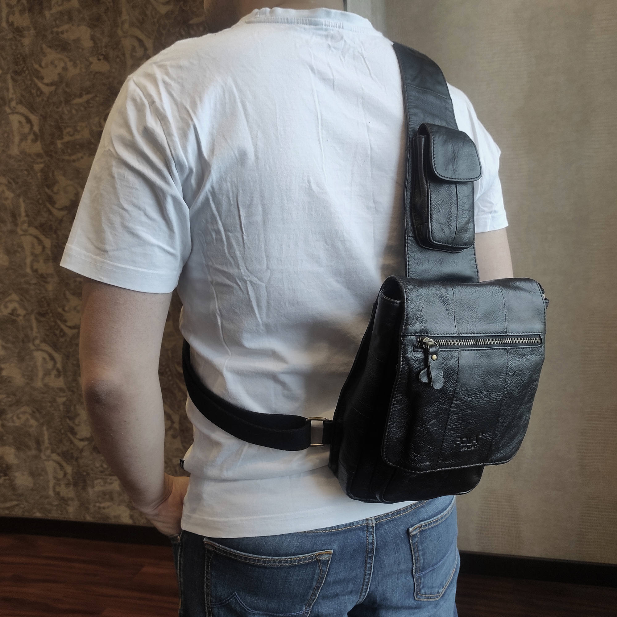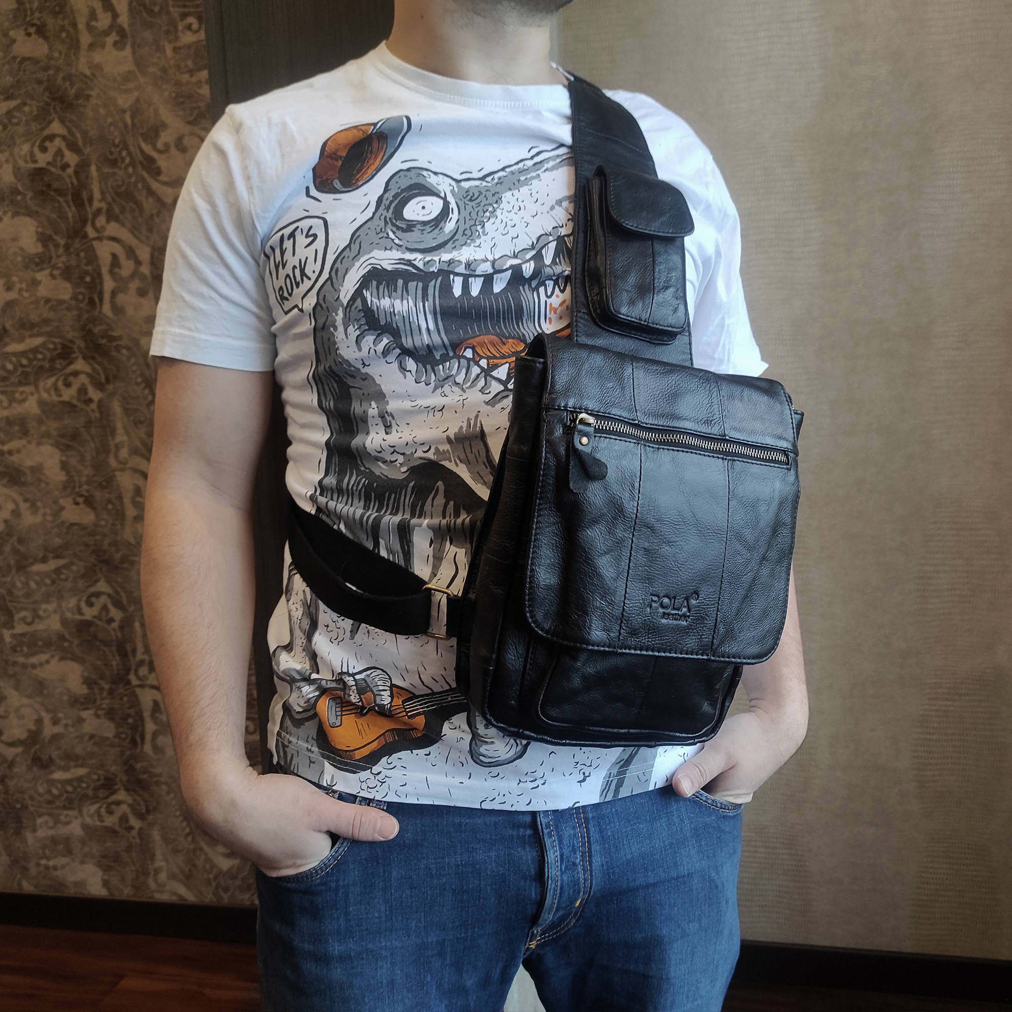 Сумка предназначена для переноса на плече и предусмотрена одна ременная лямка. Одно большое отделение и накладной карман на молнии. Внутри – карман на молнии для документов и два открытых кармашка. Карман на молнии сзади сумки. На лямке расположен карман под мобильный телефон. Лямка регулируется по необходимой Вам длине.