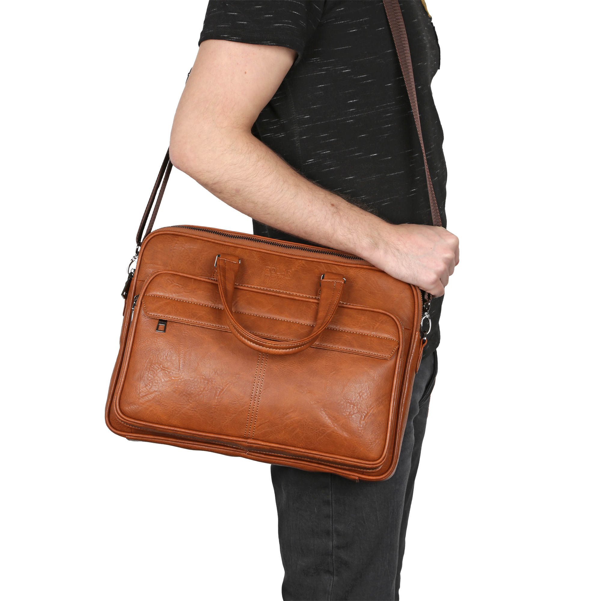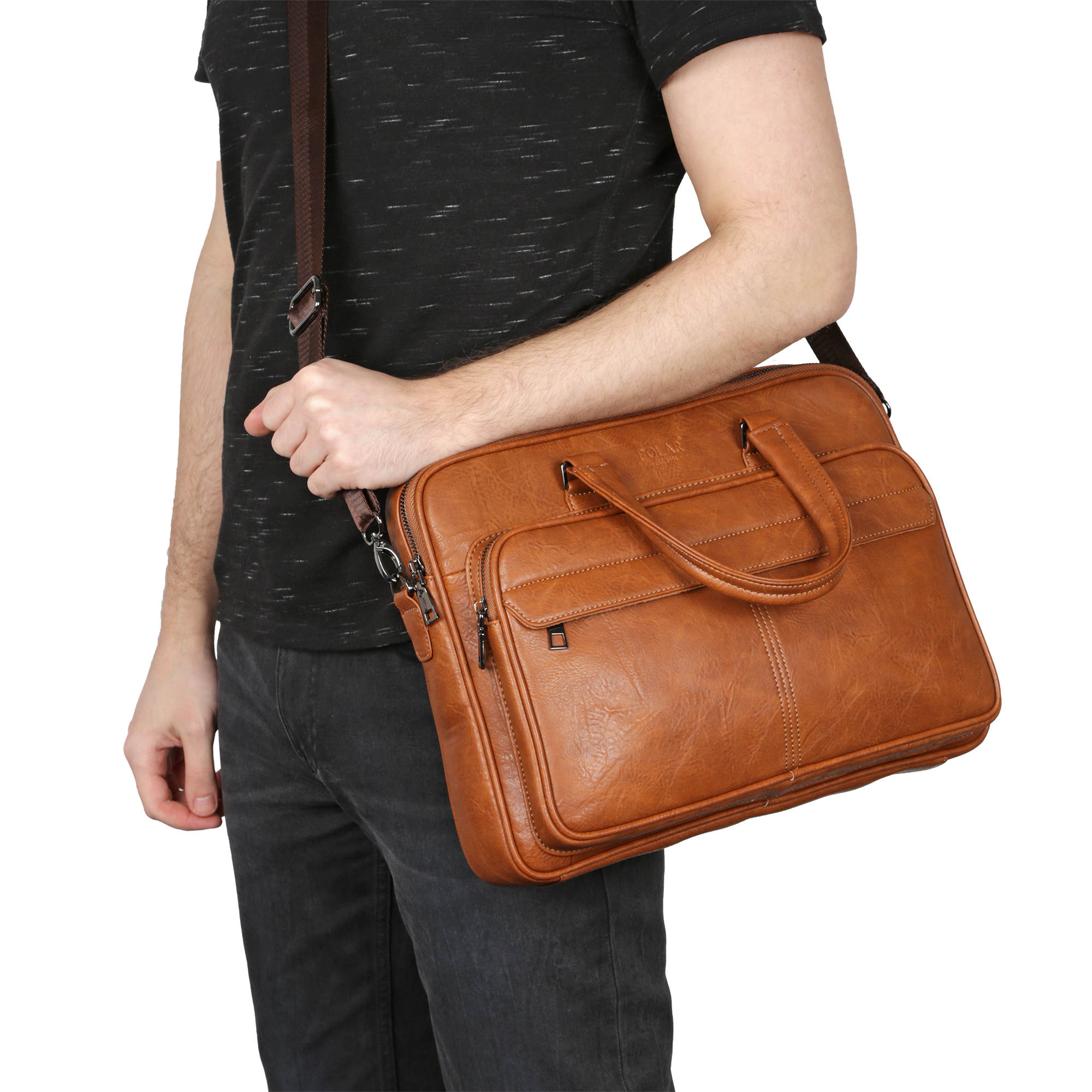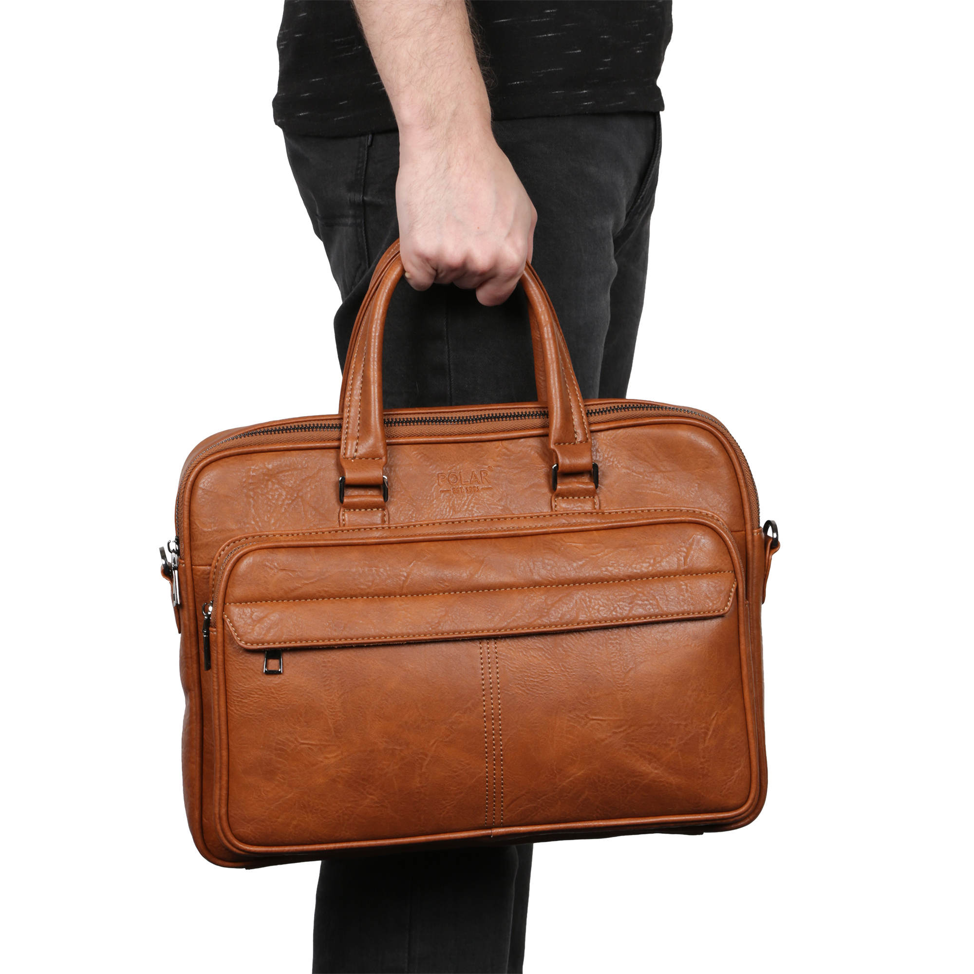 Мужской портфель фирмы Polar выполнен из экокожи. Портфель имеет одно основное отделение, которое закрывается на металлическую молнию. Внутри есть отделение для электронных устройств или ноутбука с диагональю до 15” и открытый кармашек. Модель вмещает формат A4. Спереди есть большой вместительный карман на молнии. Сзади сумки есть также карман на молнии. Высота ручек 15 см, в комплекте есть регулируемый наплечный ремень, максимальная длина 140 см.