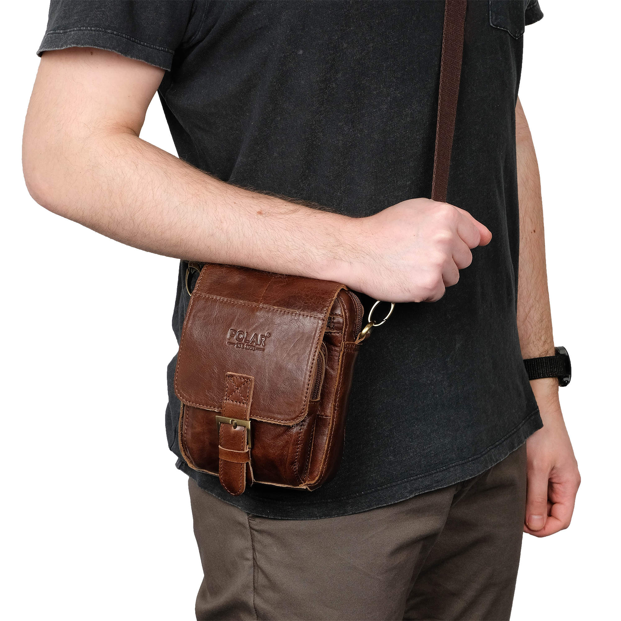 Мужская сумка фирмы Polar из натуральной кожи для документов. Основное отделение закрывается на молнию и клапаном с магнитной кнопкой. Внутри основного отделения один кармашек на молнии и открытый для мелочей. Спереди сумки накладной карман на молнии, на задней стенке также есть карман на молнии для нужных мелочей. Плечевой ремень съемный, регулируемый по максимальной длине 143 см. Сумку можно носить как на поясе, так и на плече. Эта модель отлично подойдет для документов, ключей, мобильного телефона и прочих мелочей.