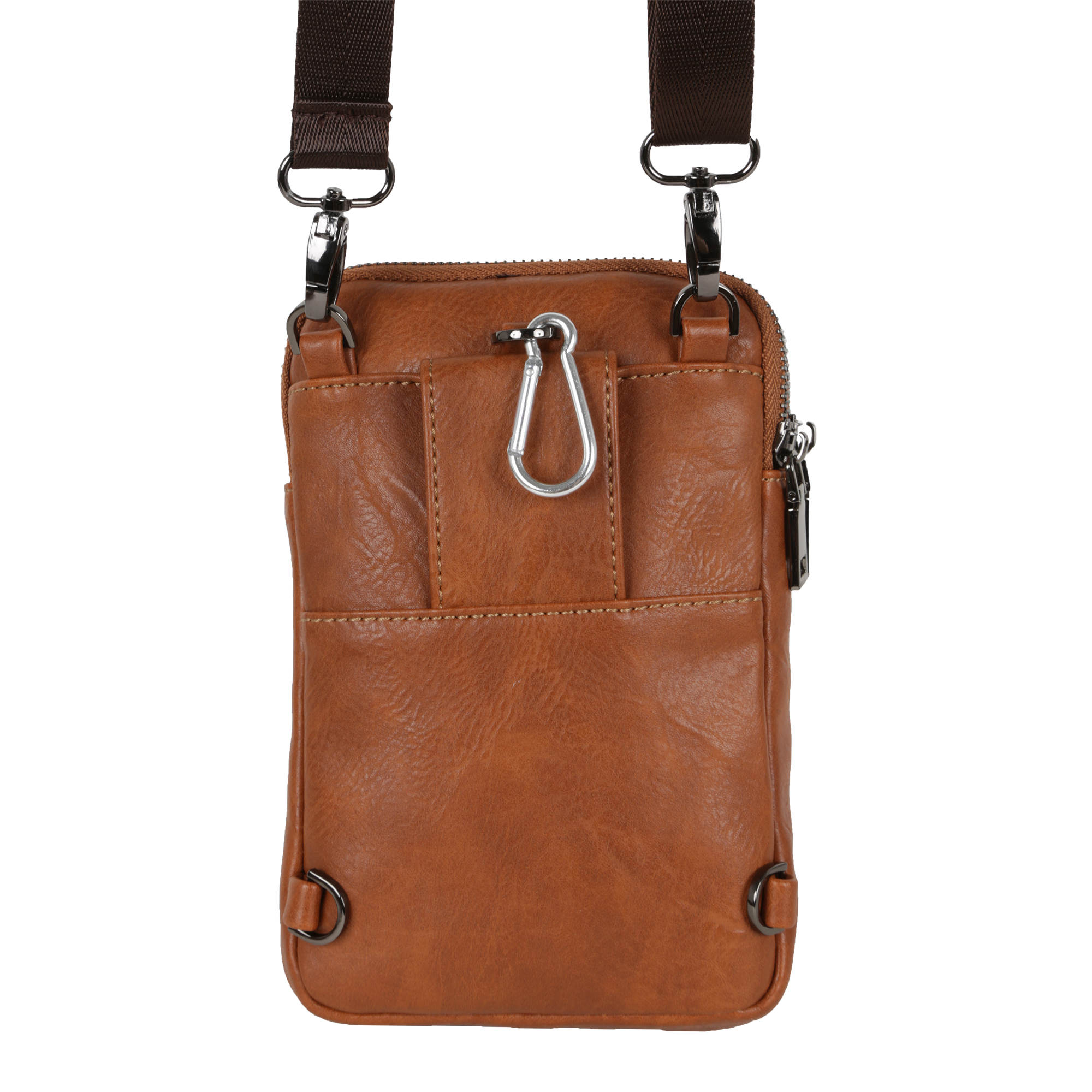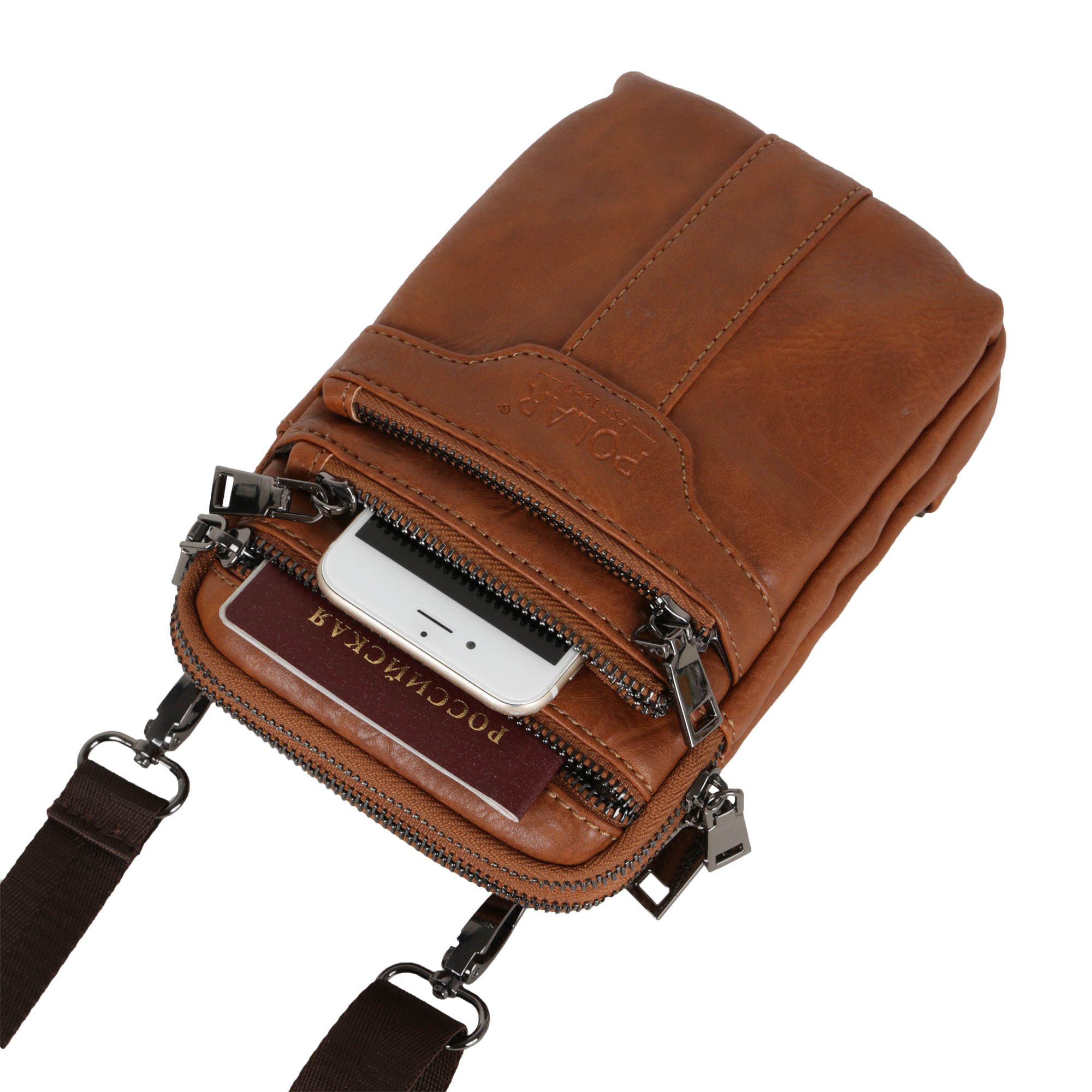 Мужская сумка фирмы Polar имеет небольшие размеры и при этом достаточно вместительная. Модель можно носить разными способами: на длинном регулируемом ремне кросс-боди и на поясном ремне с помощью поясной манжеты. Также сумку можно при помощи карабина закрепить на шлевку джинсов.  Сумка имеет два независимых отделения, которые закрываются на металлическую молнию. Внутри одного есть кармашек на молнии и открытый карман, внутри другого открытый кармашек. На передней стенке сумки три кармана на молнии, которые подойдут для хранения нужных мелочей, мобильного телефона и документов.