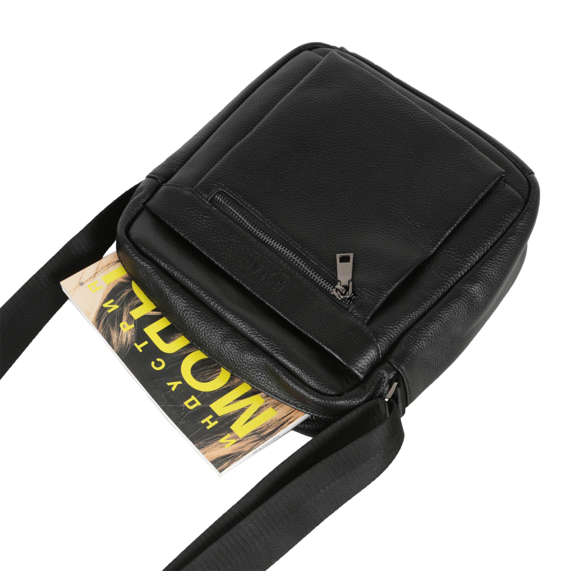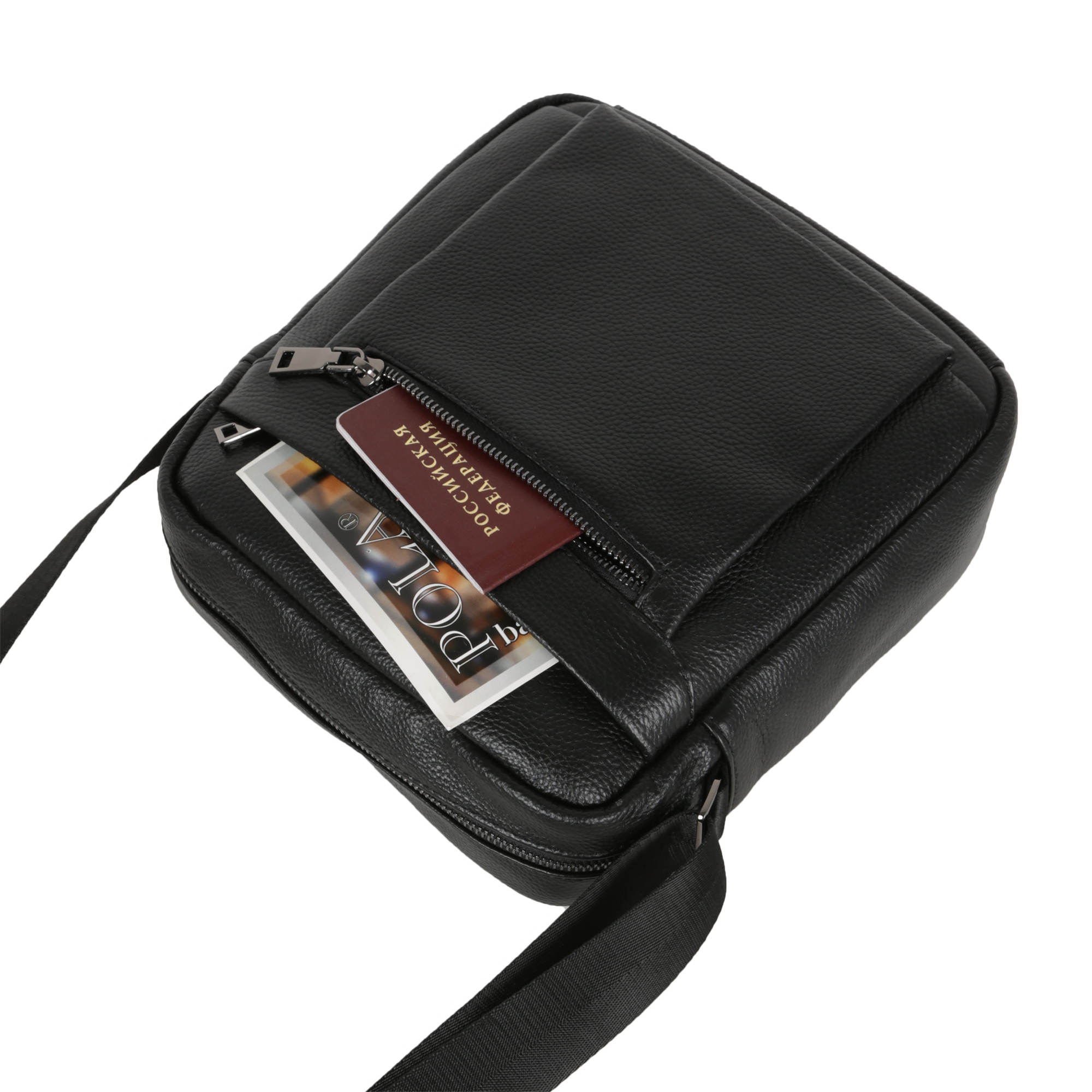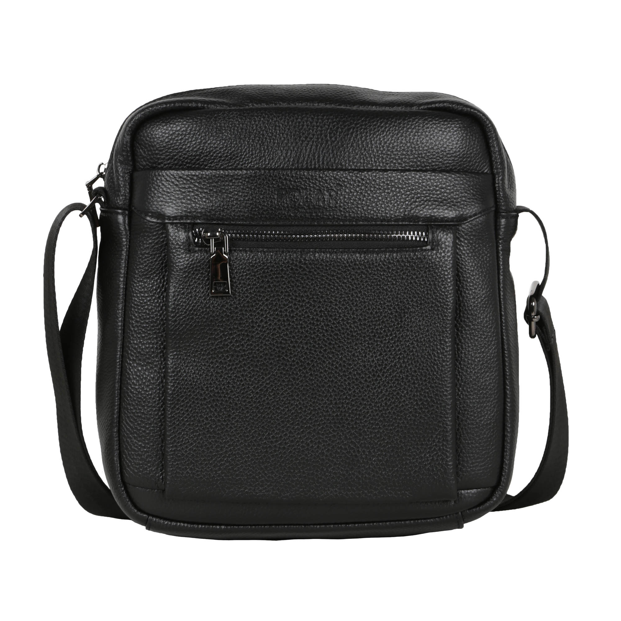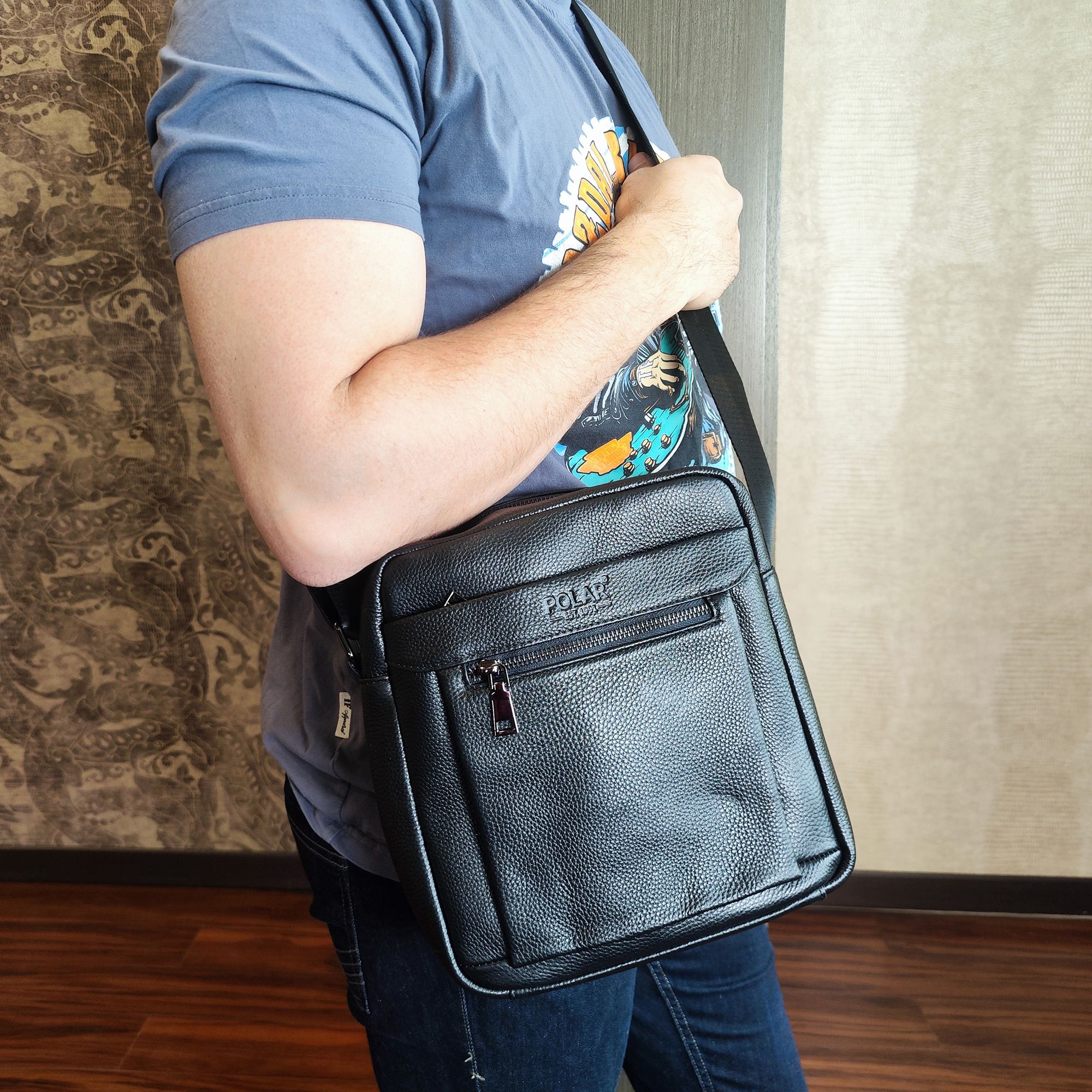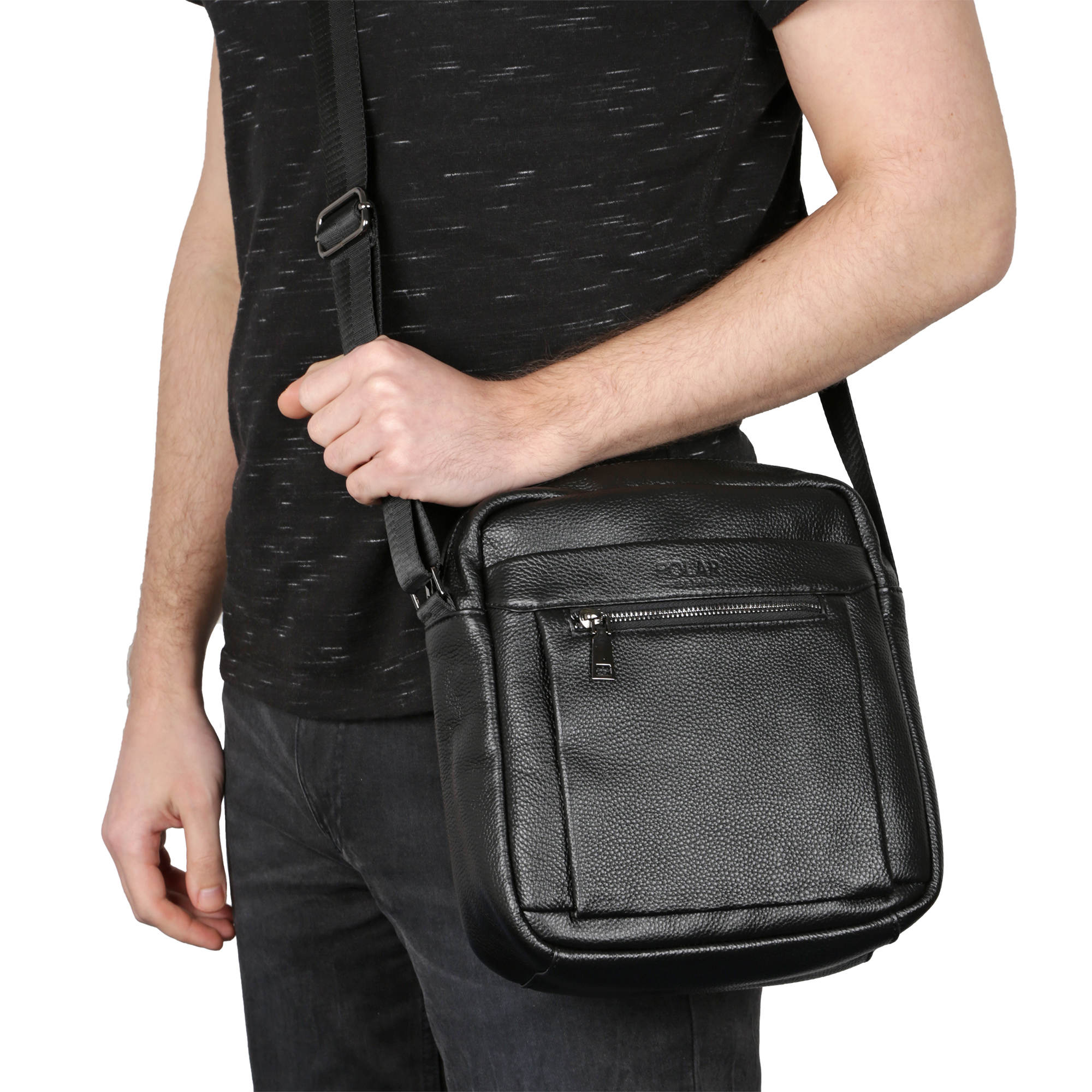 Сумка мужская фирмы Polar изготовлена из высокопрочной натуральной кожи. Основное отделение закрывается на молнию. Впереди два кармана на молнии и один сзади сумки. В основном отделении один дополнительный кармашек на молнии для документов и иткрытый карман для телефона. Имеется плечевой регулируемый ремень, максимальная длина 151 см.