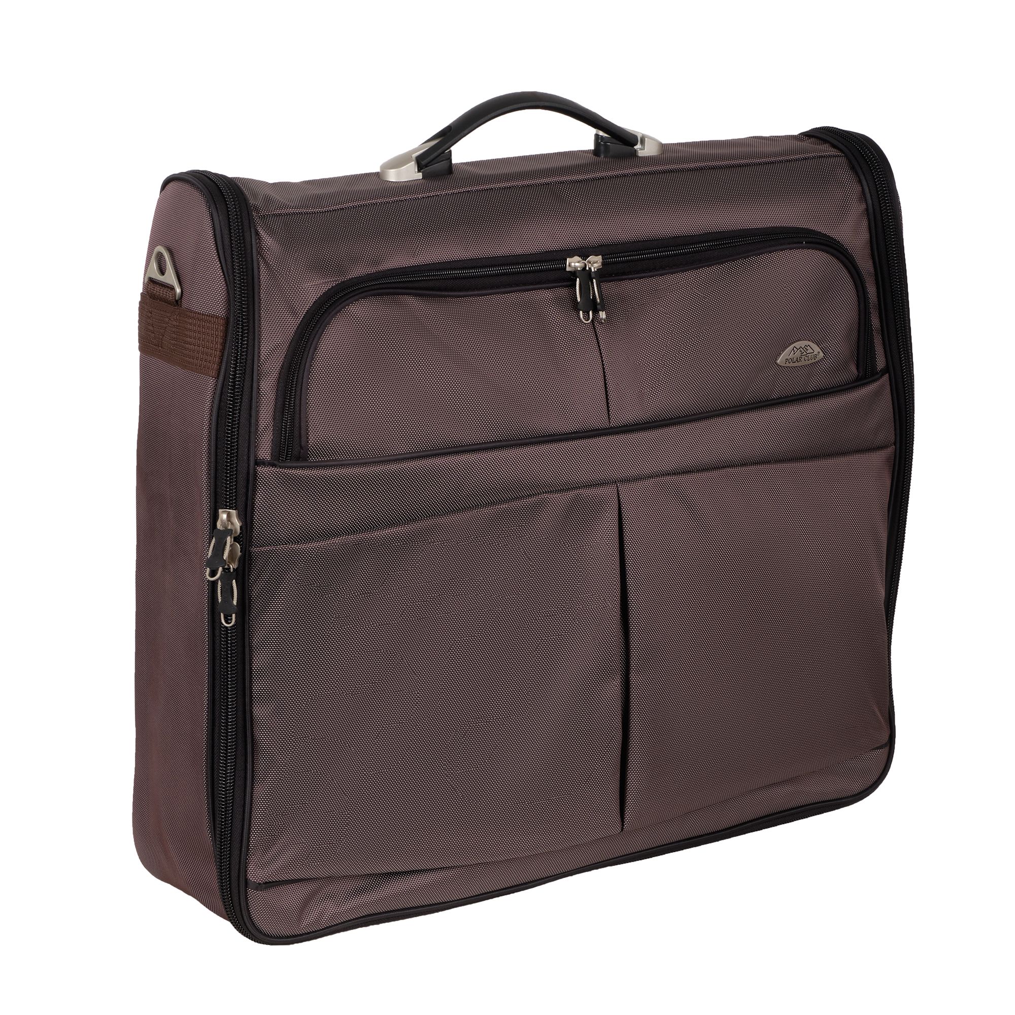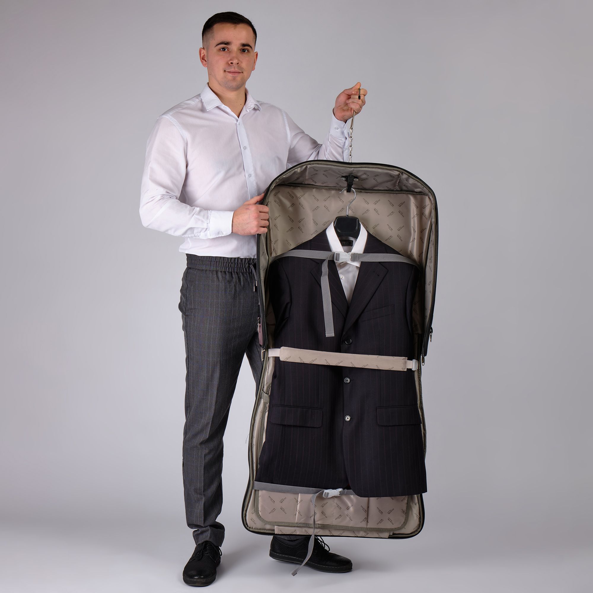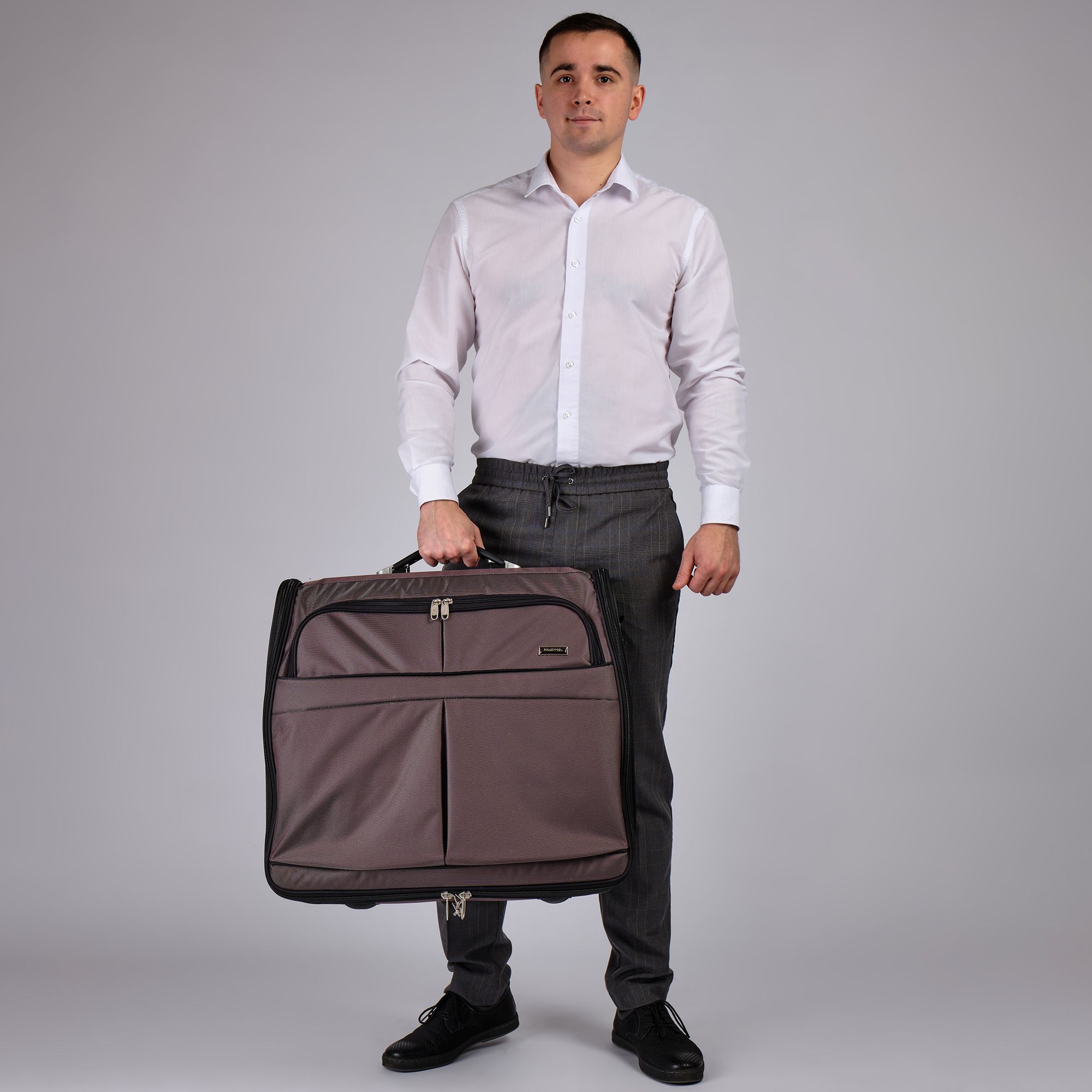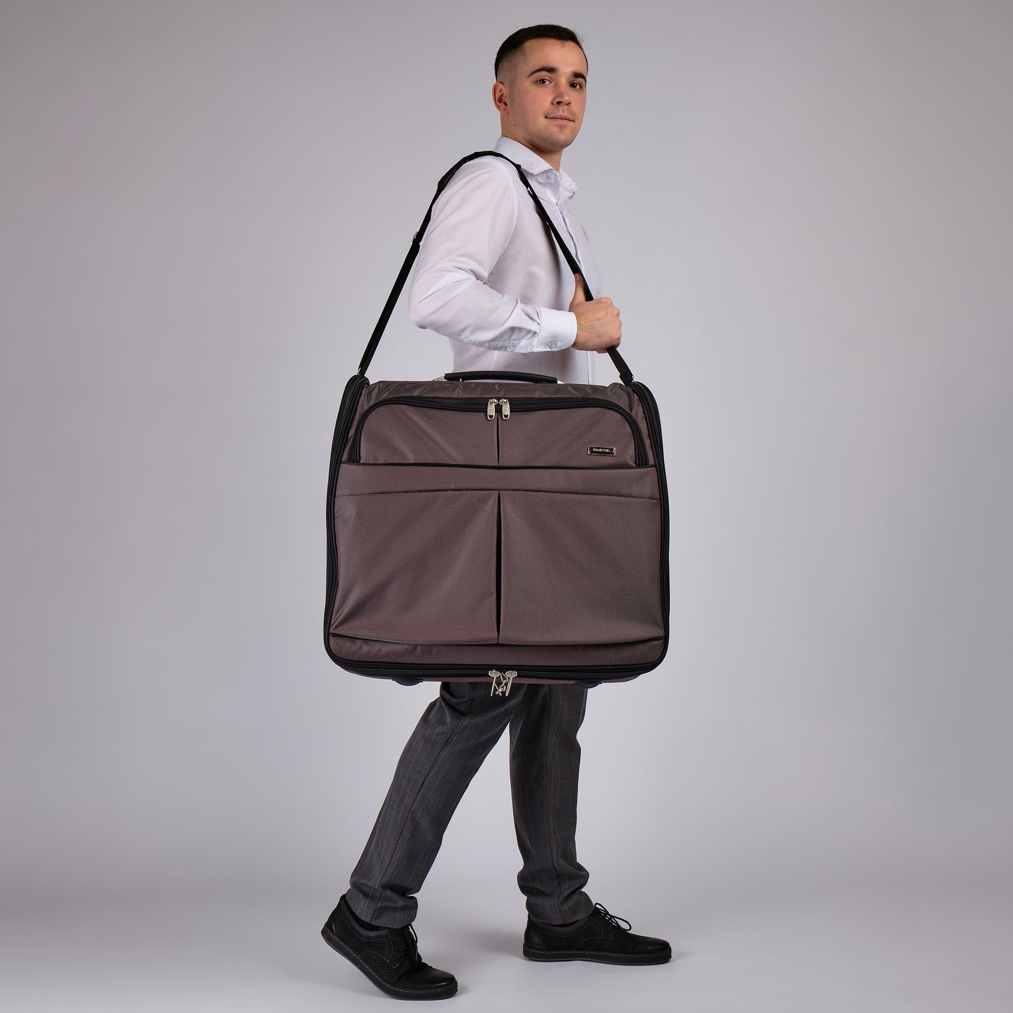 Портплед POLAR Полар – это дорожная сумка – чехол для переноски и хранения костюмов, рубашек, платья. Изготовлен из материалов премиум класса, высококачественный полиэстер, надежный прочный с водоотталкивающей пропиткой, который не выгорает, не трескается на морозе, устойчив к перепаду температур. Портплед для одежды удобен для перевозки деловых костюмов в командировке. Внутри сумки-портпледа фиксатор для одежды с креплением на 4 вешалки. В портпледе есть отделение на липучке для рубашек, футболок с фиксирующими ремнями. Большой глубокий карман на резинке для необходимых вещей, которые нужно взять с собой (галстук, платок, шарф, папка с документами, кошелек, майка, футболка и другое). Снаружи, на передней стенке портпледа, имеется объёмный и плоский карман на молнии для деловых бумаг и папок. Задний большой карман на молнии. Портплед для одежды мужской, женский, унисекс. Для удобства переноски есть плечевой ремень и надежная ручка для переноски. Вешалка в комплект не входит. Перед покупкой уточните у своего авиаперевозчика допустимые габариты для провоза ручной клади, чтобы определить подходит вам эта модель или нет.