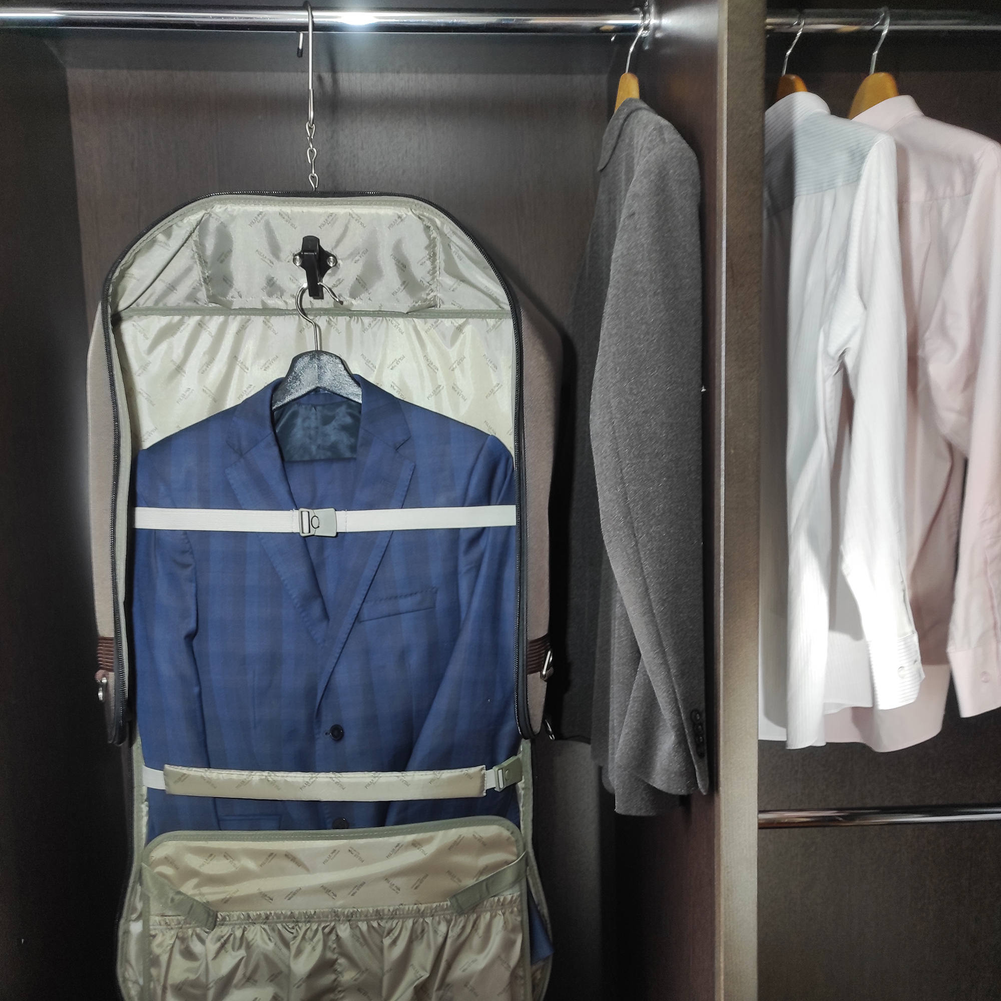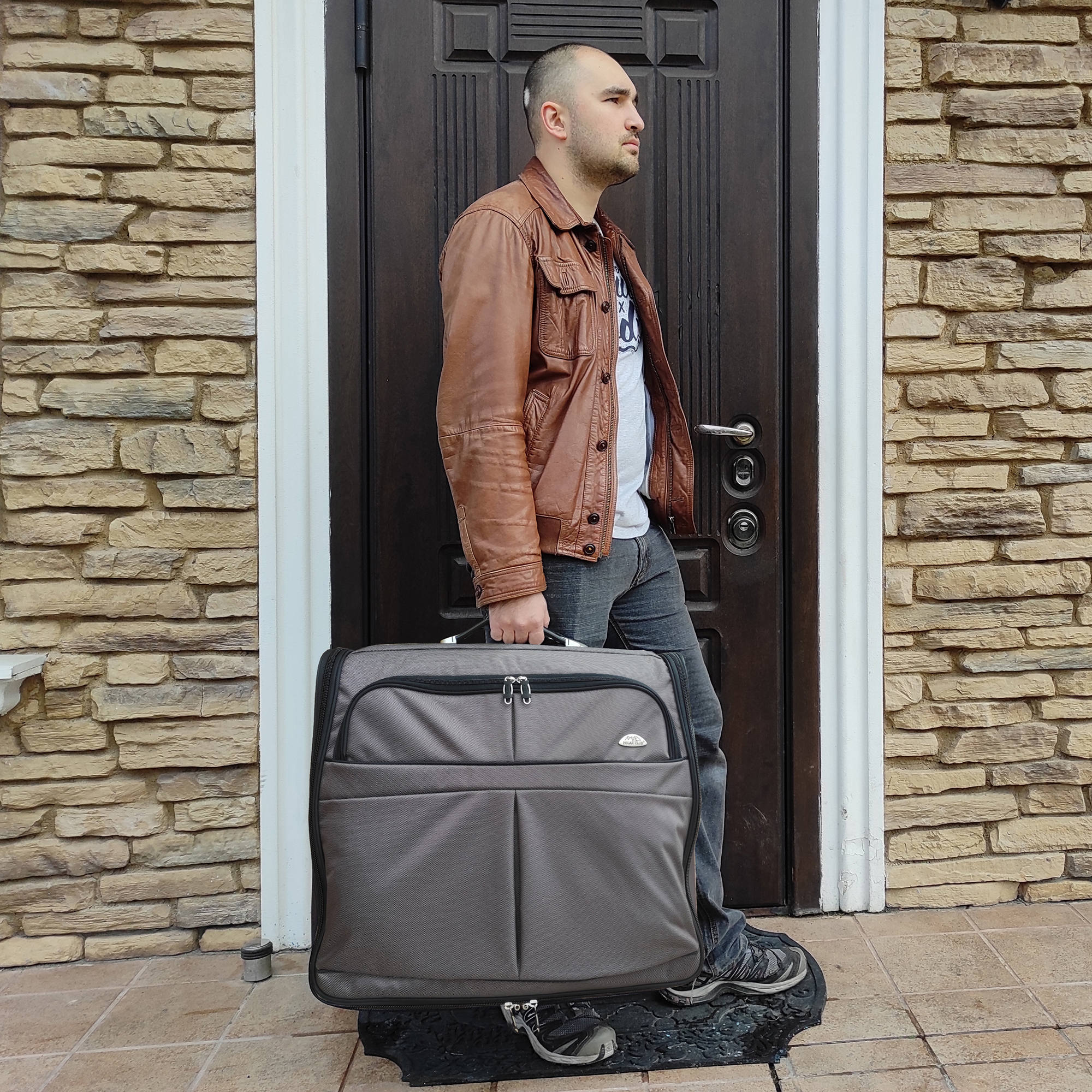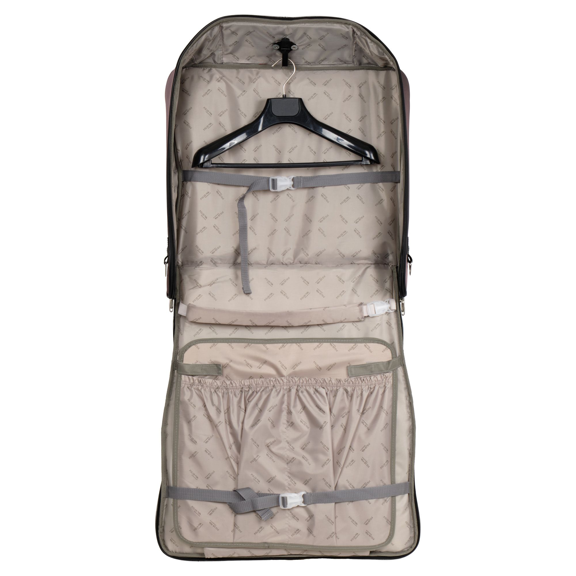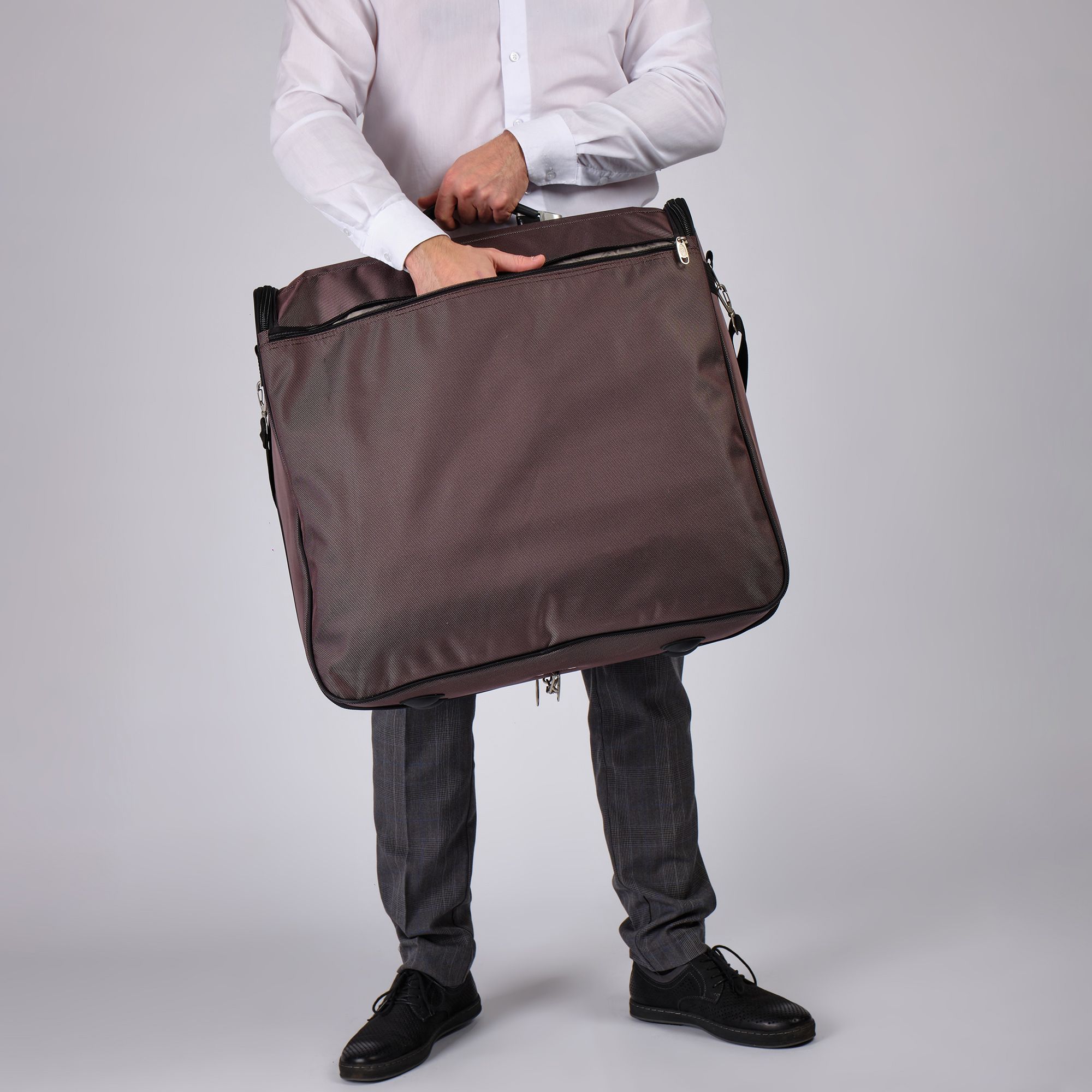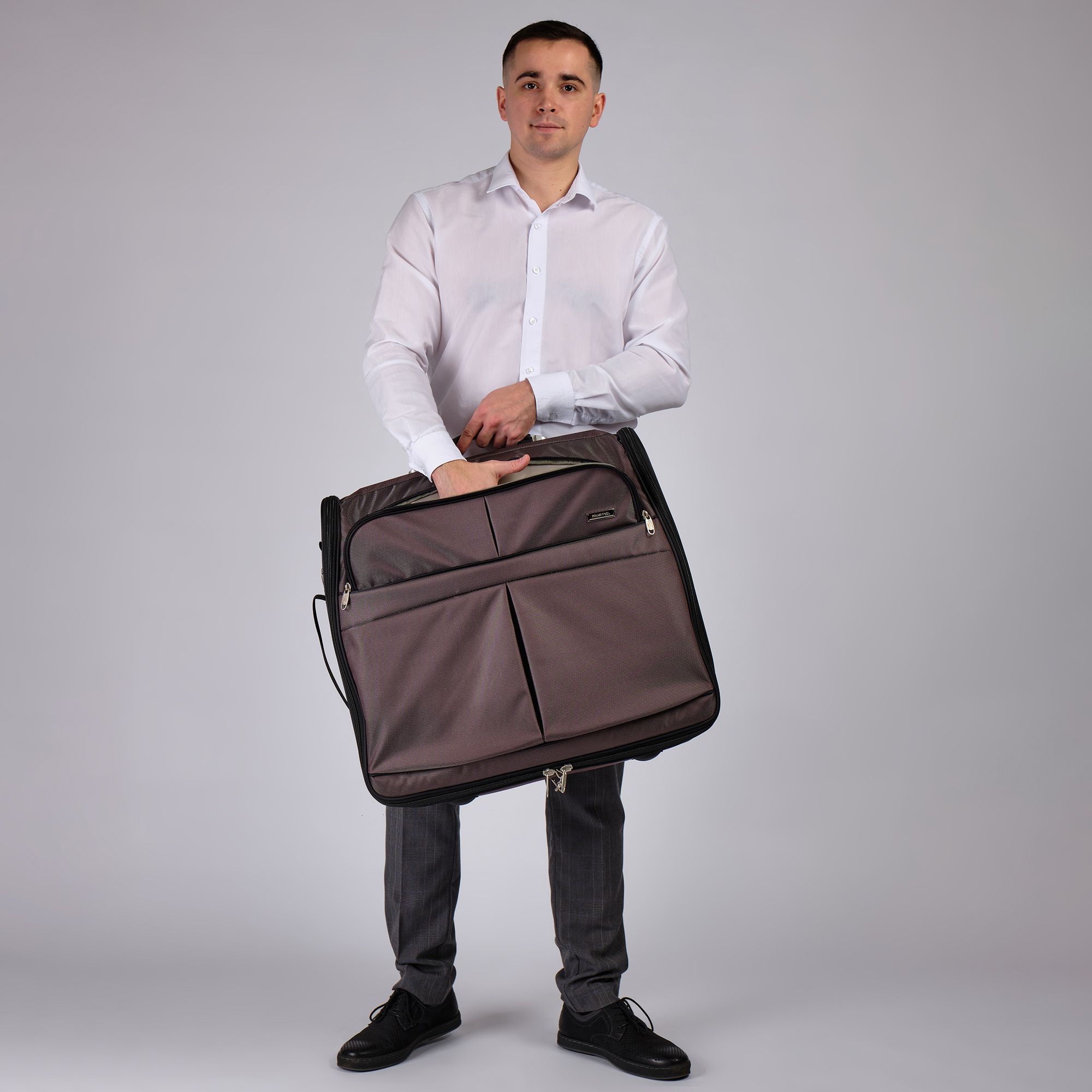 Портплед POLAR Полар – это дорожная сумка – чехол для переноски и хранения костюмов, рубашек, платья. Изготовлен из материалов премиум класса, высококачественный полиэстер, надежный прочный с водоотталкивающей пропиткой, который не выгорает, не трескается на морозе, устойчив к перепаду температур. Портплед для одежды удобен для перевозки деловых костюмов в командировке. Внутри сумки-портпледа фиксатор для одежды с креплением на 4 вешалки. В портпледе есть отделение на липучке для рубашек, футболок с фиксирующими ремнями. Большой глубокий карман на резинке для необходимых вещей, которые нужно взять с собой (галстук, платок, шарф, папка с документами, кошелек, майка, футболка и другое). Снаружи, на передней стенке портпледа, имеется объёмный и плоский карман на молнии для деловых бумаг и папок. Задний большой карман на молнии. Портплед для одежды мужской, женский, унисекс. Для удобства переноски есть плечевой ремень и надежная ручка для переноски. Вешалка в комплект не входит. Перед покупкой уточните у своего авиаперевозчика допустимые габариты для провоза ручной клади, чтобы определить подходит вам эта модель или нет.
