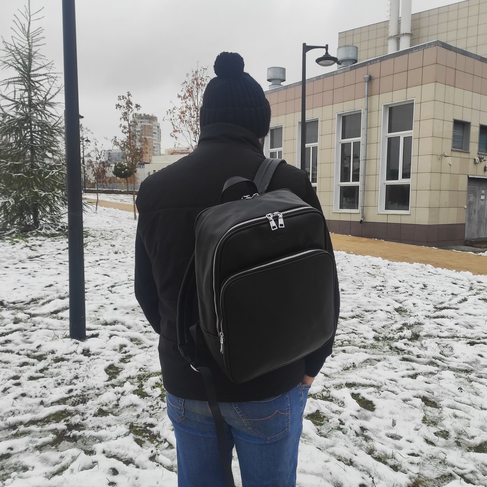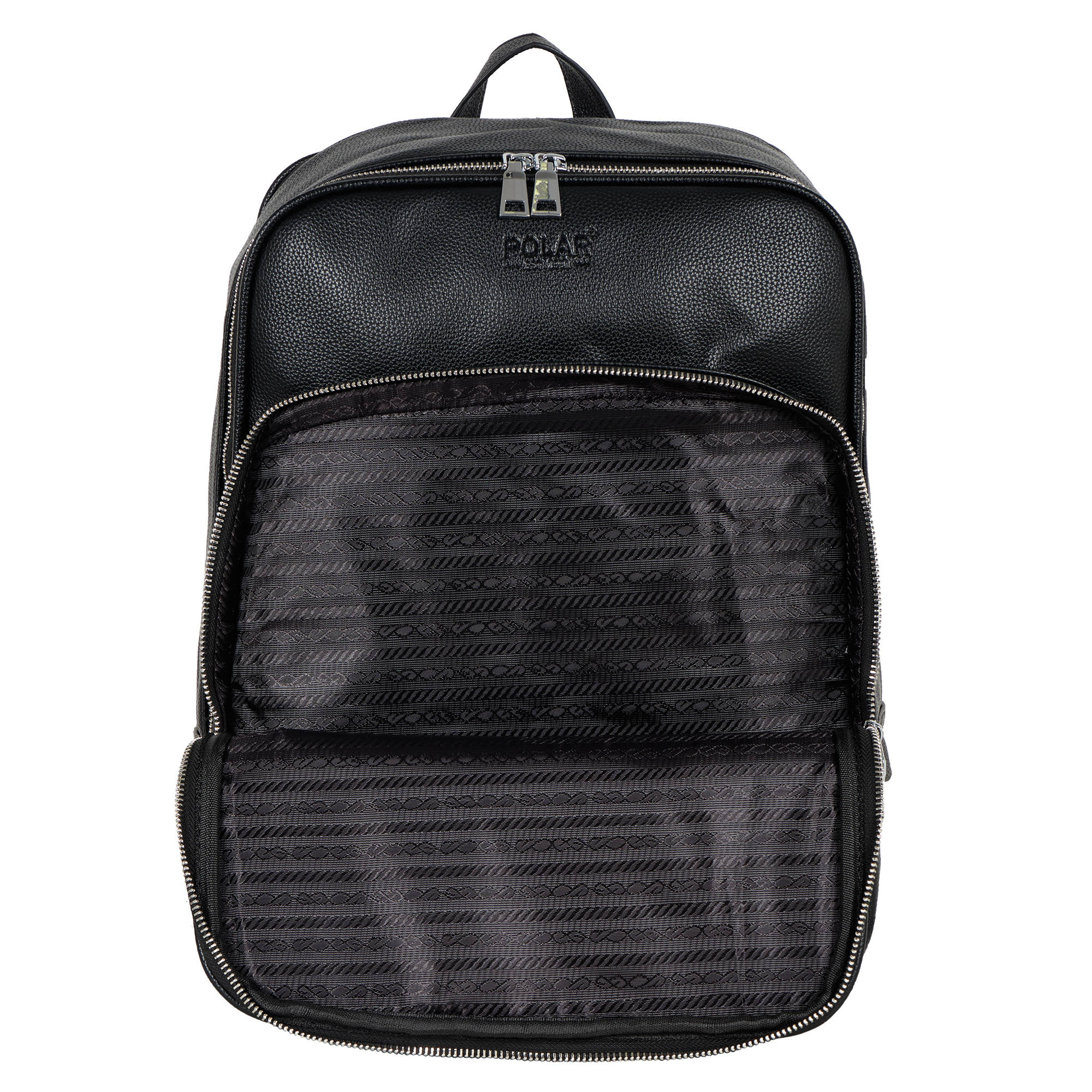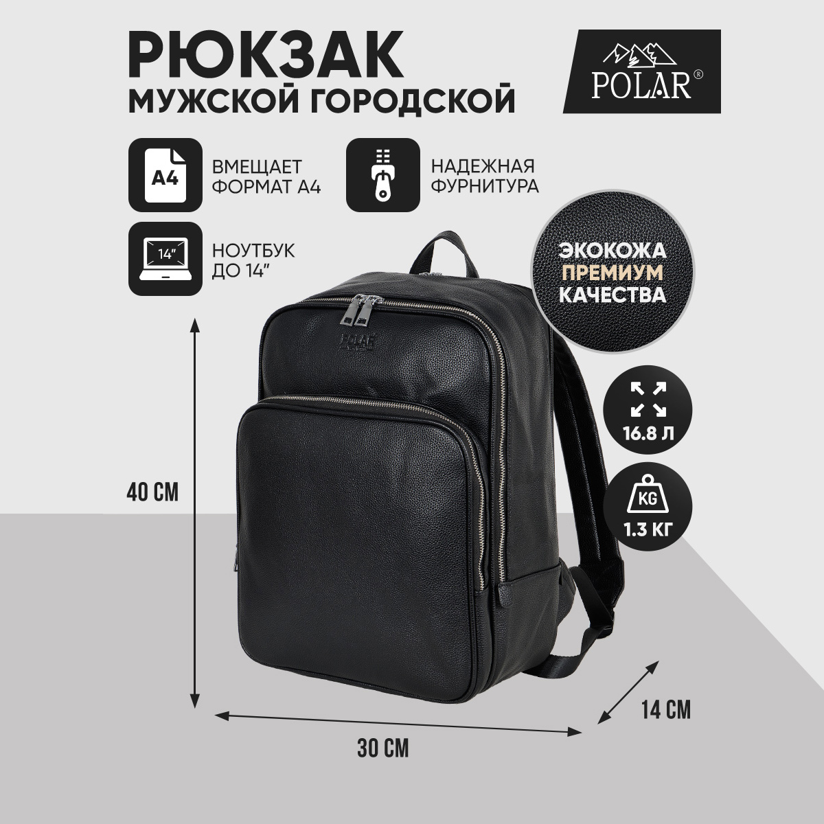 Городской рюкзак фирмы Polar из экокожи с отделением для ноутбука состоит из одного вместительного отделения и закрывается на молнию. Идеальная модель для города и учебы. Рюкзак свободно вмещает формат А4. Внутри расположены два открытых кармана и один на молнии, также отделение для ноутбука диагональю до 14. размеры отсека для ноутбука 35 x 24 x 2. Спереди рюкзака расположен большой накладной карман на молнии. На задней стенке сумки предусмотрено крепление на ручку чемодана. Лямки регулируются по длине максимальная 93 см. Сверху расположена ручка высотой 9 см.