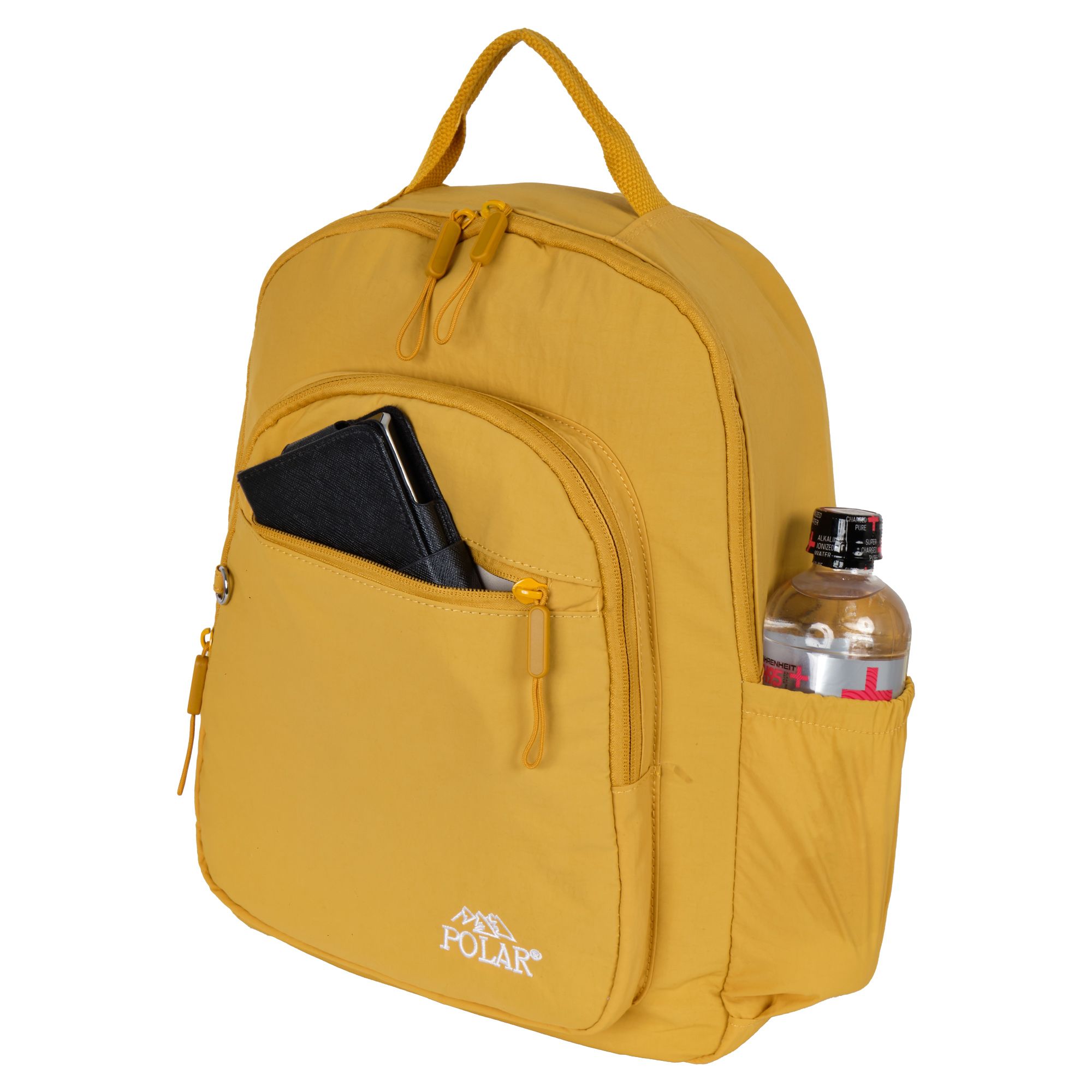 Городской рюкзак фирмы Polar выполнен из полиэстера. Рюкзак состоит из основного отделения, предназначенного для стандартного ежедневного набора вещей, состоящего из кошелька, документов, мобильного, телефона, очков и ключей, внутри основного отделения есть два открытых кармашка и карман на молнии. Отделение рюкзак свободно вмещает формат А4. Спереди накладной карман на молнии. По бокам расположены два открытых кармана на резинке. Лямки регулируются по длине 90 см. Сверху расположена ручка высотой 7 см.