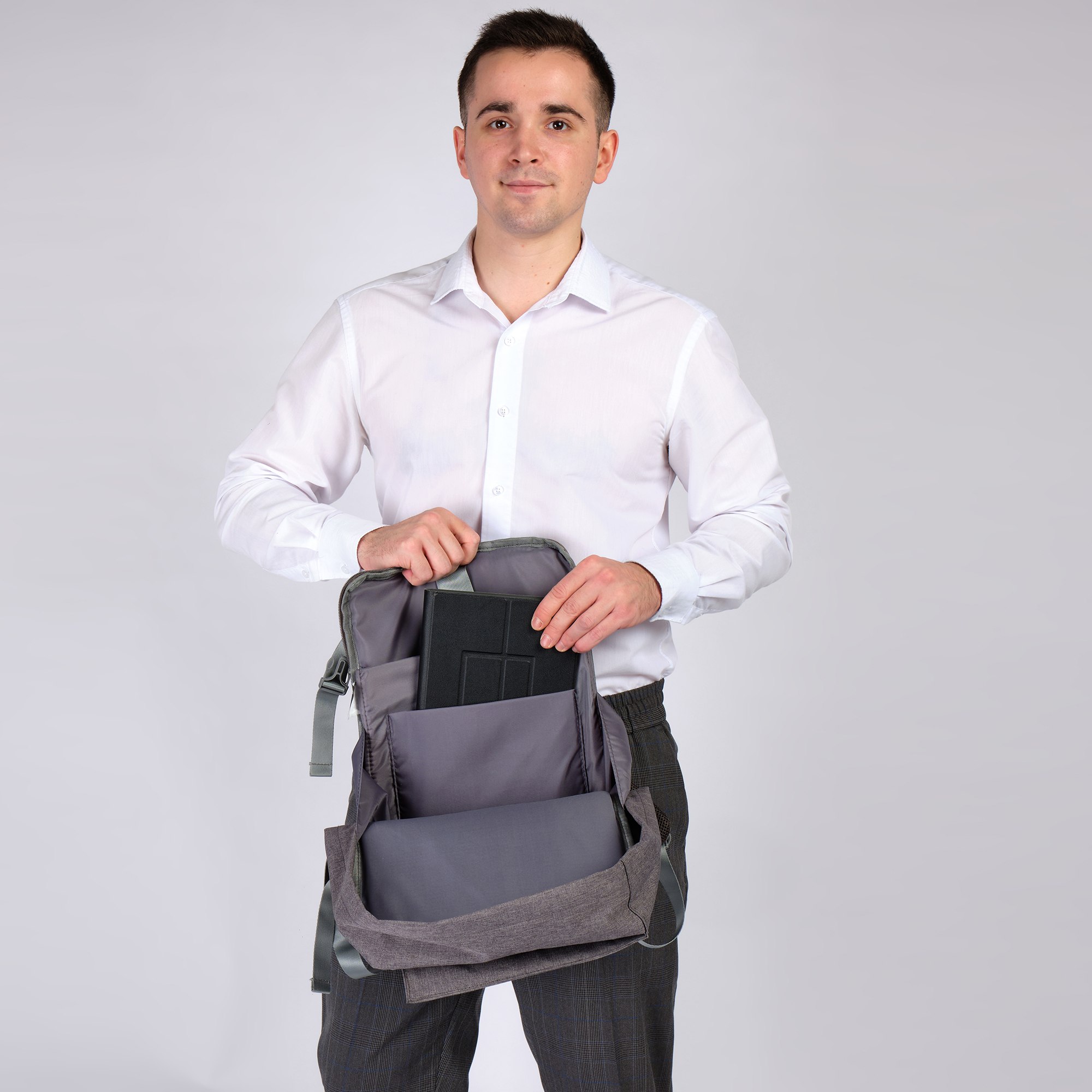Рюкзак имеет одно основное отделение, которое закрывается на потайную молнию (антивор), внутри которого есть карманы для ноутбука диагональю до 17” , размер отсека 40 х 27 х 3 и планшета.