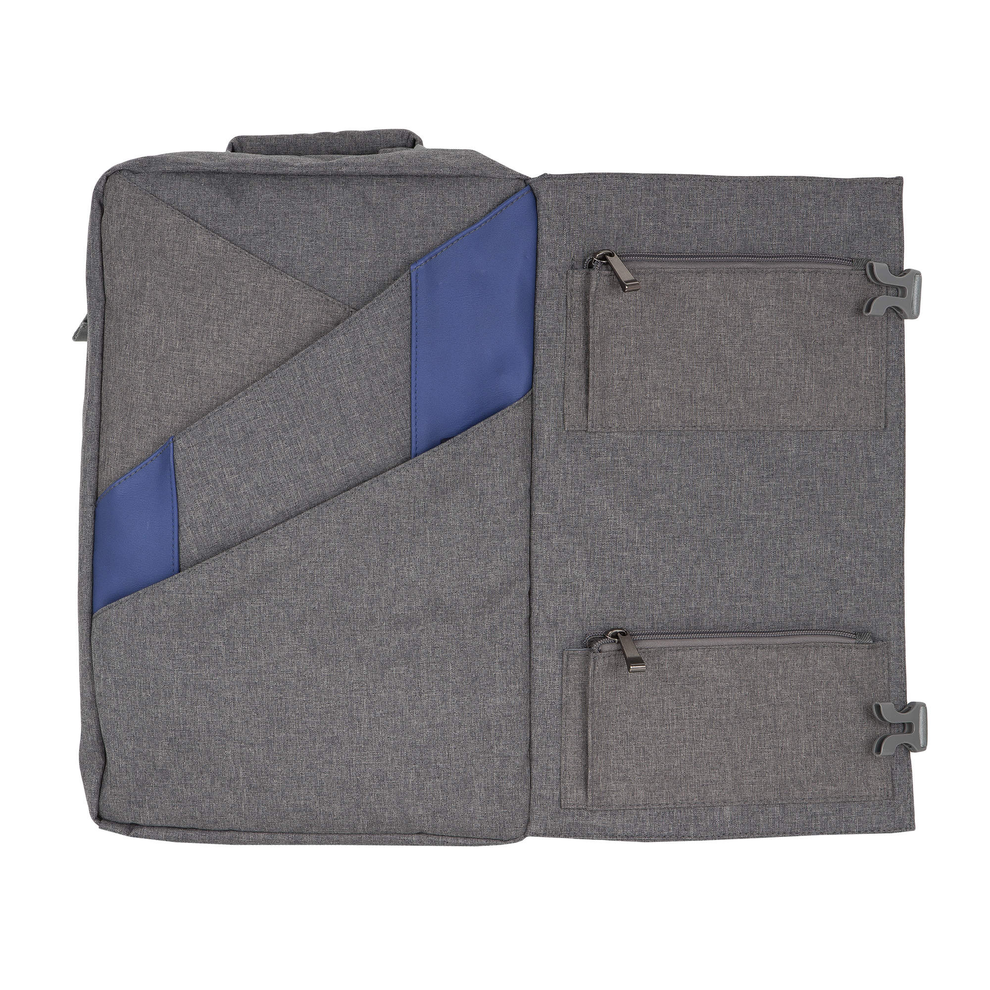 Передняя стенка рюкзака выполнена как папка- органайзер, застегивается на карабины, внутри которой множество закрытых и открытых кармашков для бумаг и канцелярии.