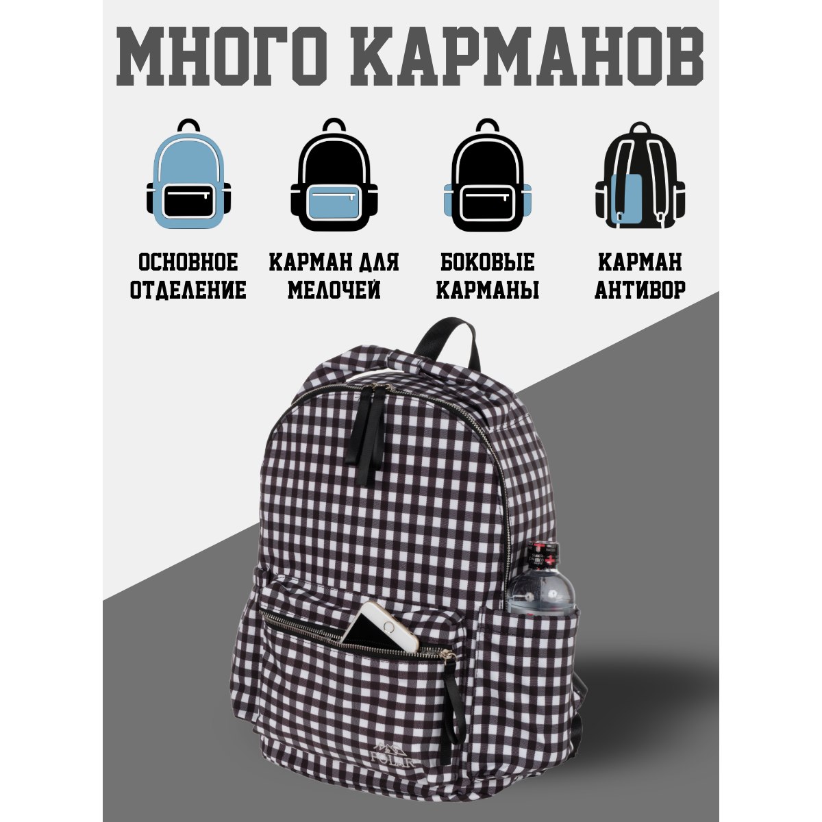 Городской рюкзак фирмы Polar имеет мягкую поролоновую спинку и мягкие лямки. Рюкзак состоит из одного отделения, которое закрывается на металлическую молнию. Внутри отделения один сетчатый карман на молнии. Спереди объемный карман для небольших предметов. По бокам два кармана на резинке. Сзади потайной небольшой кармашек. Максимальная длина лямок 93 см. Высота ручки 8 см.