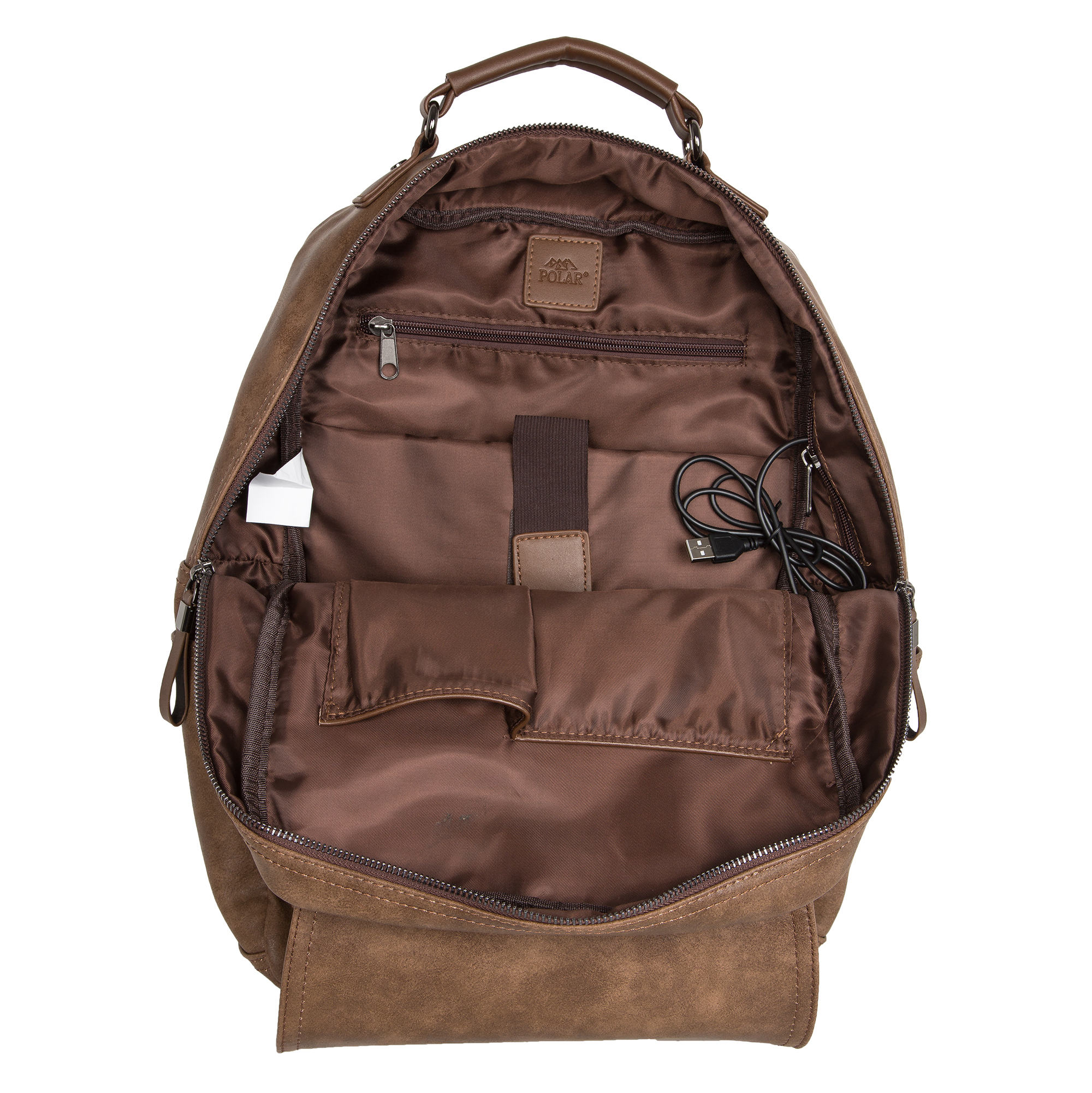 Городской стильный рюкзак фирмы POLAR из экокожи. Прекрасно подходит для ежедневного использования в повседневной жизни. Рюкзак оснащен USB-кабелем и USB - портом. Основное отделение закрывается на металлическую молнию. Внутри два небольших открытых кармана для мелочей, один на молнии, также есть отделение для планшета. Спереди есть накладной карман, закрывается на металлические застежки и молнию. По бокам есть два кармана для бутылки с водой и зонтика. Спинка и лямки рюкзака отделаны мягким вентилируемым материалом, благодаря этому с рюкзаком комфортно ходить целый день. Отлично подойдет для прогулки с друзьями.
