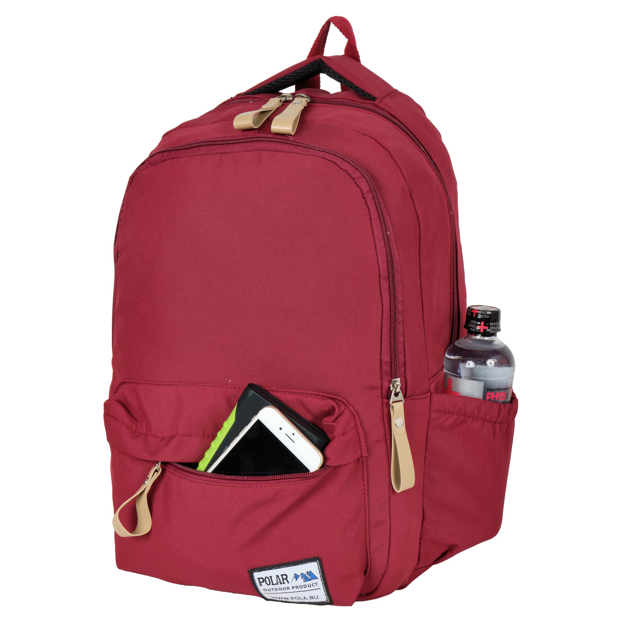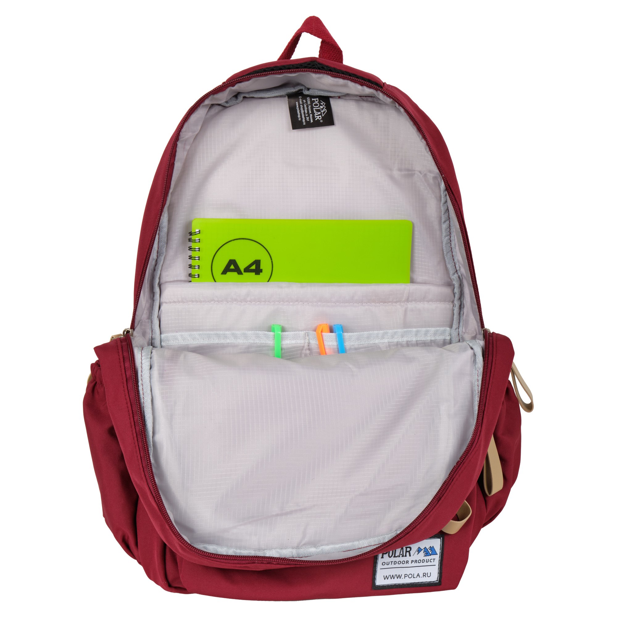 Рюкзак фирмы Polar мягкая поролоновая спинка. Рюкзак состоит из двух отделений. Основное отделение закрывается на молнию. Внутри расположены два небольших кармана и отделение под ноутбук или планшет диагональю 15 размеры (26 х 36 х 2). Среднее отделение рюкзак свободно вмещает формат А4. Спереди накладной карман на молнии. По бокам расположены два открытых кармана. Лямки регулируются по длине 80 см. Сзади расположен потайной карман. Сверху расположены две ручки высотой 8 см и 2 см.