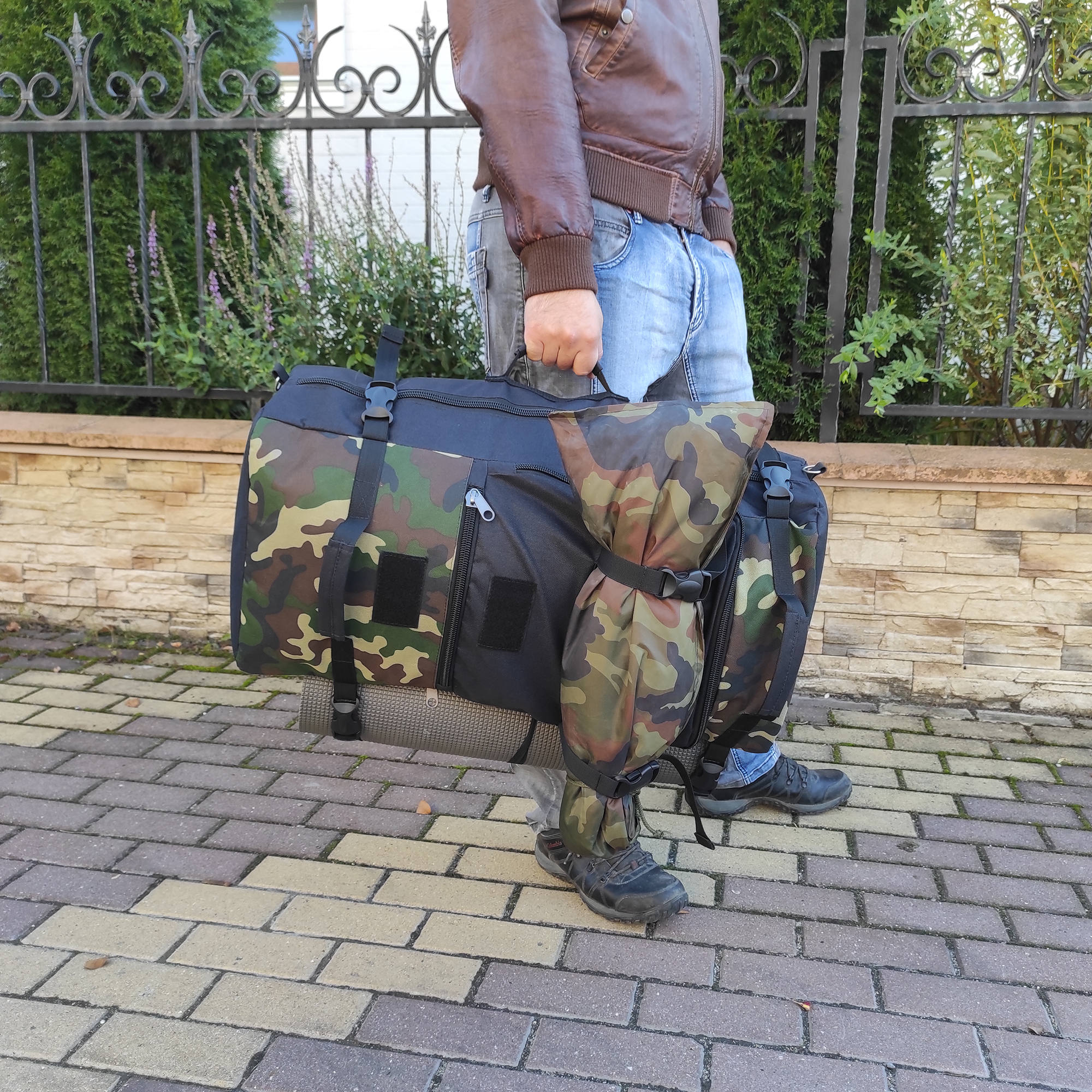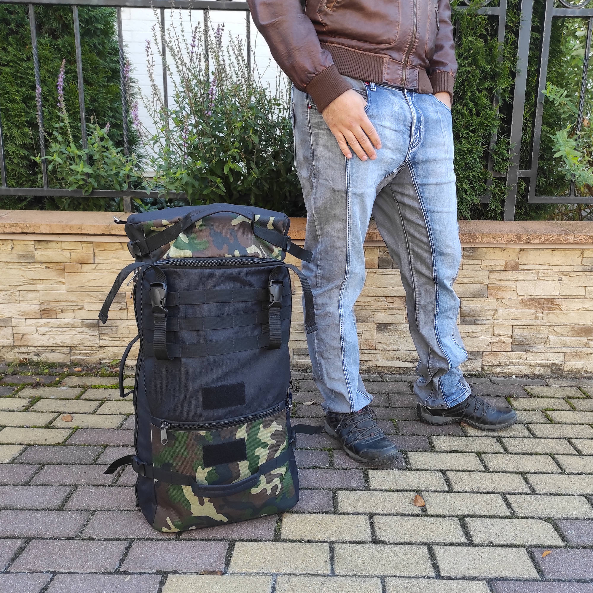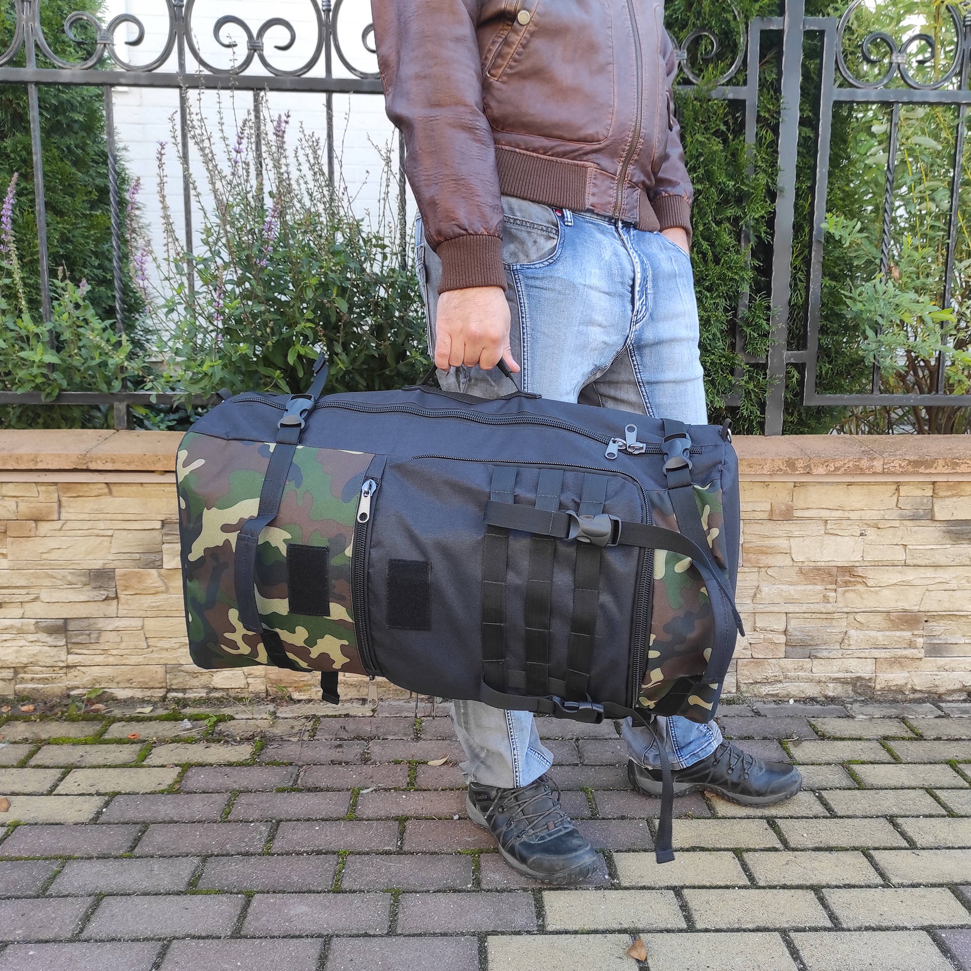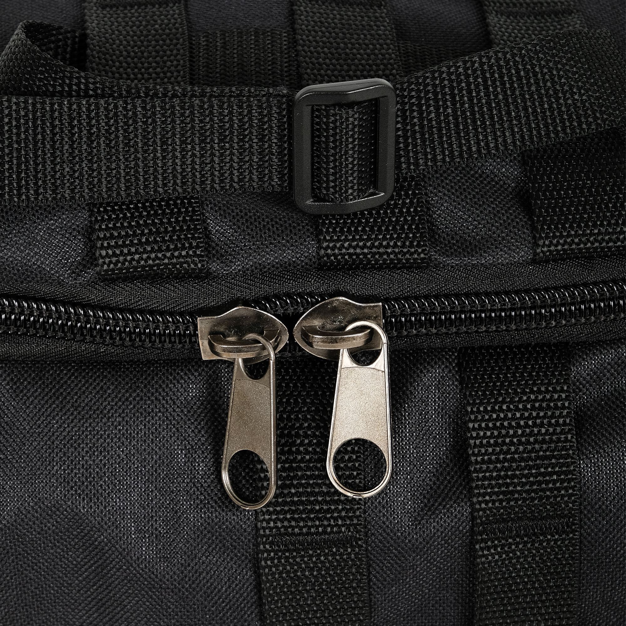 При необходимости, рюкзак легко трансформируется в большую дорожную сумку, если взять его за боковую ручку длина и убрать лямки под дополнительное отделение, отстегнув его сверху и закрыв на молнию. В комплекте есть съемный, регулируемый по длине ремень, длина до 135 см.