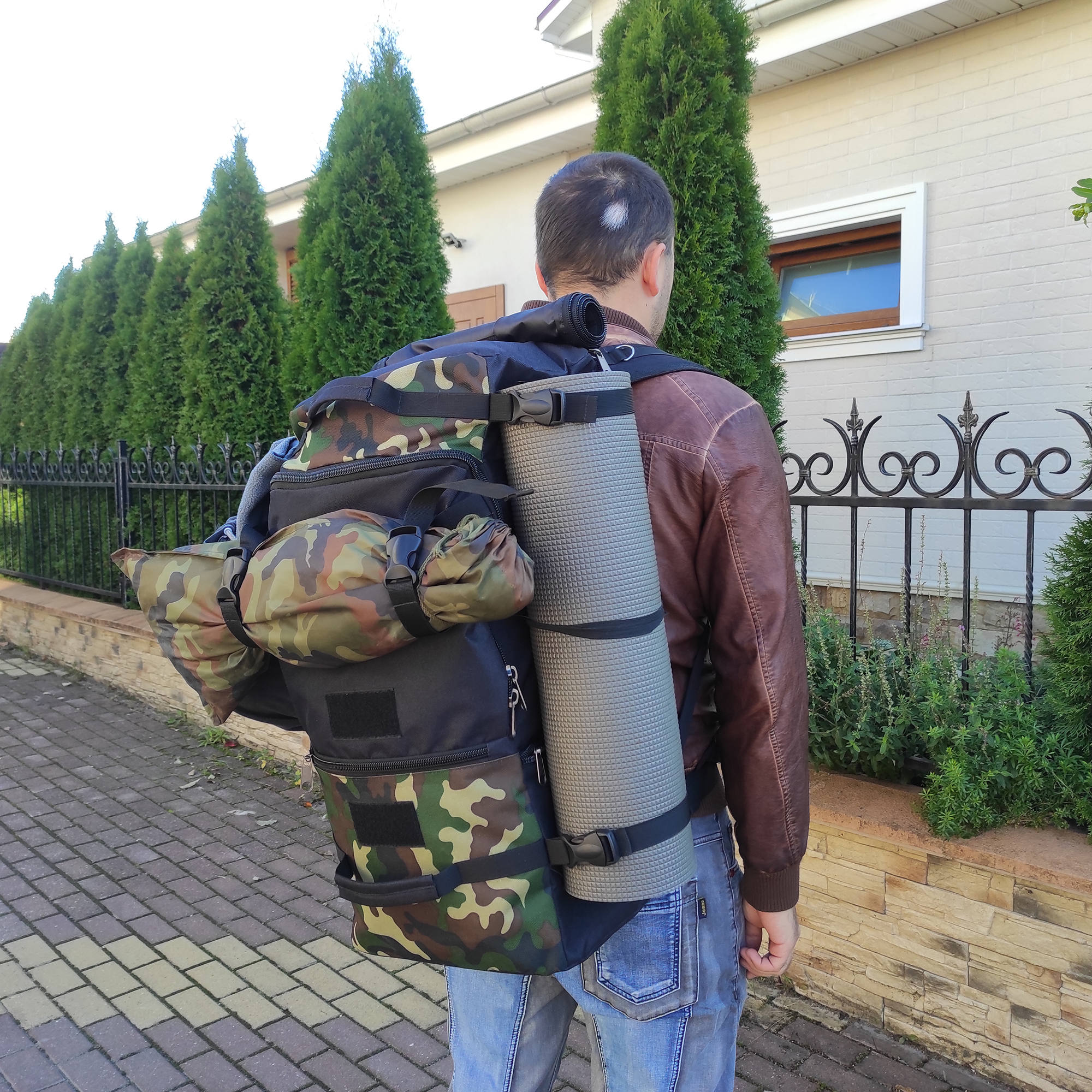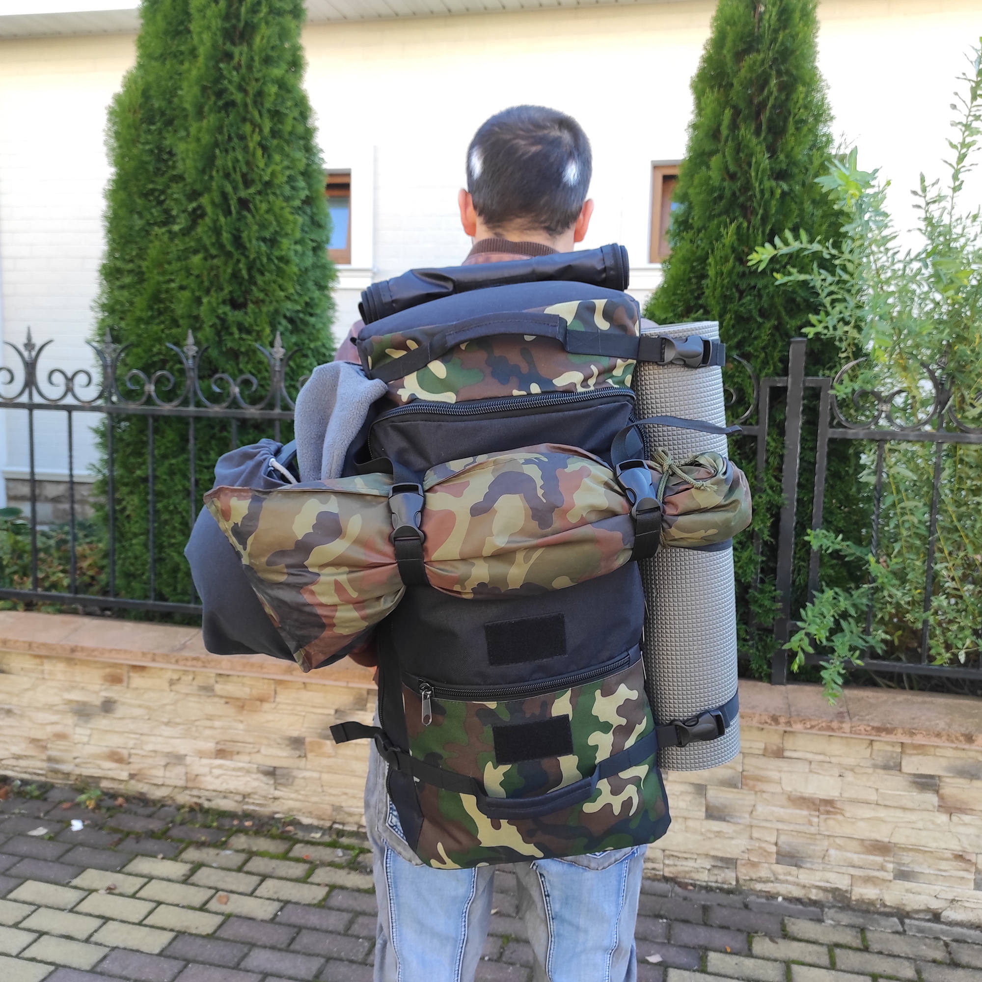 Спина со специальным наполнителем из мягкой амортизирующей пены, широкие лямки длина которых 90 см анатомической формы регулируются для большего комфорта. Дополнительный поясной ремень 110 см снижает нагрузку на позвоночник, регулируется по длине. Основное отделение закрывается на широкую надежную молнию, внутри есть отделение для документов или ноутбука, спереди два вместительных накладных кармана. По бокам у рюкзака есть утяжки с фастексами.