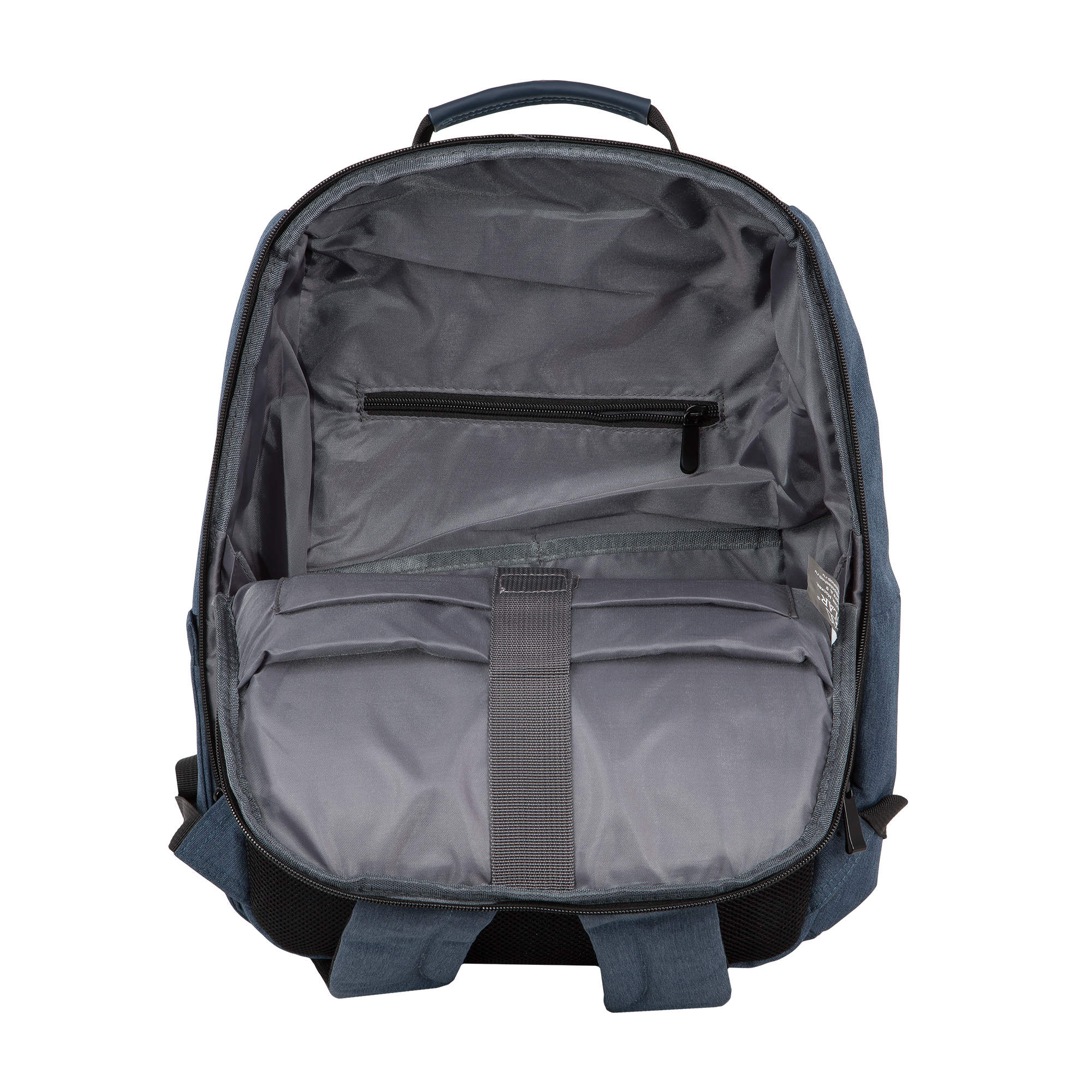 Рюкзак имеет одно основное отделение, которое закрывается на потайную молнию, внутри которого есть карманы для ноутбука диагональю до 14” и планшета, несколько открытых карманов и карман на молнии. На передней стенке рюкзака, с обеих сторон есть боковые карманы на молнии и фронтальный карман для мелких вещей, которые должны быть под рукой. Сбоку есть открытый карман на кнопке для бутылки воды или зонта. Спинка рюкзака выполнена из мягкого вентилируемого материала, благодаря этому с рюкзаком комфортно ходить целый день. Также на спинке пришита лента, с помощью которой удобно крепить рюкзак на выдвижной ручке чемодана, а это дополнительный комфорт для путешественников.