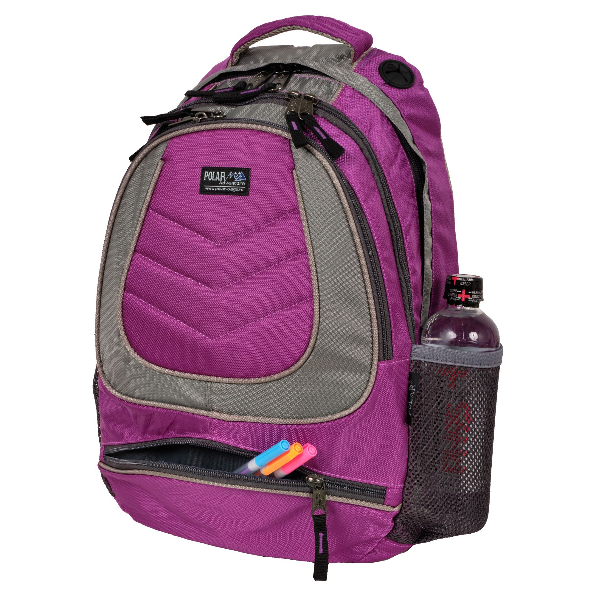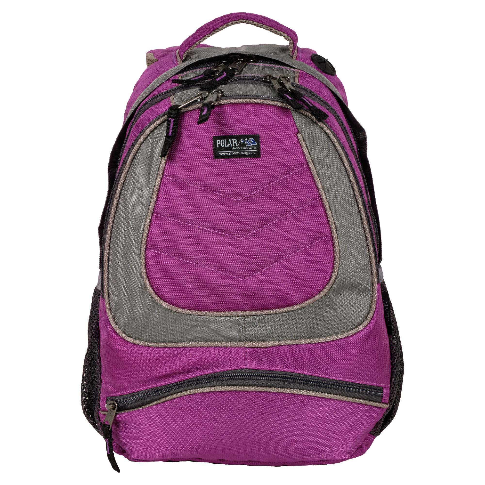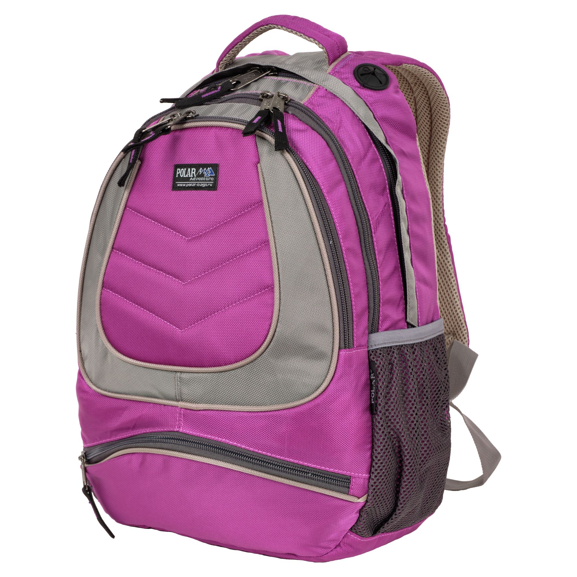 Городской рюкзак с модным дизайном. Три отделения с раздельным доступом: основное отделение с папкой для бумаг и книг, отделение для легких вещей и дополнительное отделение меньшего объема с карманами для канцелярии, ключей и т.п. Внутри есть карман для плеера и клапан для наушников. Снаружи небольшой карман на молнии. Спинка и лямки выполнены из дышащего материала.
