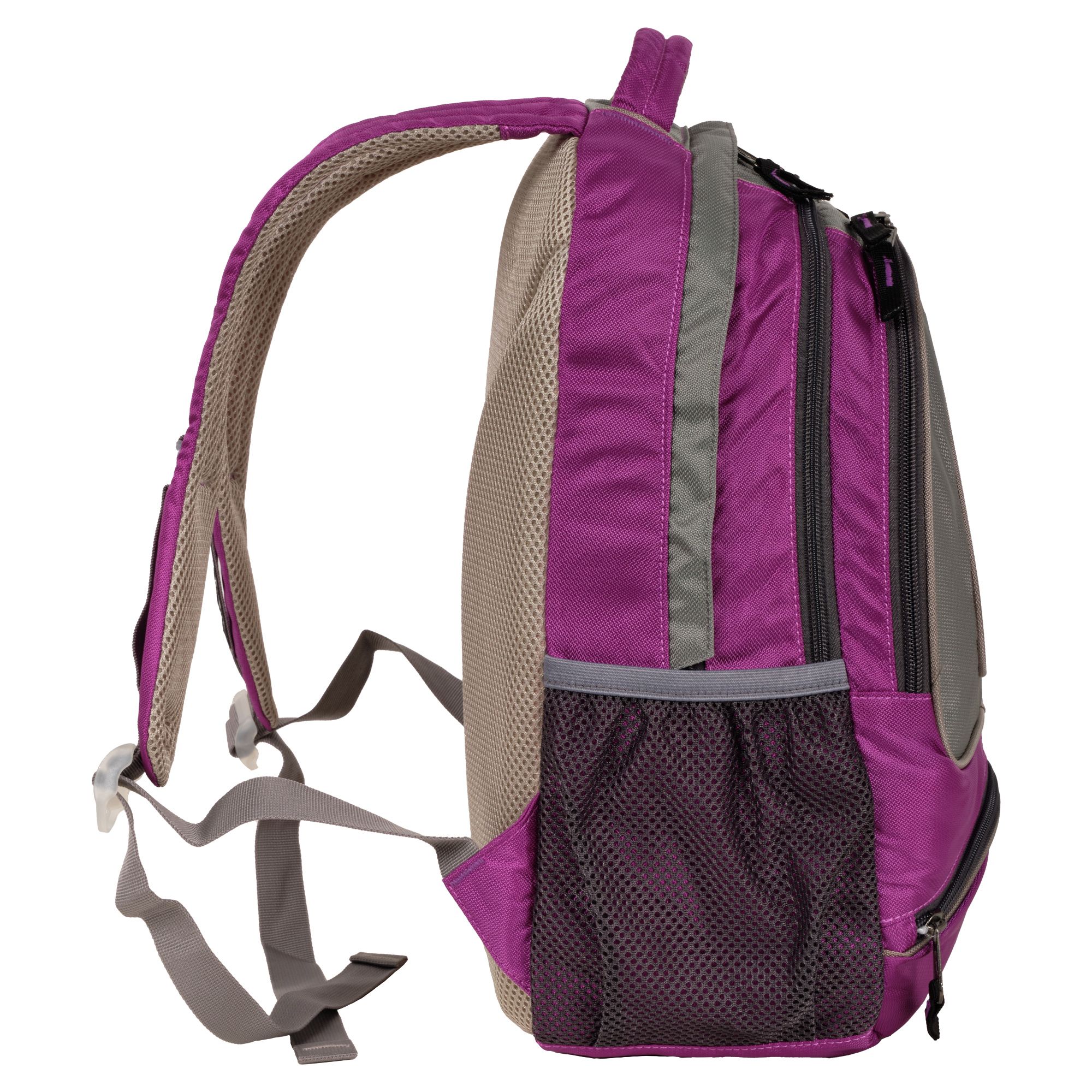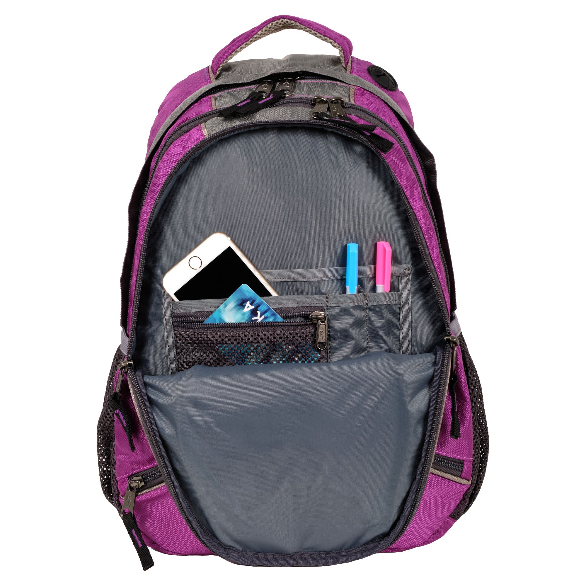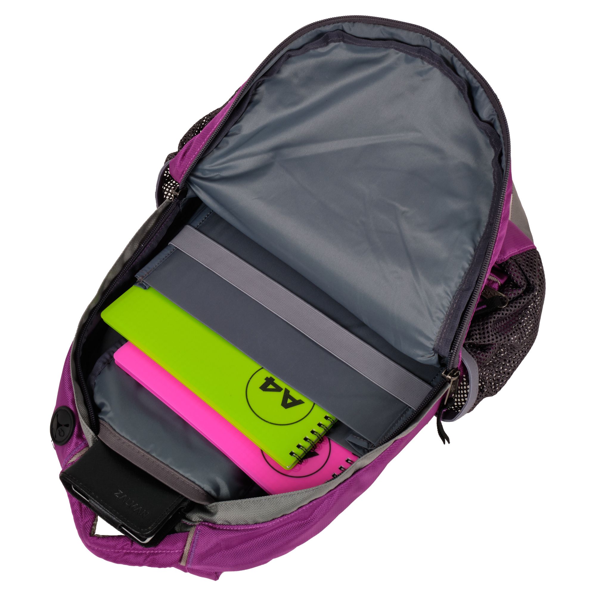 Городской рюкзак с модным дизайном. Три отделения с раздельным доступом: основное отделение с папкой для бумаг и книг, отделение для легких вещей и дополнительное отделение меньшего объема с карманами для канцелярии, ключей и т.п. Внутри есть карман для плеера и клапан для наушников. Снаружи небольшой карман на молнии. Спинка и лямки выполнены из дышащего материала.