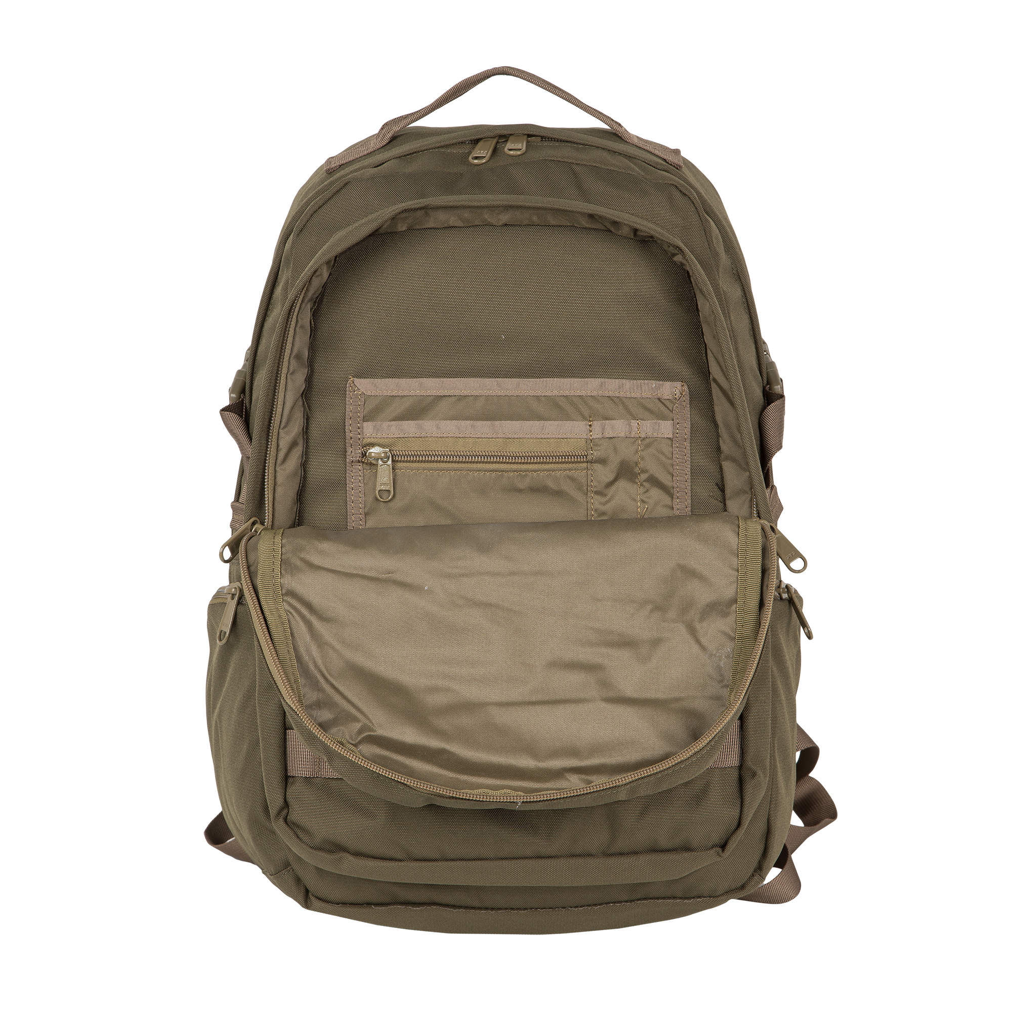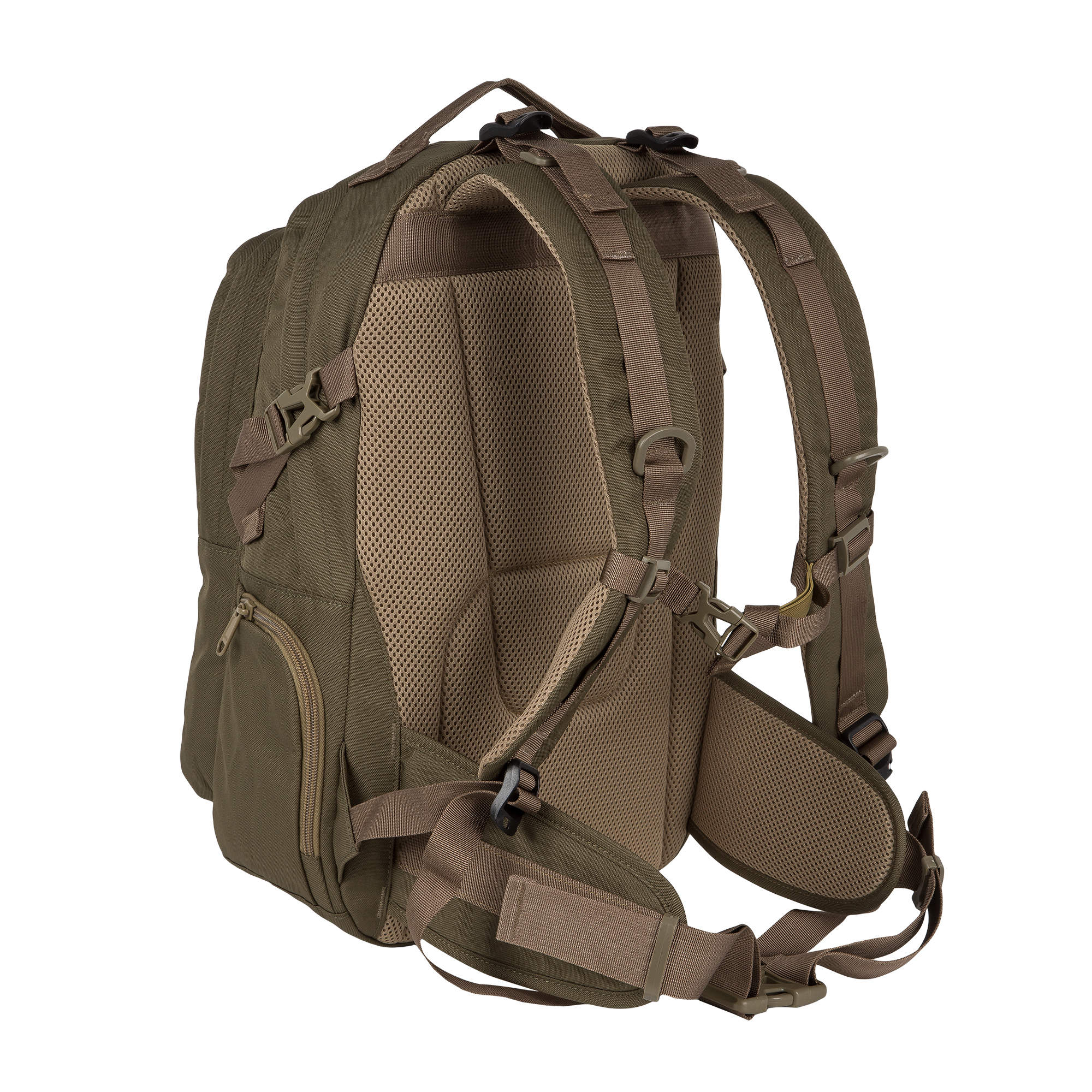Рюкзак имеет два основных отделения, которые закрываются на двухстороннюю молнию. Внутри первого есть открытый карман, во втором – небольшой открытый кармашек и организационная панель. На передней стенке прорезной карман на молнии для мелких вещей, которые должны быть под рукой. По бокам небольшие кармашки на молнии. Широкие лямки анатомической формы регулируются для большего комфорта и имеют грудную стяжку. У рюкзака жесткая ортопедическая спинка с сетчатым уплотнителем, который обеспечивает отличную вентиляцию. Дополнительный поясной ремень снижает нагрузку на позвоночник, регулируется по длине. По бокам у рюкзака есть утяжки с фастексами. На переднем кармане нашиты стропы, за них в походе можно закрепить дополнительное оборудование.