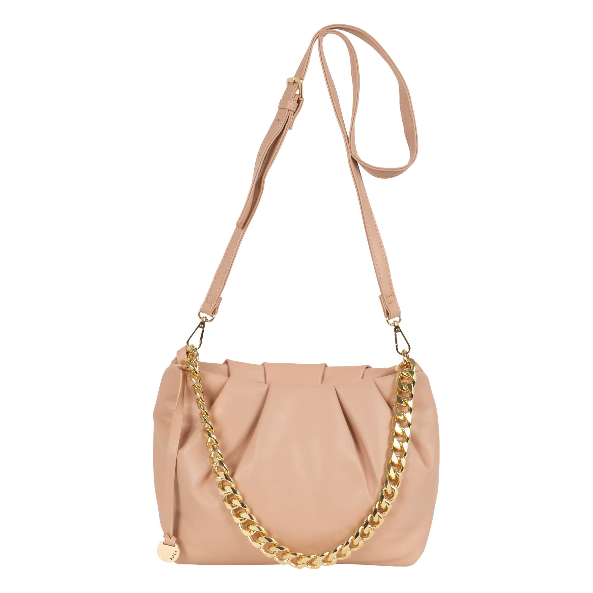 Стильная сумка фирмы Pola выполнена из экокожи и предназначена для повседневного использования. Основное отделение закрывается на молнию. Внутри есть потайной карман на молнии и открытый карман. У данной модели два варианта переноски, металлическая массивная цепь, очень легкая высота 29 см и съемный, регулируемый ремешок из экокожи, длина 121см. Цвет фурнитуры-золото.