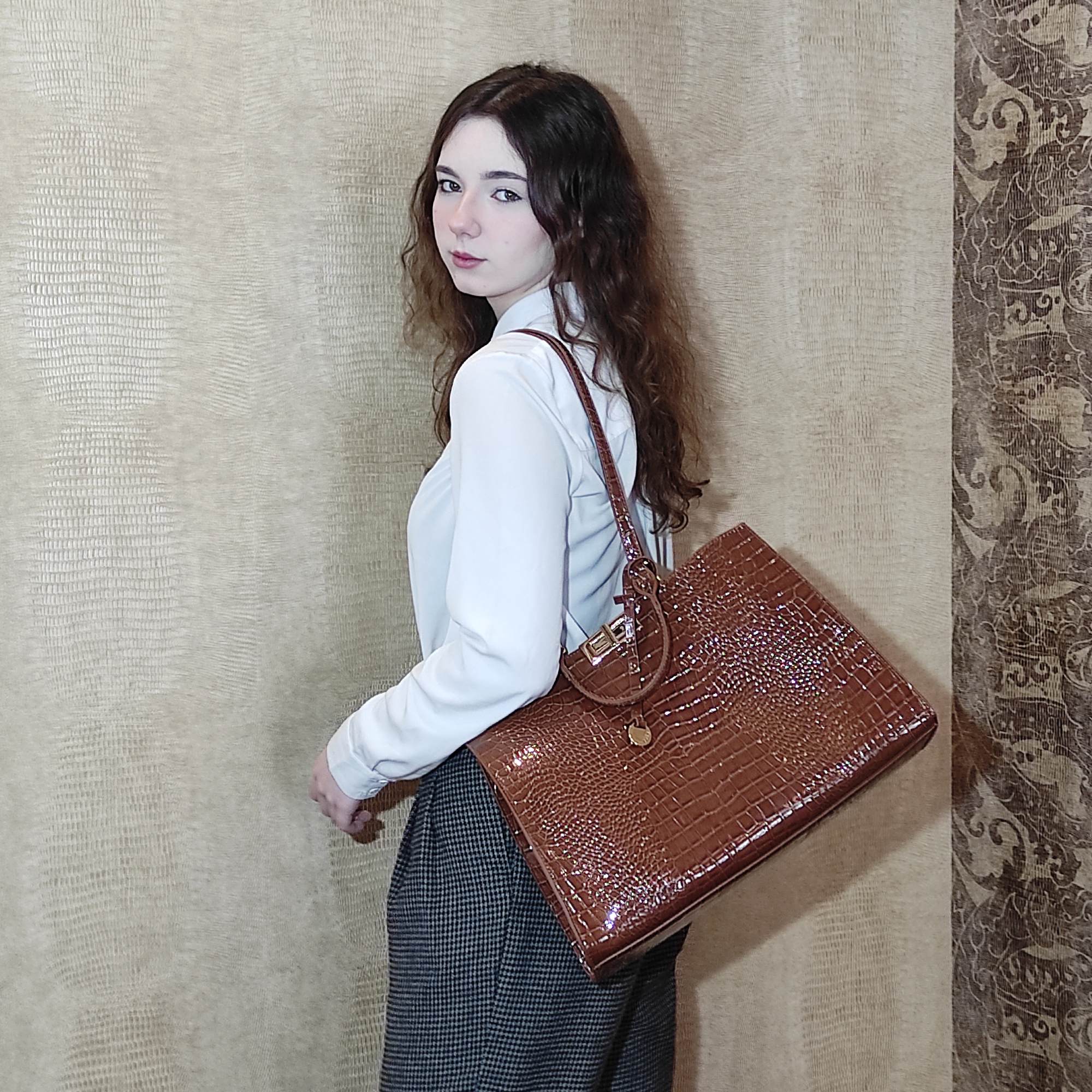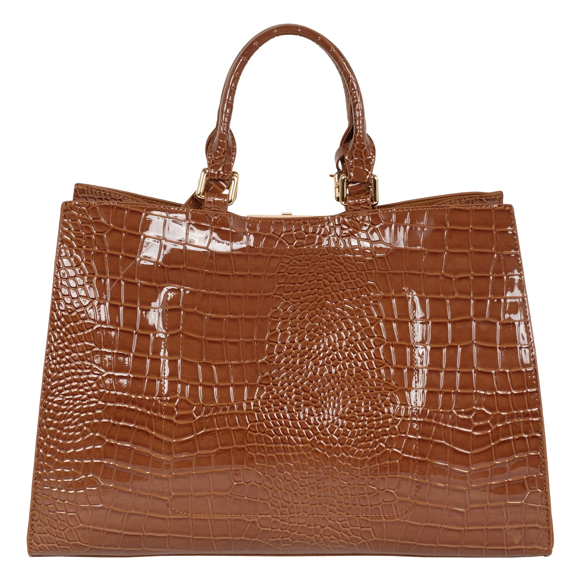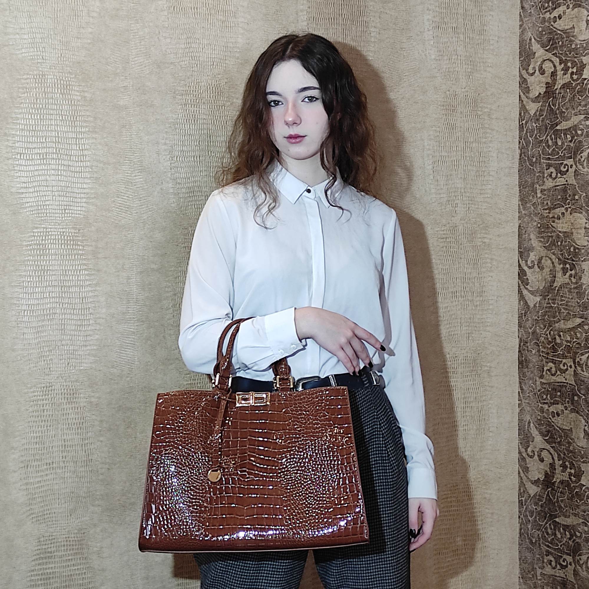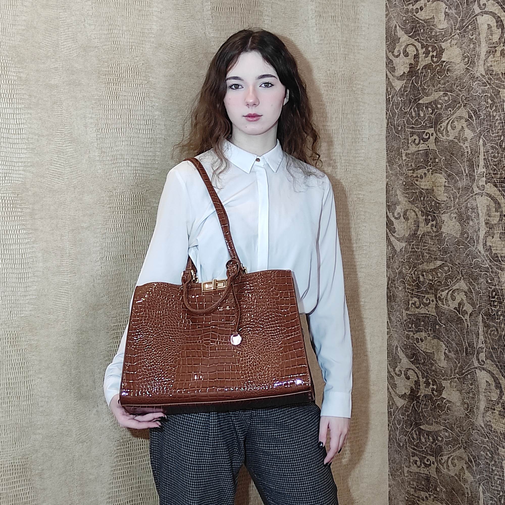 Оригинальная, стильная сумка Pola выполнена из лаковой экокожи с имитацией кожи рептилии и прекрасно подходит для ежедневного использования модницами любого возраста. Данная модель закрывается металлическим поворотный замком. Одно основное отделение,без подкладки, внутри один открытый кармашек. Сумка хорошо держит форму, поэтому документы А4 не помнутся У сумки четыре несъемных ручки, две коротких высота 15 см и две длинных высота 33 см. Цвет фурнитуры-золото.
