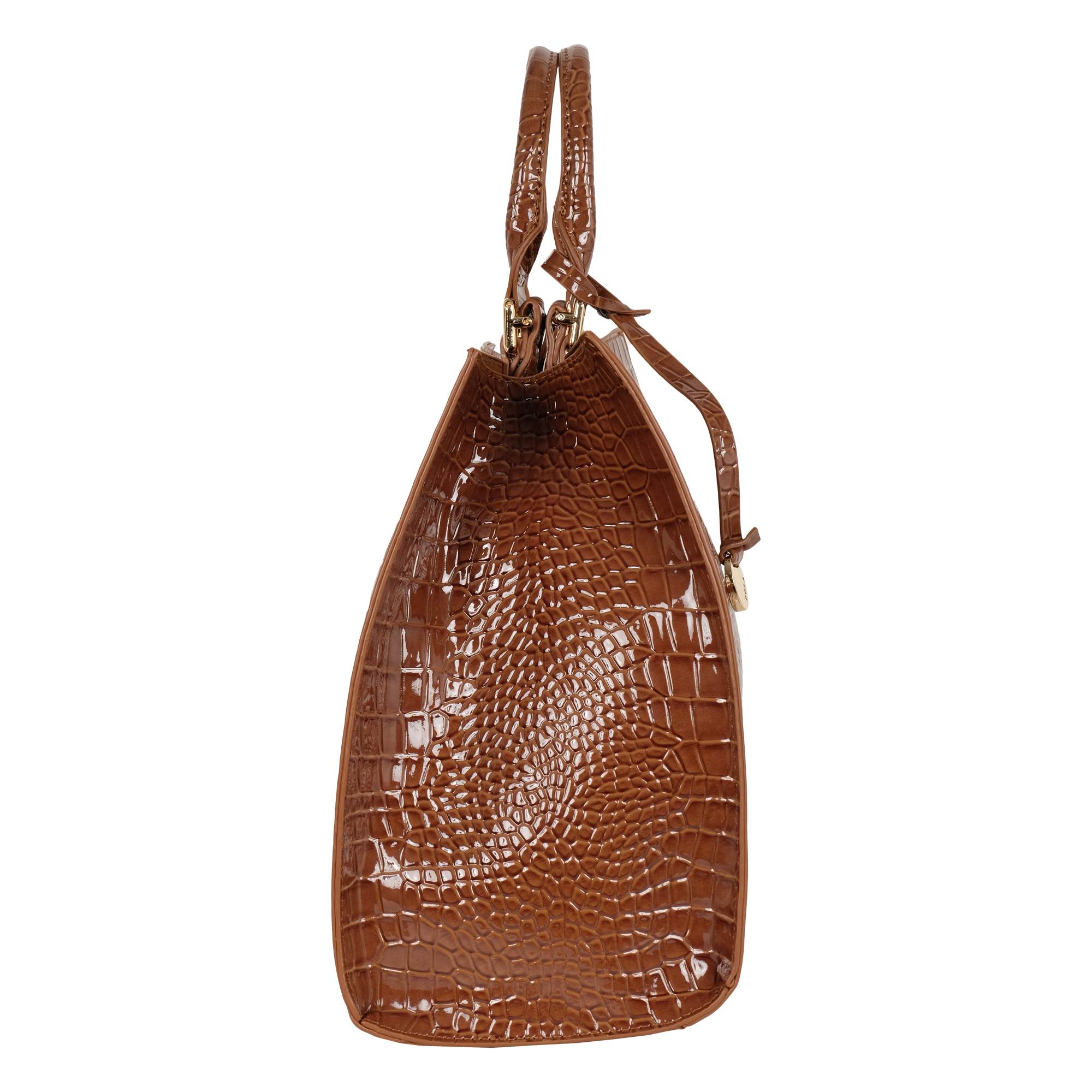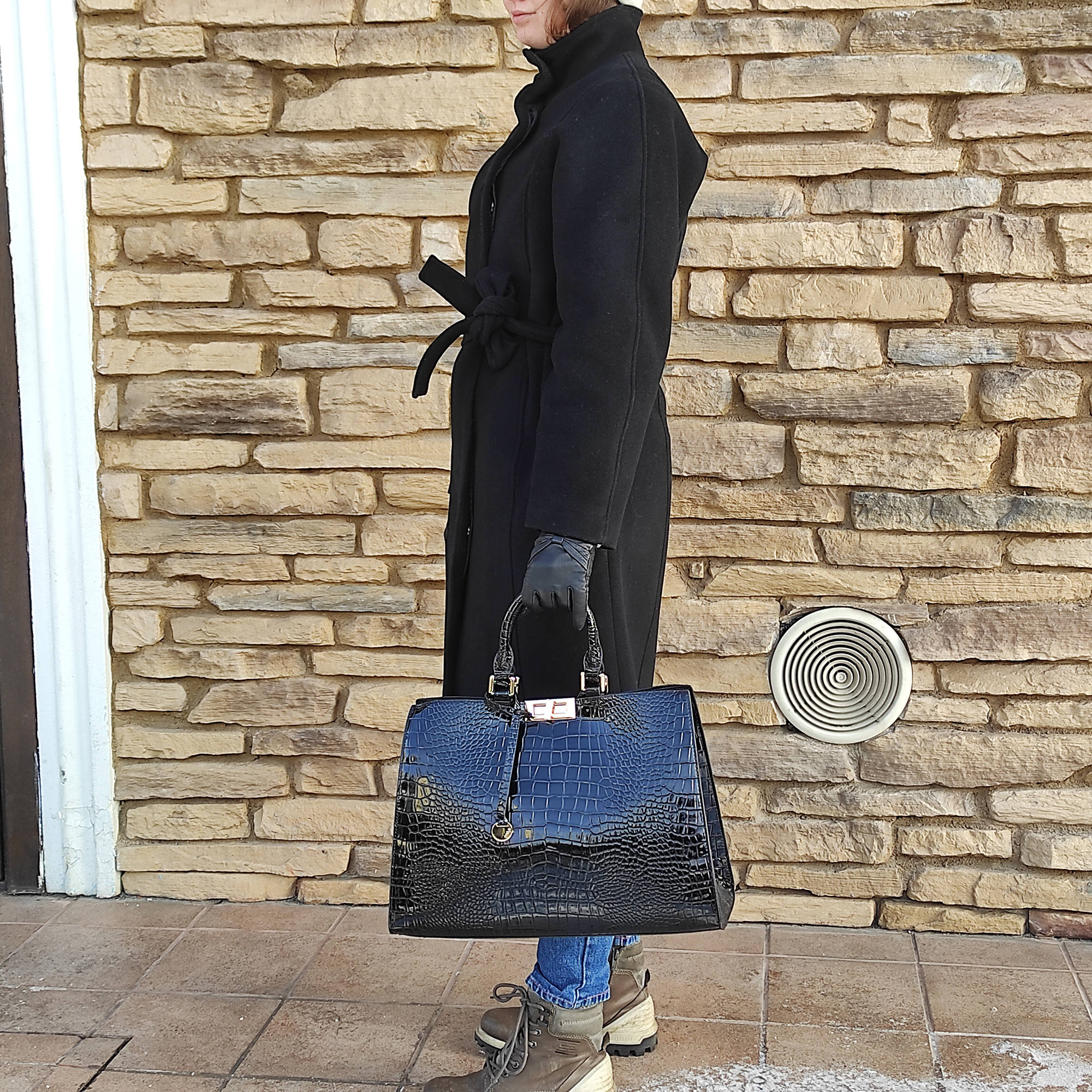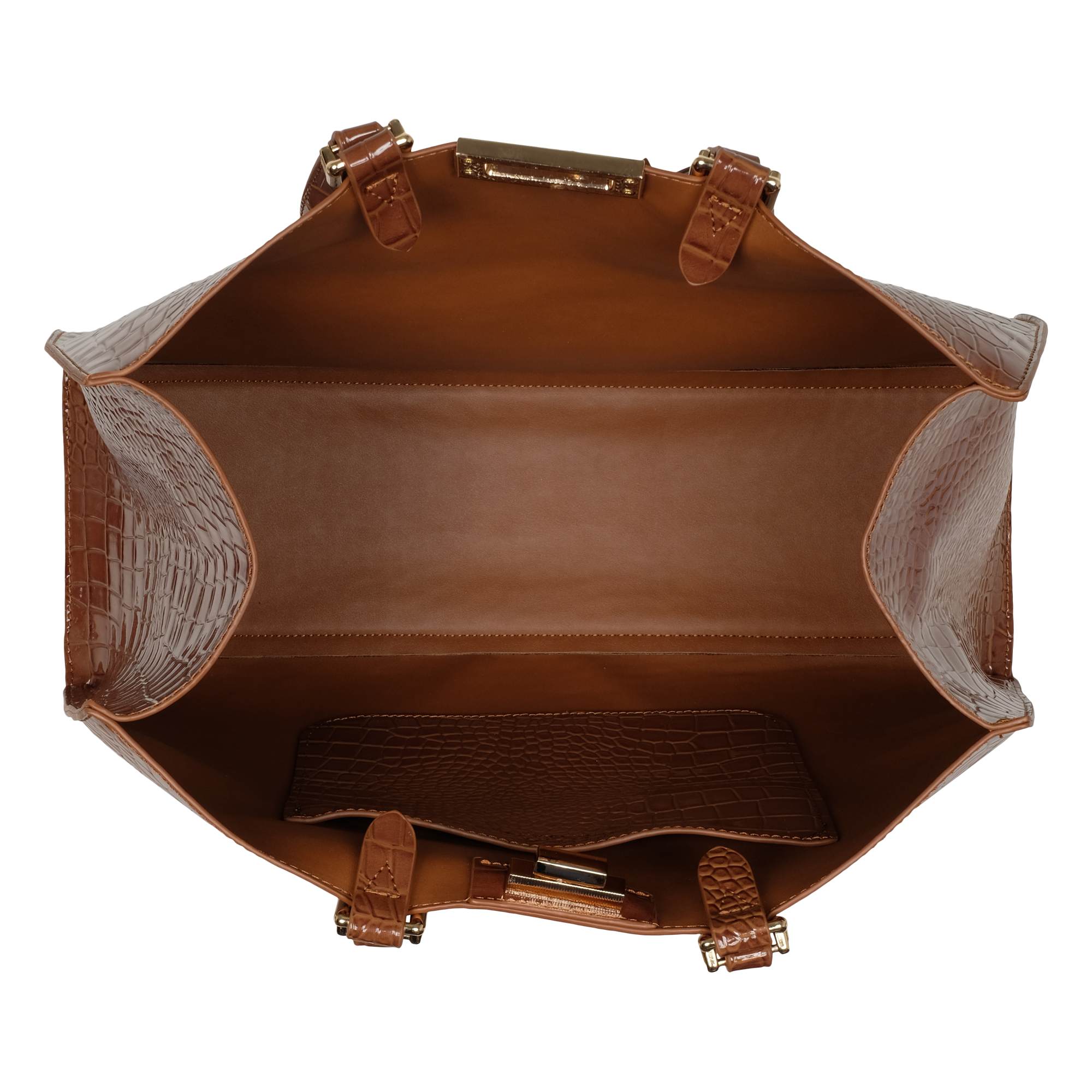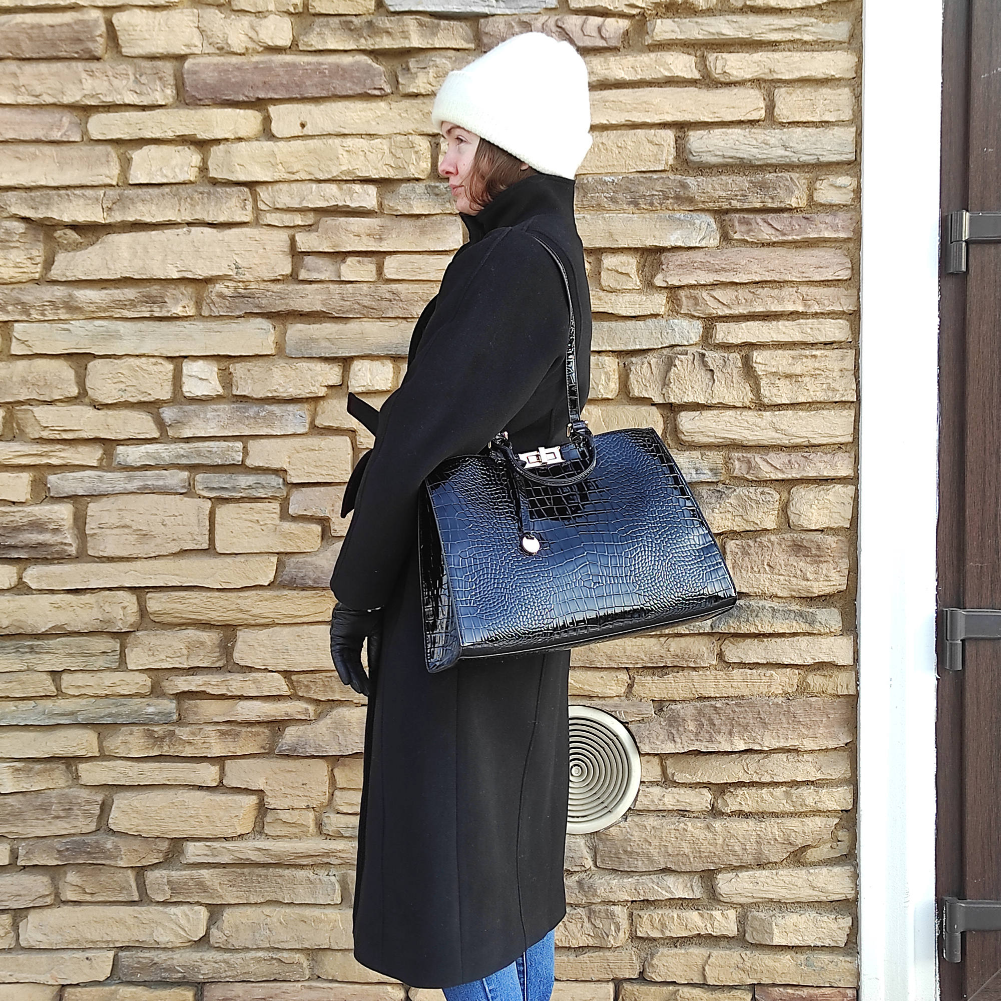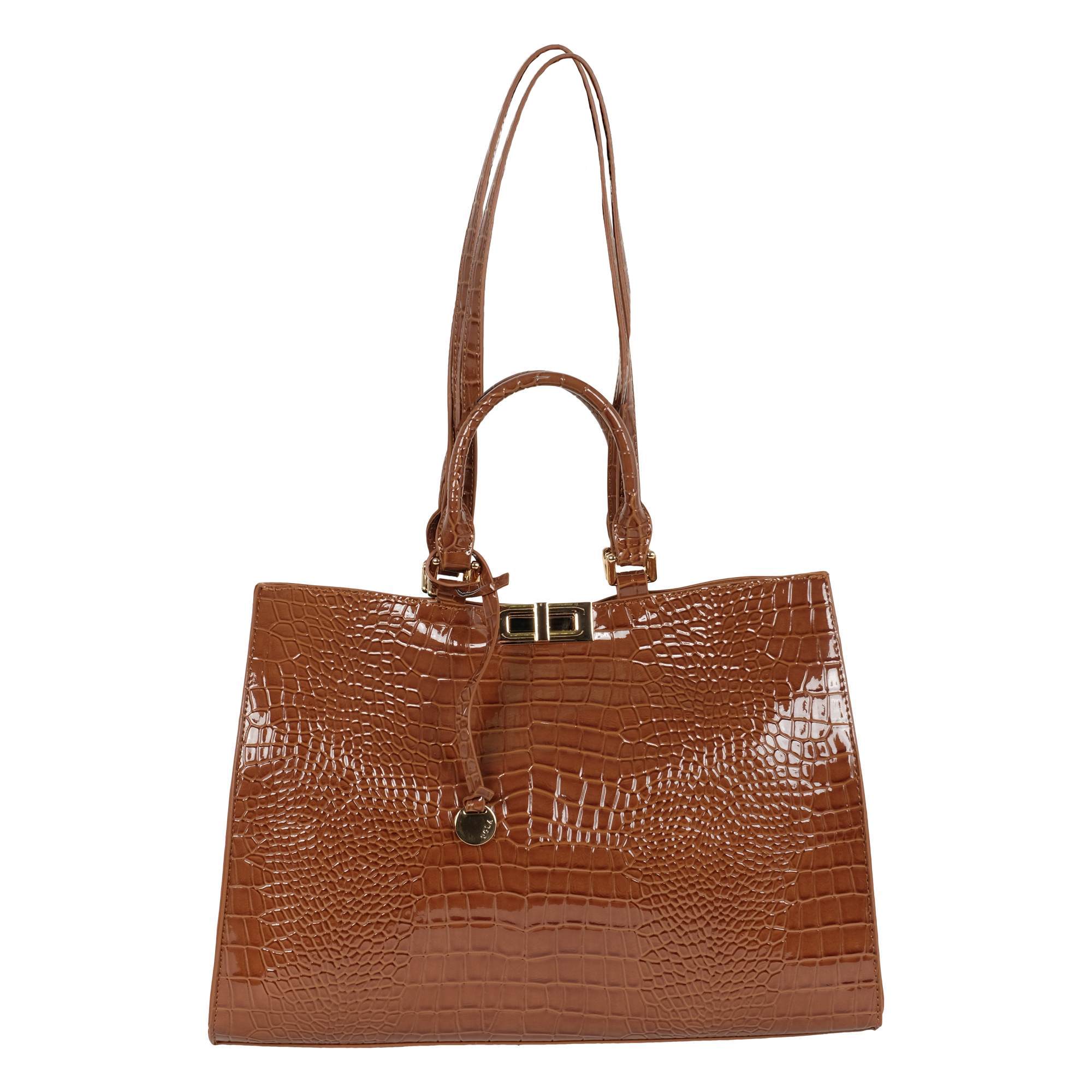 Оригинальная, стильная сумка Pola выполнена из лаковой экокожи с имитацией кожи рептилии и прекрасно подходит для ежедневного использования модницами любого возраста. Данная модель закрывается металлическим поворотный замком. Одно основное отделение,без подкладки, внутри один открытый кармашек. Сумка хорошо держит форму, поэтому документы А4 не помнутся У сумки четыре несъемных ручки, две коротких высота 15 см и две длинных высота 33 см. Цвет фурнитуры-золото.