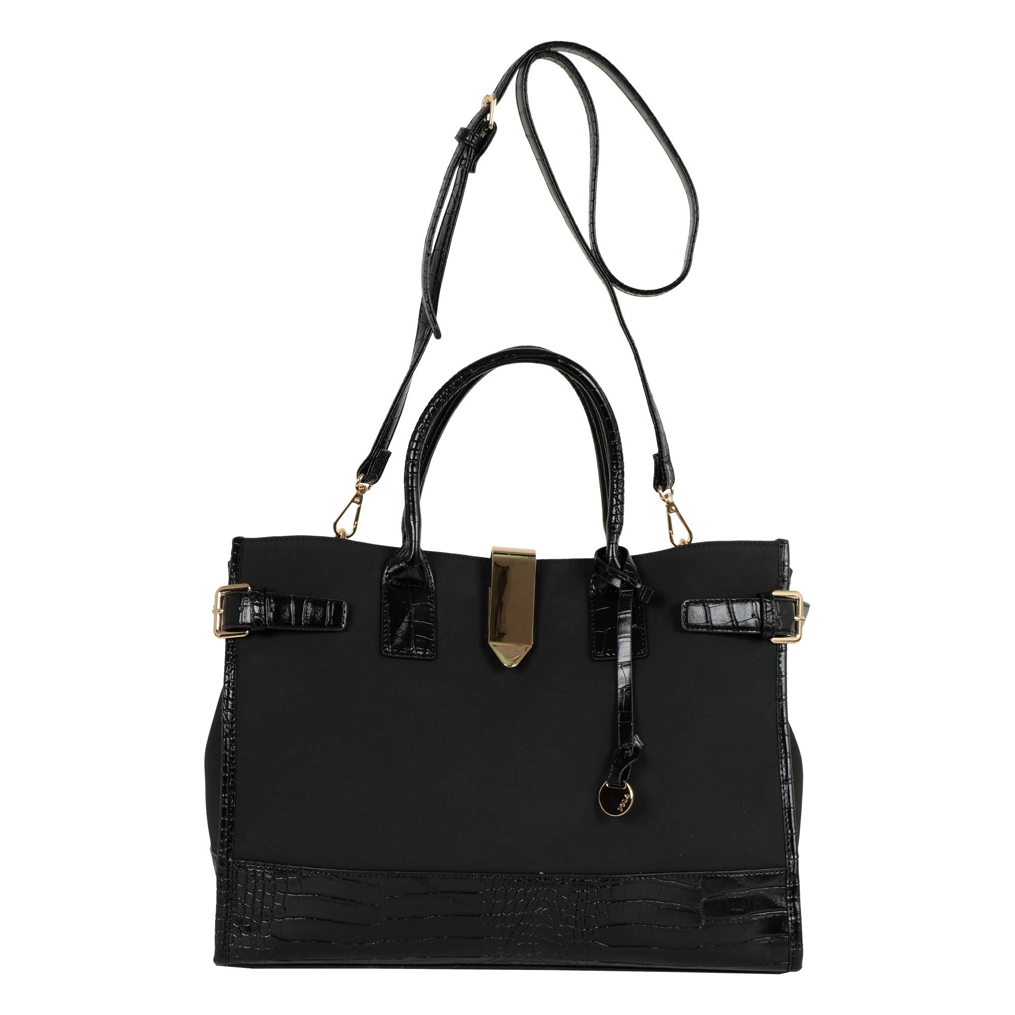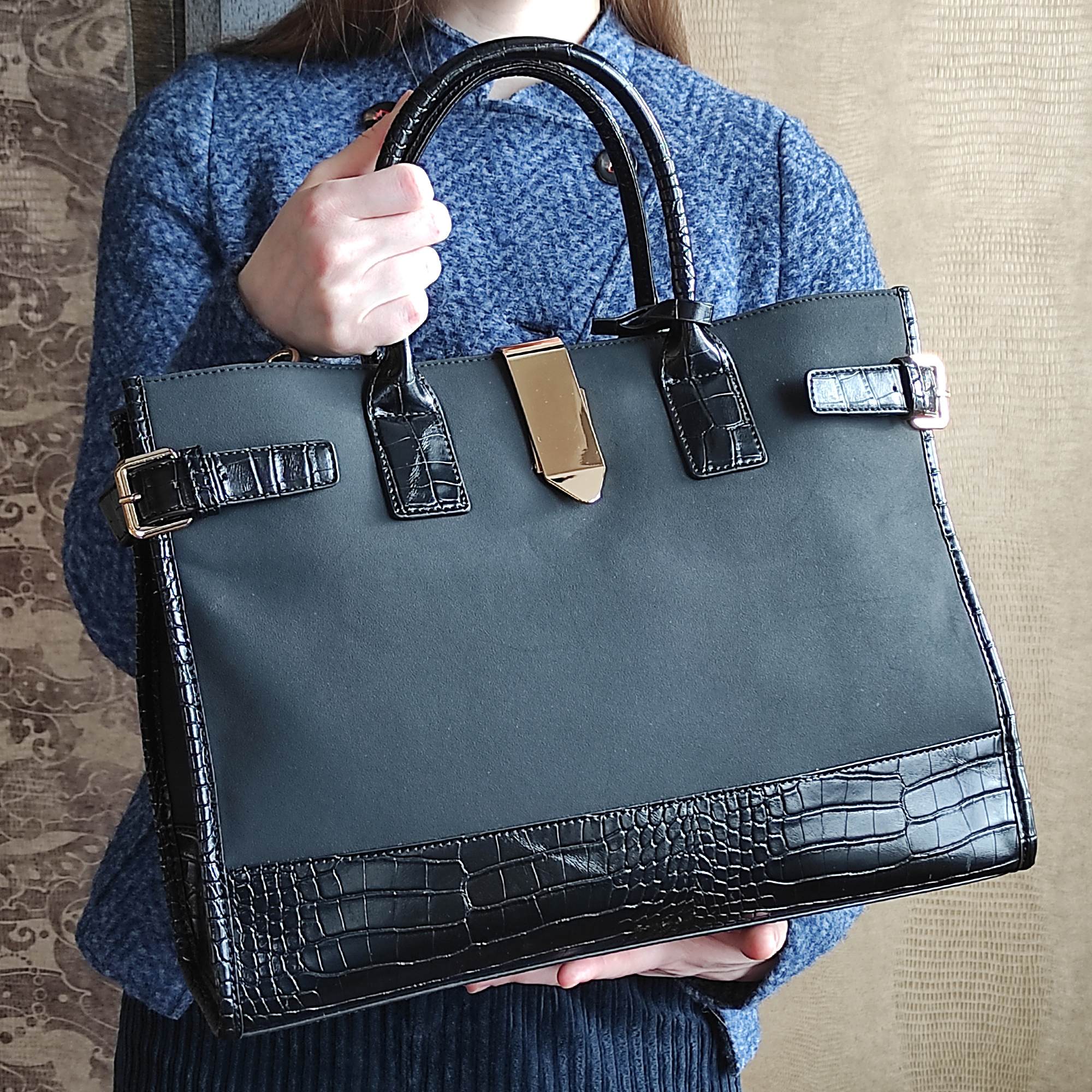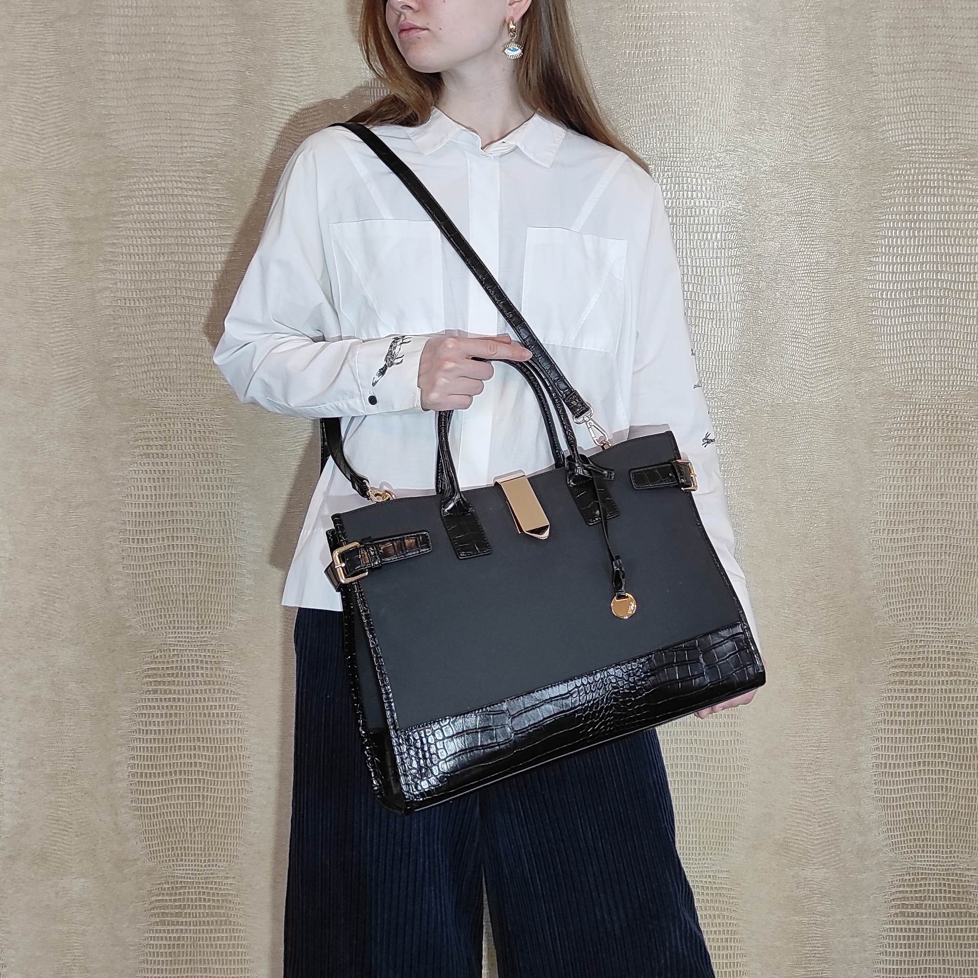 Стильная классическая сумка фирмы Pola выполнена из экокожи с выделкой под нубук предназначена для повседневного использования. Черный цвет модели поддержит любой образ. Сумка хорошо держит форму, поэтому документы А4 не помнутся. Закрывается основное отделение на металлическую защелку и молнию. Внутри два кармана на молнии и два небольших открытых кармашка. Высота ручек 14 см и тонкий, съемный, регулируемый ремешок, длина которого 120 см. Цвет фурнитуры-золото.