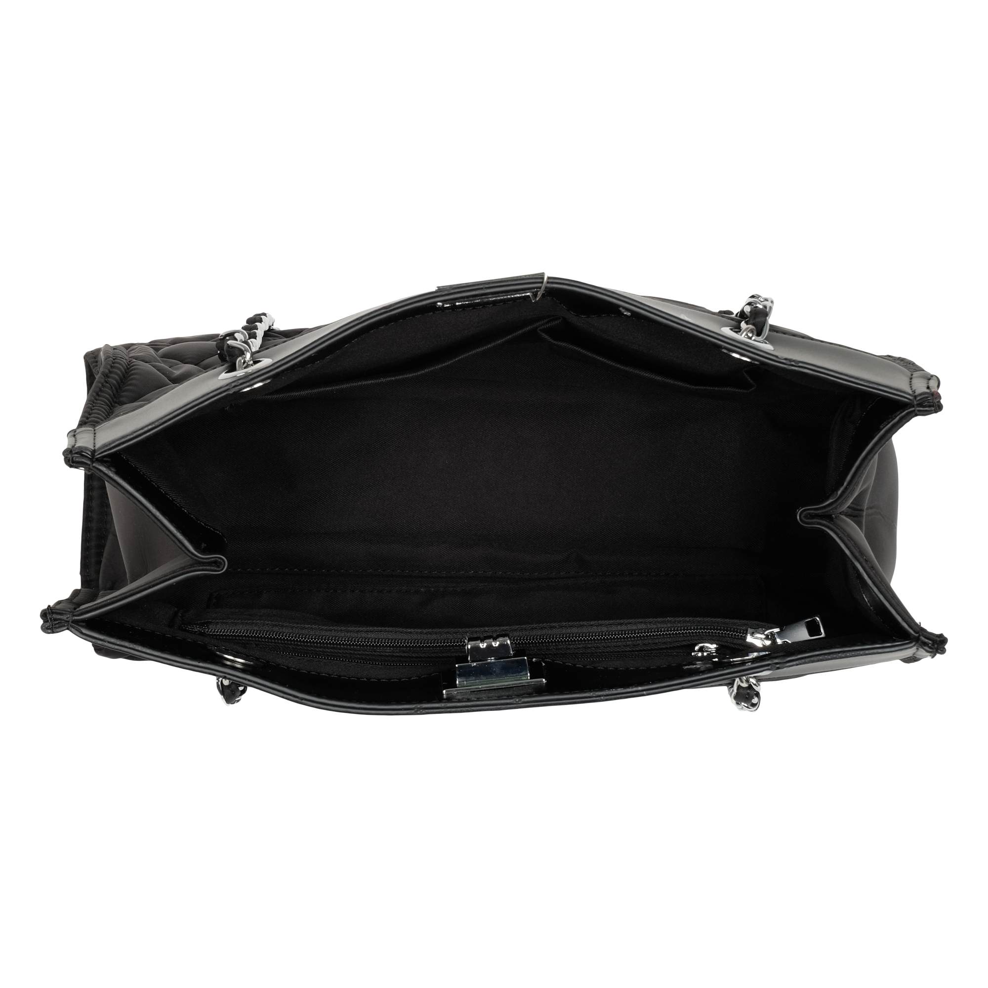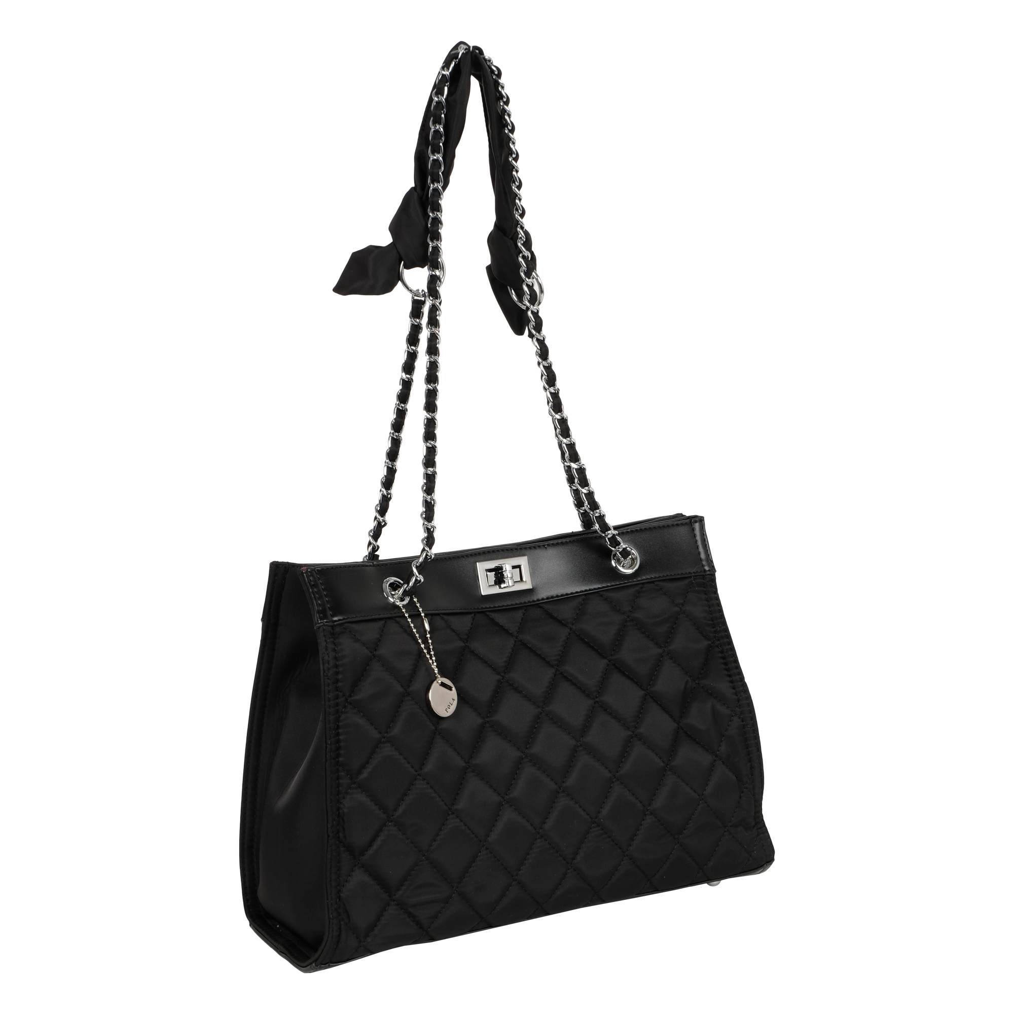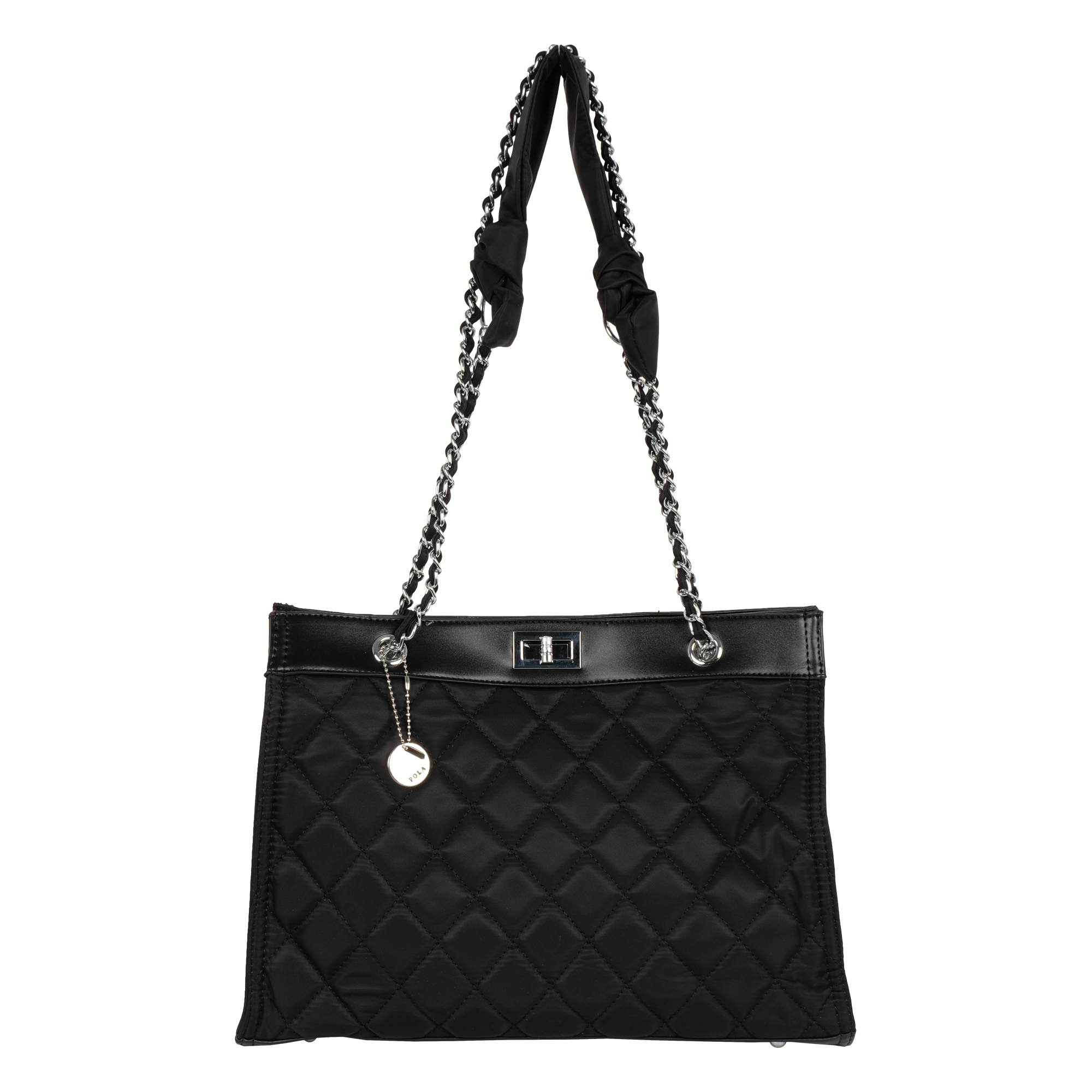 Стильная сумка фирмы Pola выполнена из плотного текстиля с водоотталкивающей пропиткой и предназначена для повседневного использования. Черный цвет модели с ручками-цепочками поддержит любой образ, а стеганый узор будет выглядеть гармонично. Закрывается основное отделение на поворотный замок. Внутри два кармана на молнии и три небольших открытых кармашка. На дне сумки металлические ножки. Высота цепочки 32 см. Цвет фурнитуры-серебро.