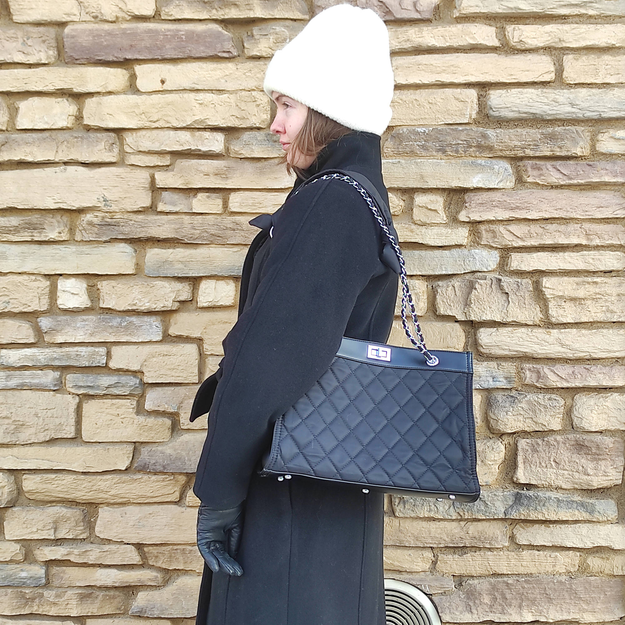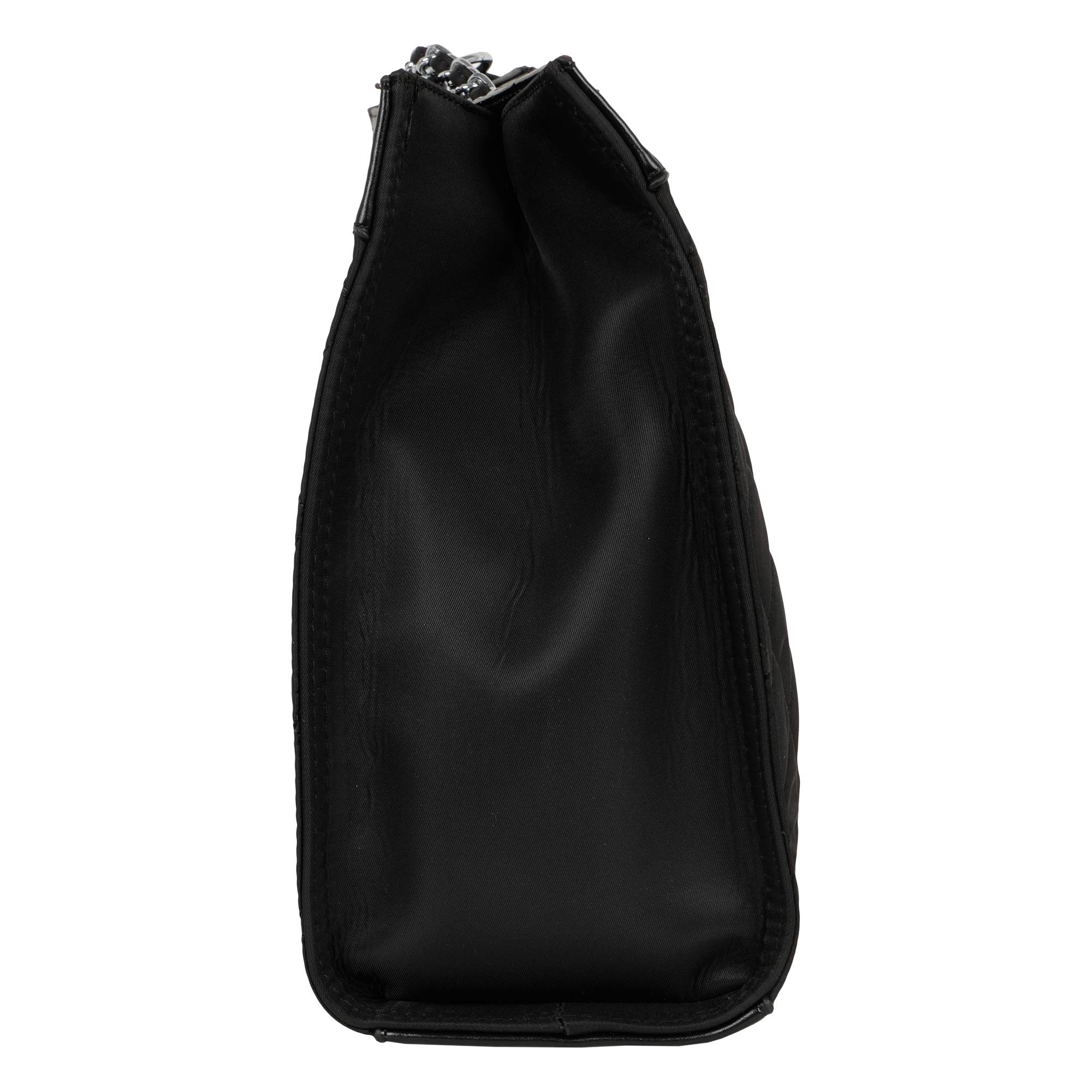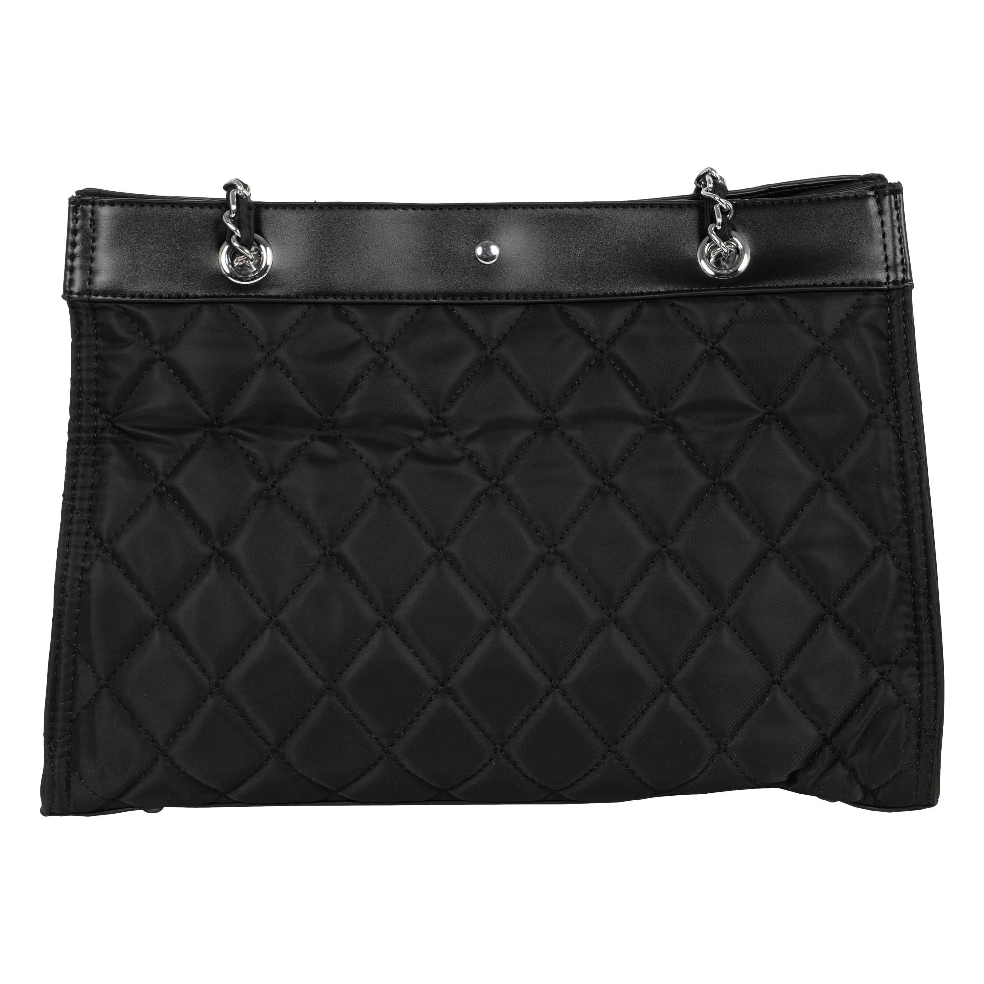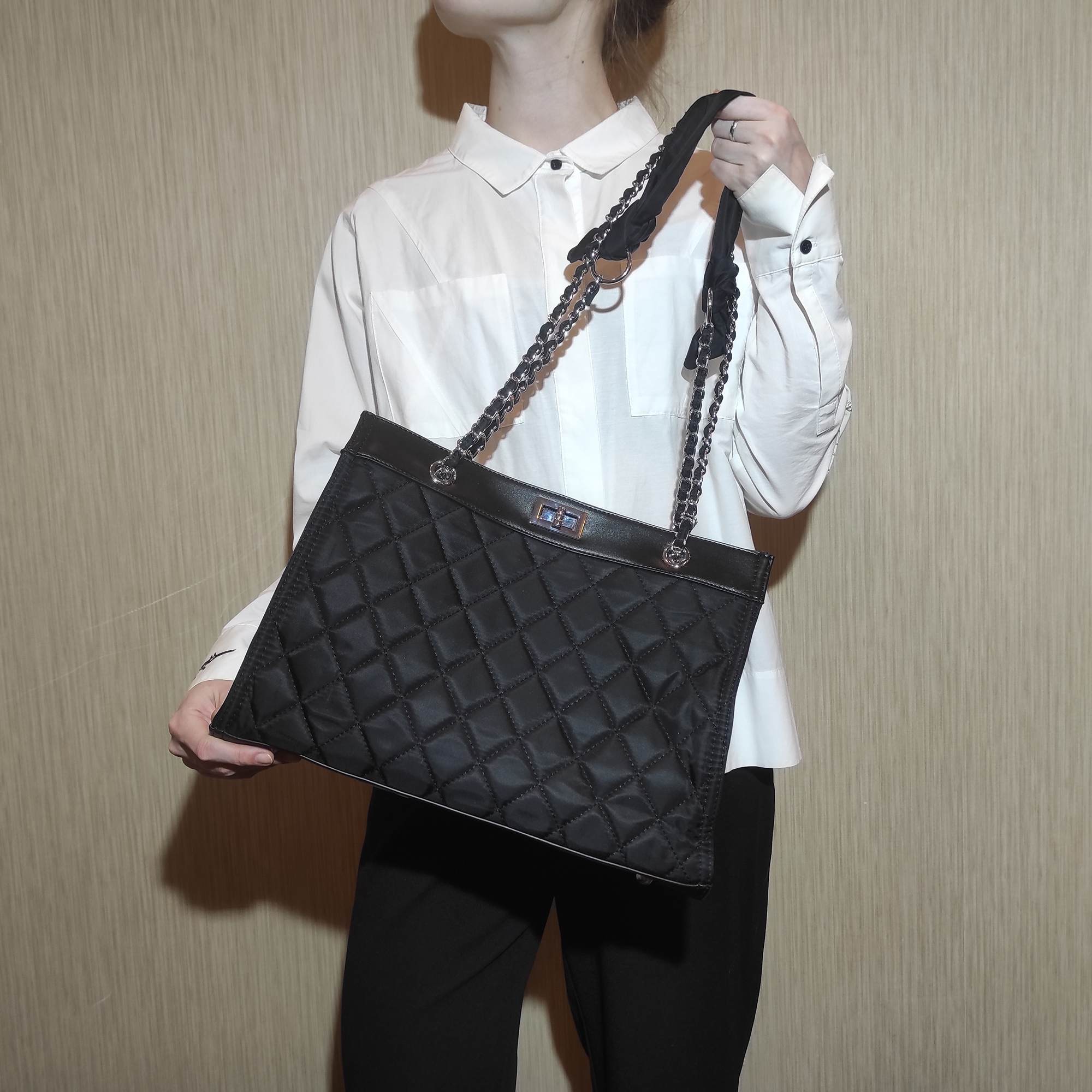 Стильная сумка фирмы Pola выполнена из плотного текстиля с водоотталкивающей пропиткой и предназначена для повседневного использования. Черный цвет модели с ручками-цепочками поддержит любой образ, а стеганый узор будет выглядеть гармонично. Закрывается основное отделение на поворотный замок. Внутри два кармана на молнии и три небольших открытых кармашка. На дне сумки металлические ножки. Высота цепочки 32 см. Цвет фурнитуры-серебро.